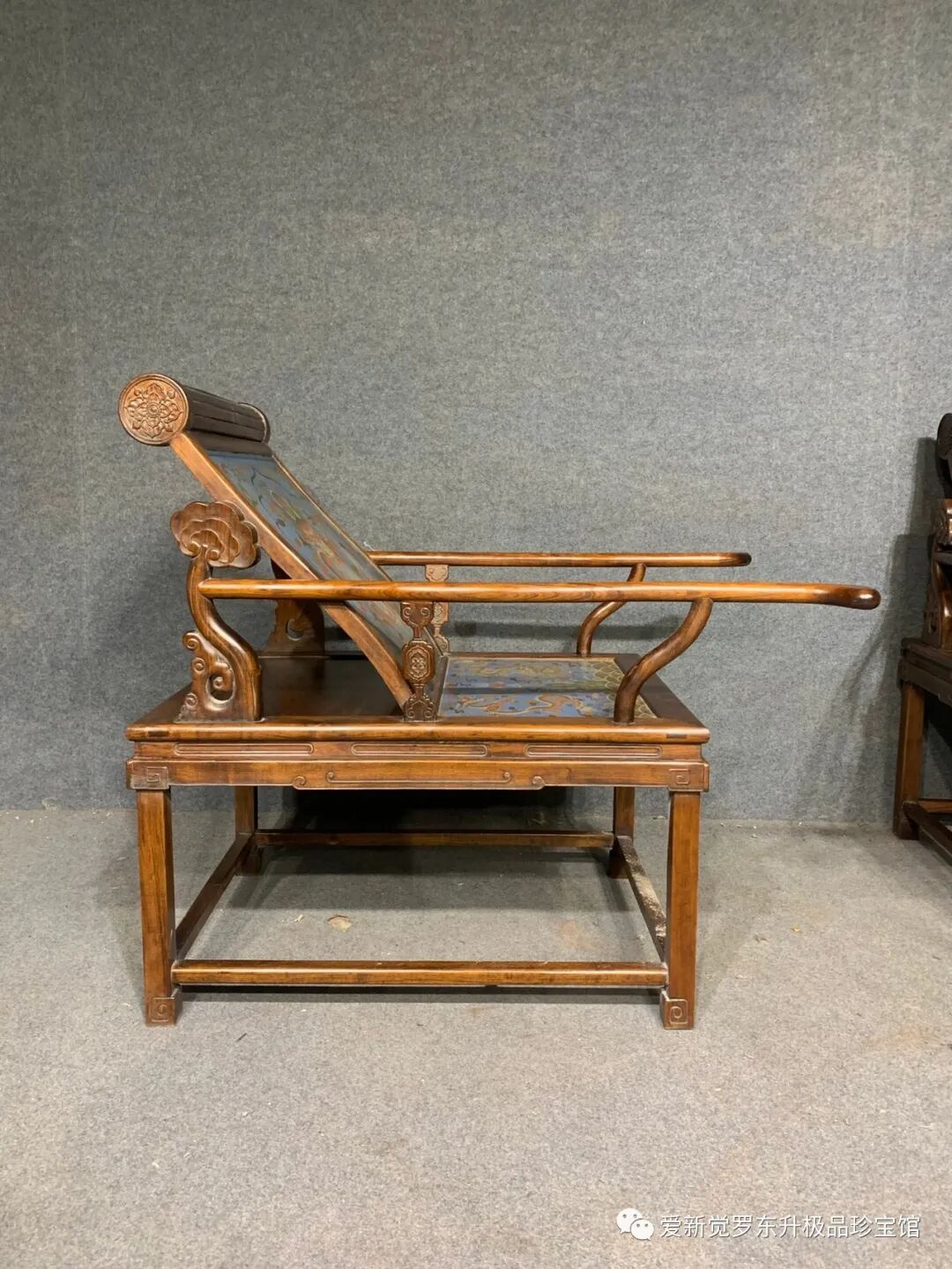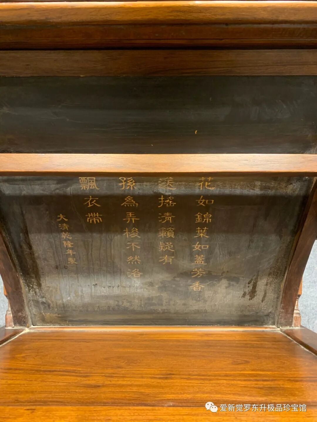 黄花梨躺椅,嵌雕填工艺精湛,造型独特美观,纹理清晰漂亮,此椅子后背底部乾隆御题诗,包浆醇厚自然,尺寸长90宽70高100