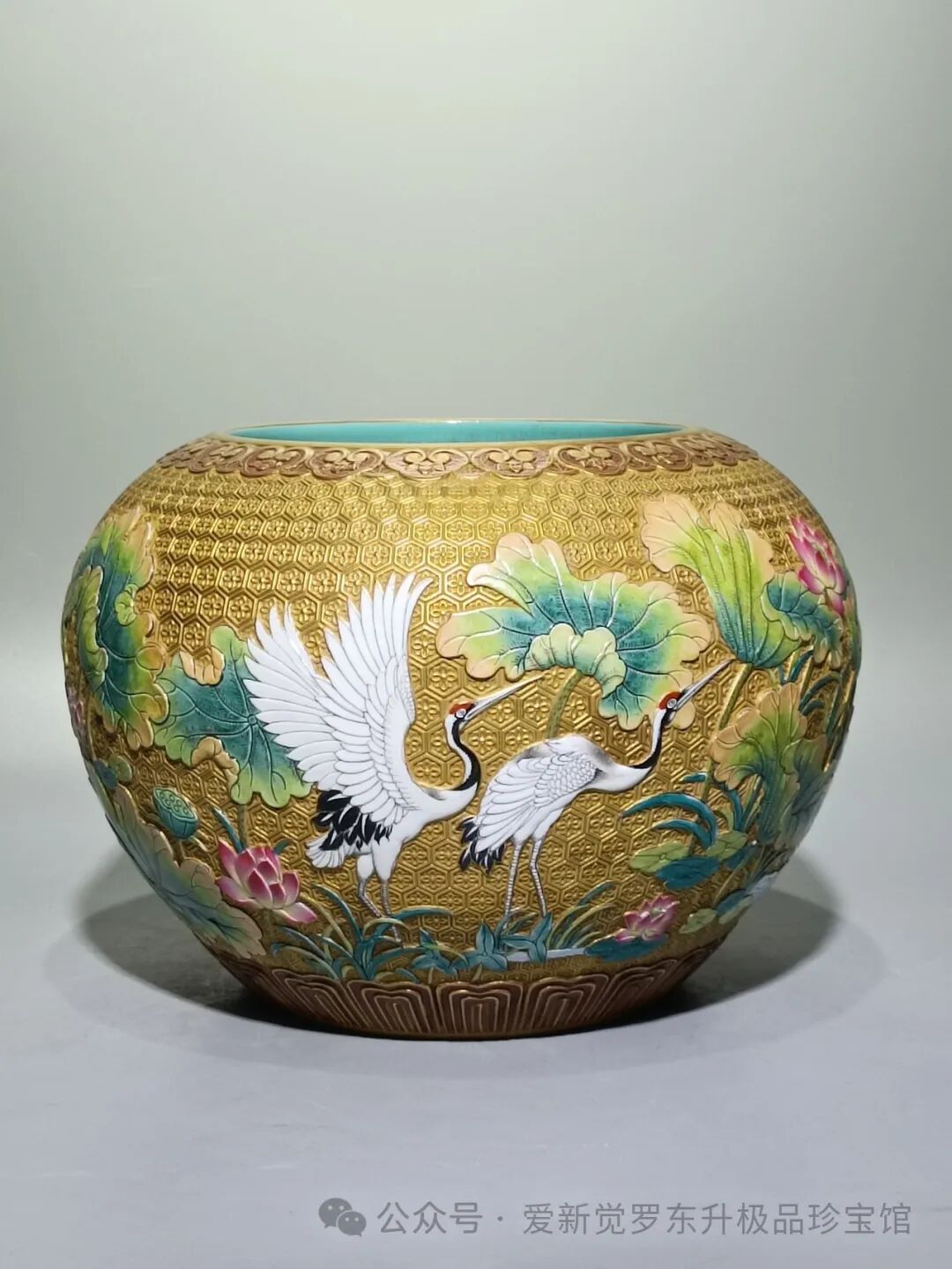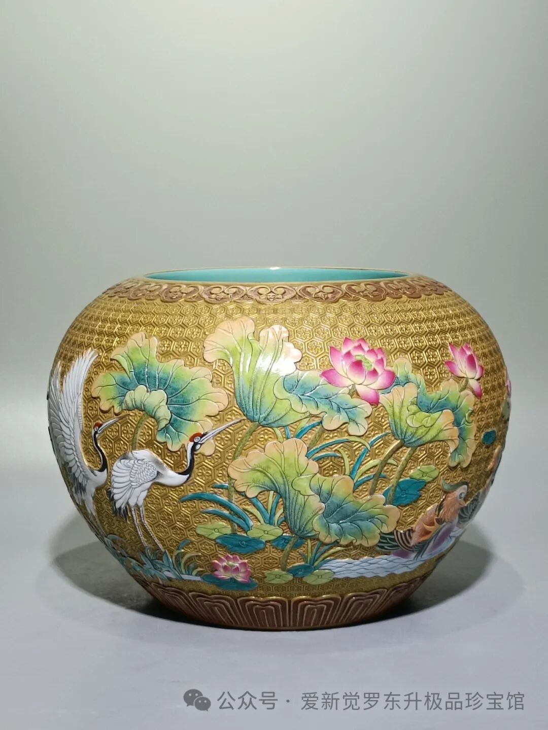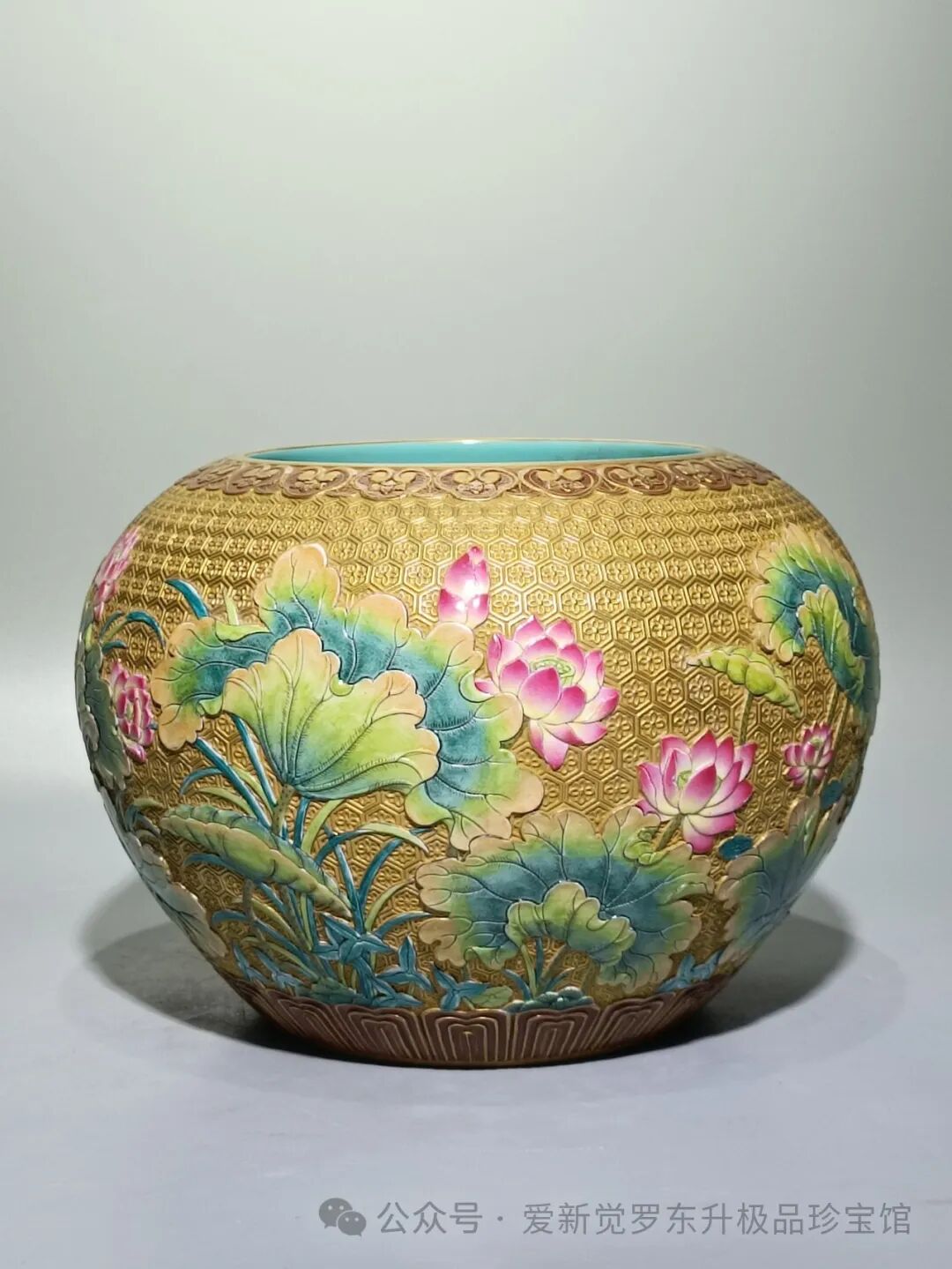 清乾隆款,珐琅彩金地雕刻荷塘情趣笔洗缸 高:17cm宽:23.5cm