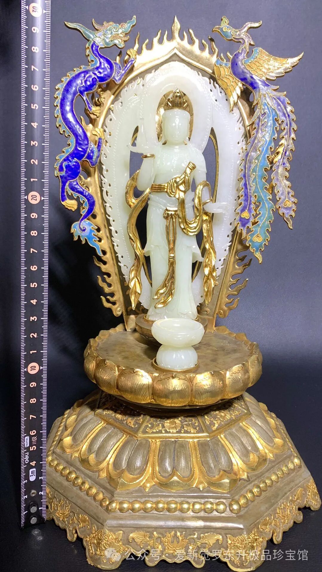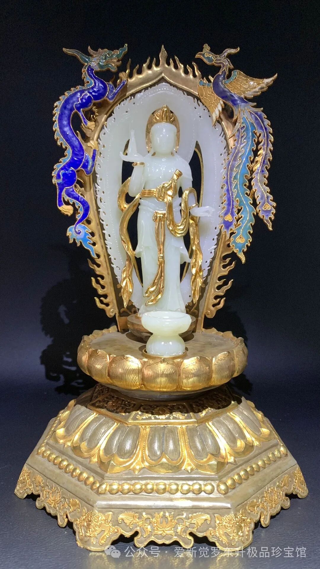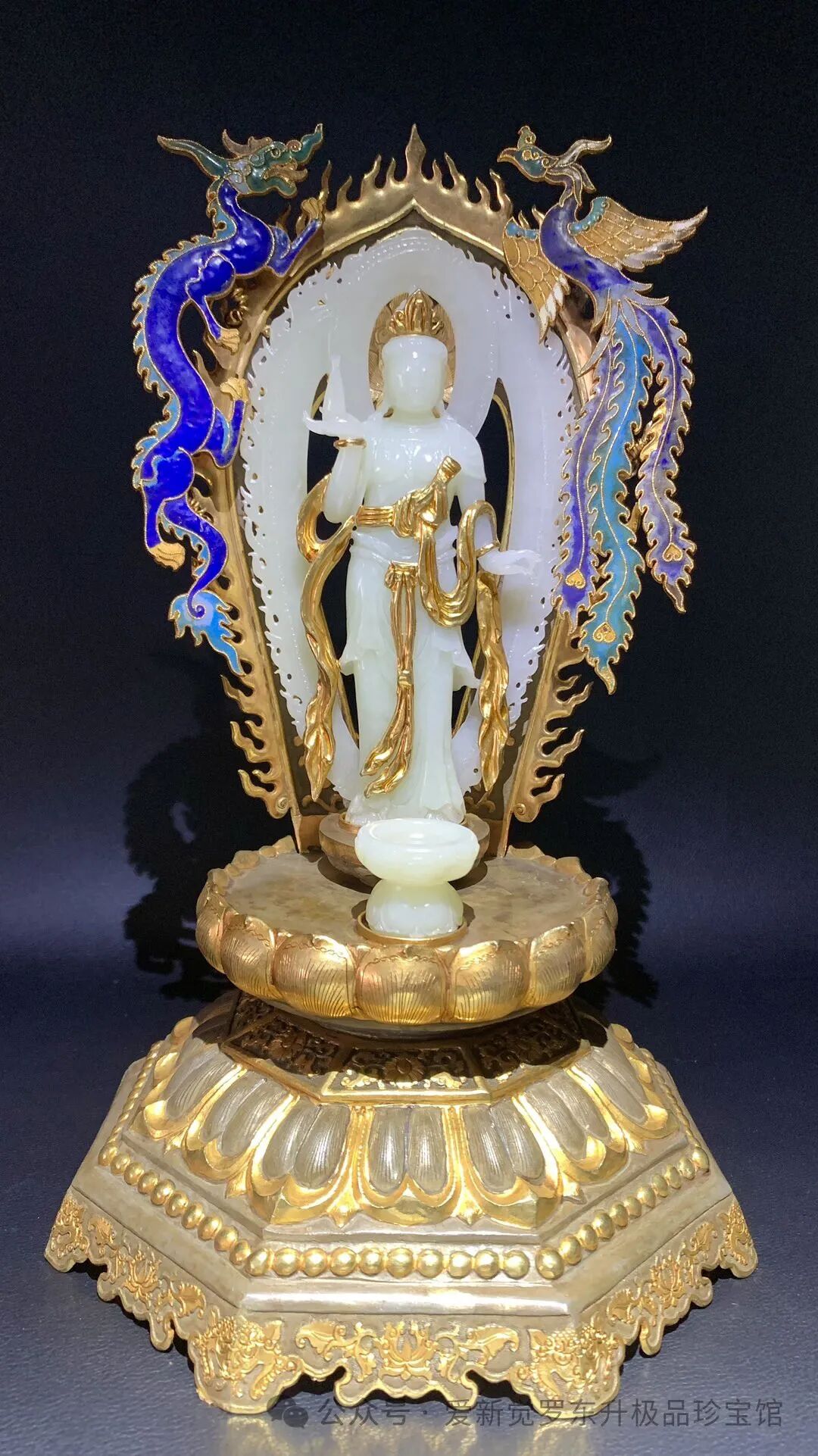 精工鎏金鎏银和田白玉【龙凤观音菩萨】高30cm 宽20cm重5.38斤一级白 可鉴定