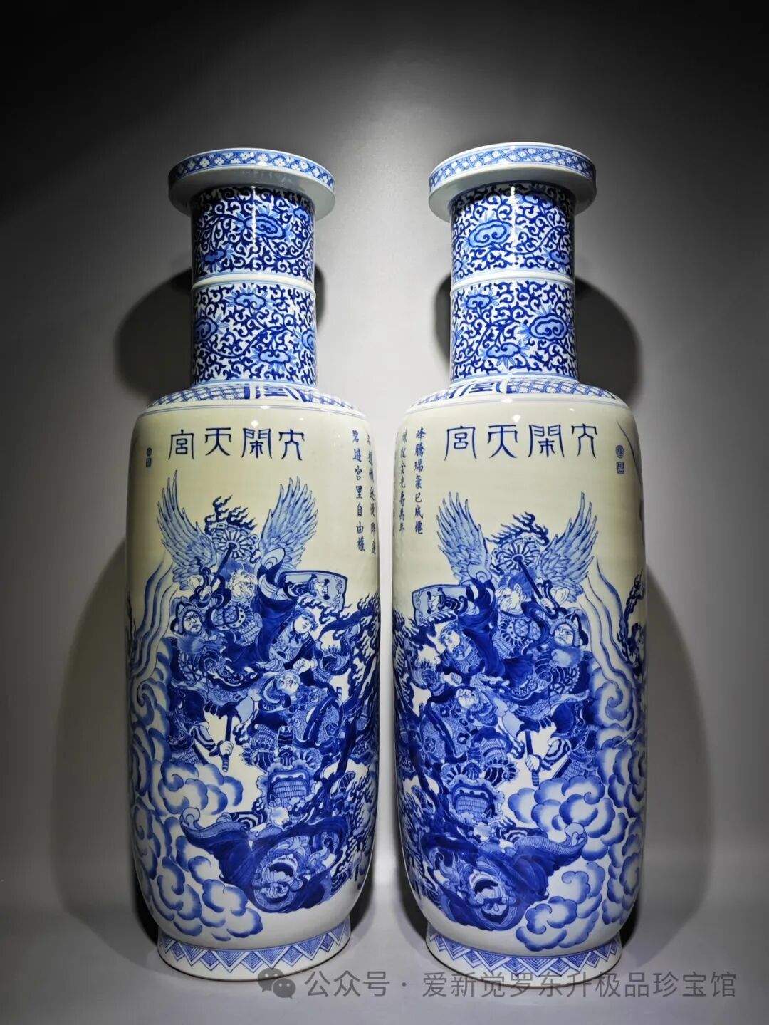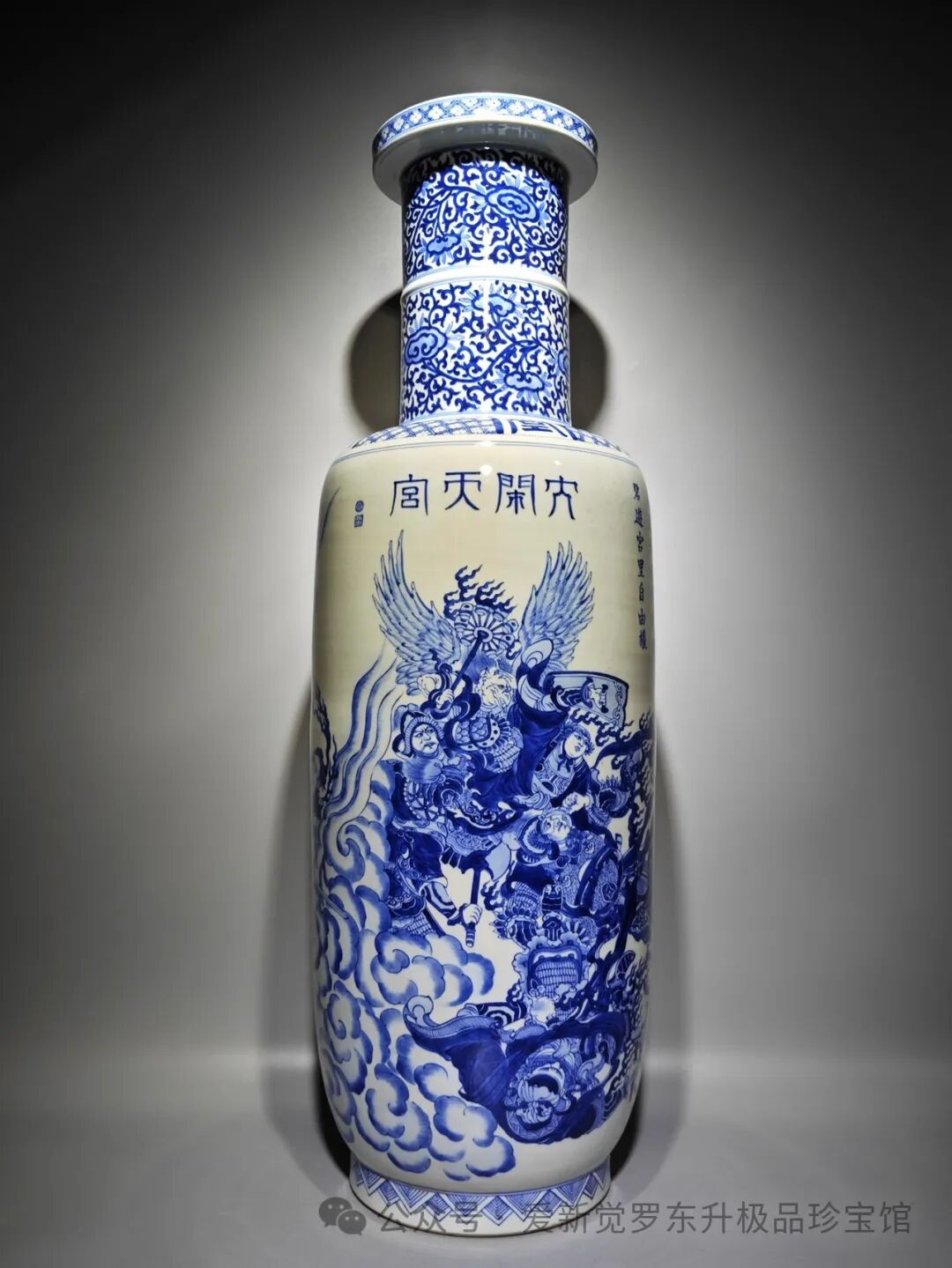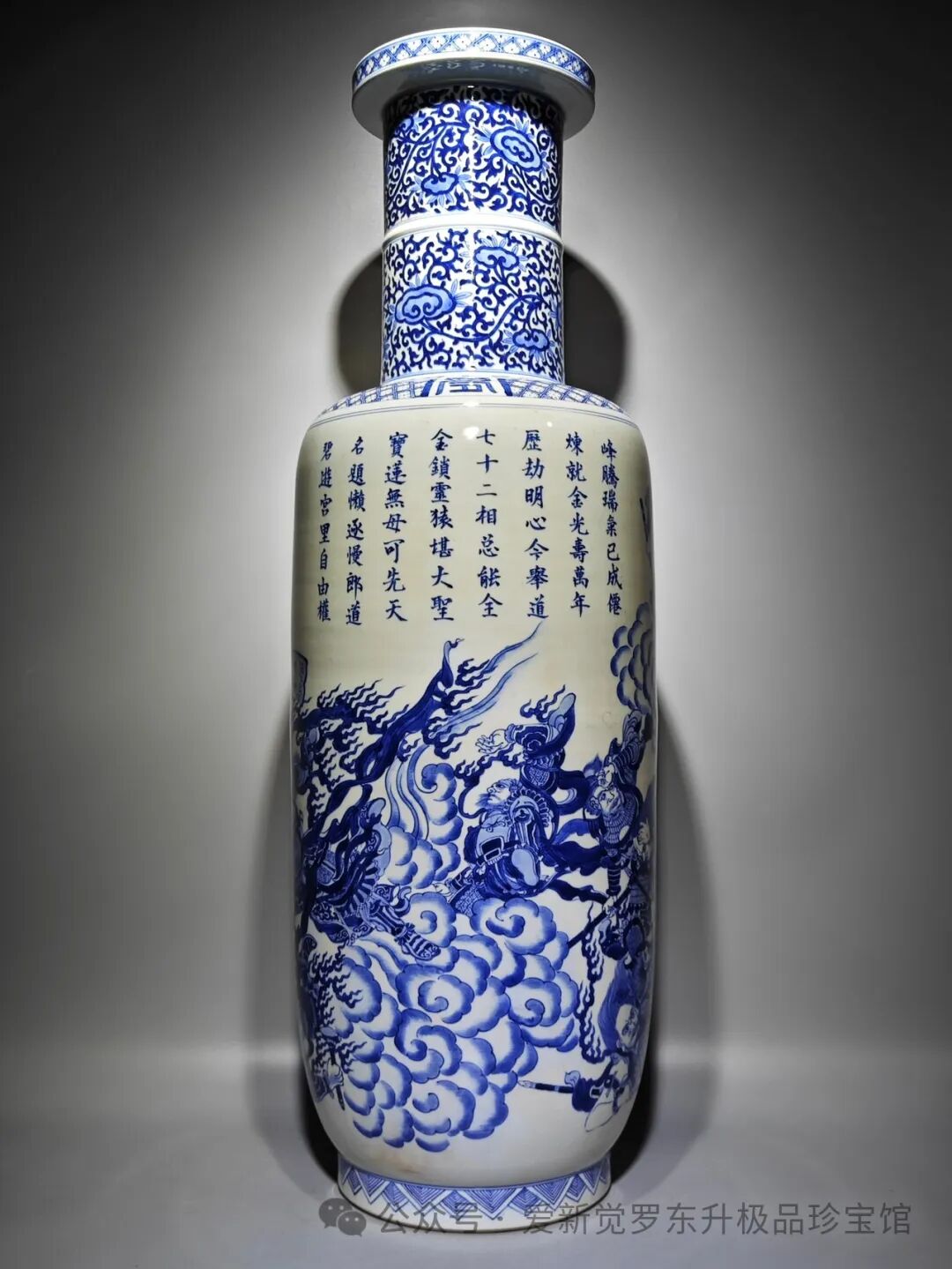 大清康熙年制,青花缠枝莲开光大闹天宫人物故事诗文棒锥瓶,高:74.3cm,肚直径:25cm