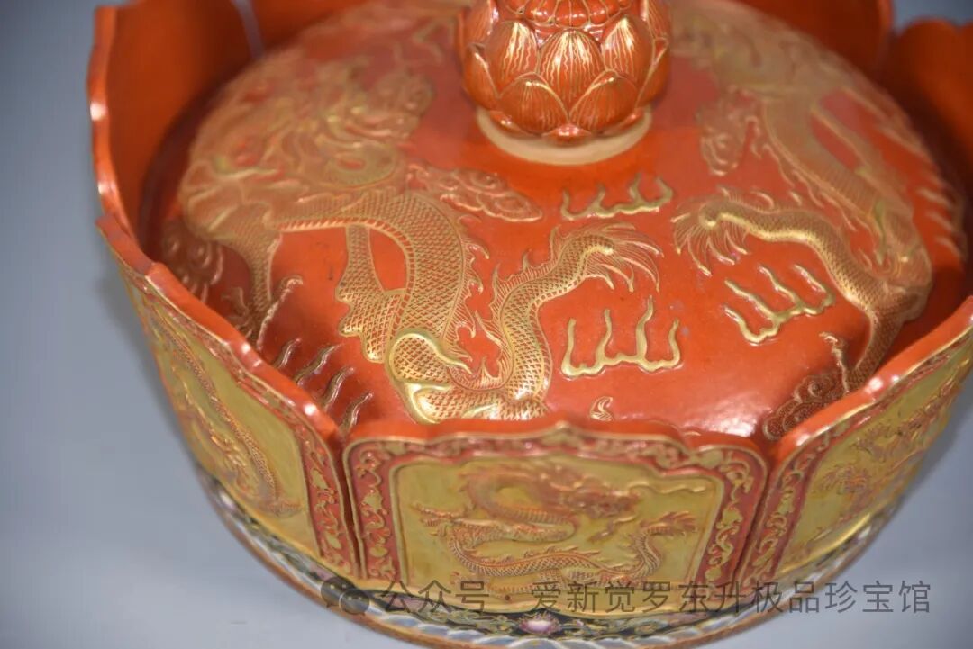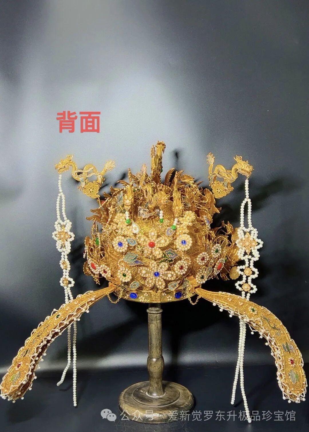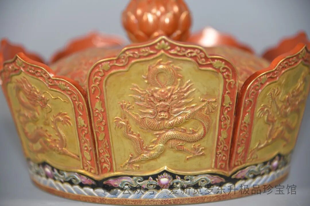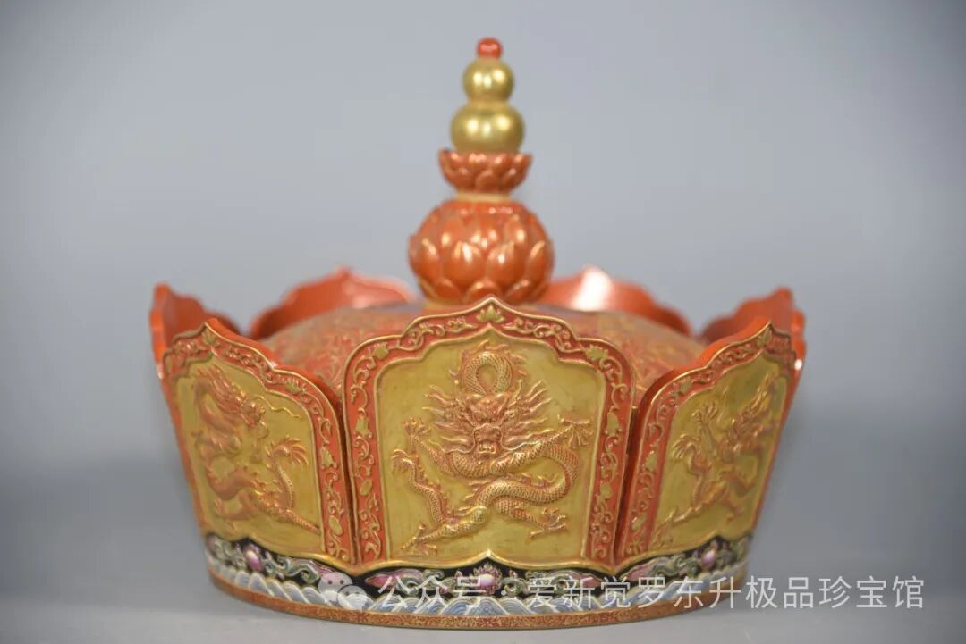 龙帽加带,霸气非凡;王者之威,威震四海;所向披靡,唯我独尊!红地描金龙纹帝王帽-高19厘米,宽23厘米