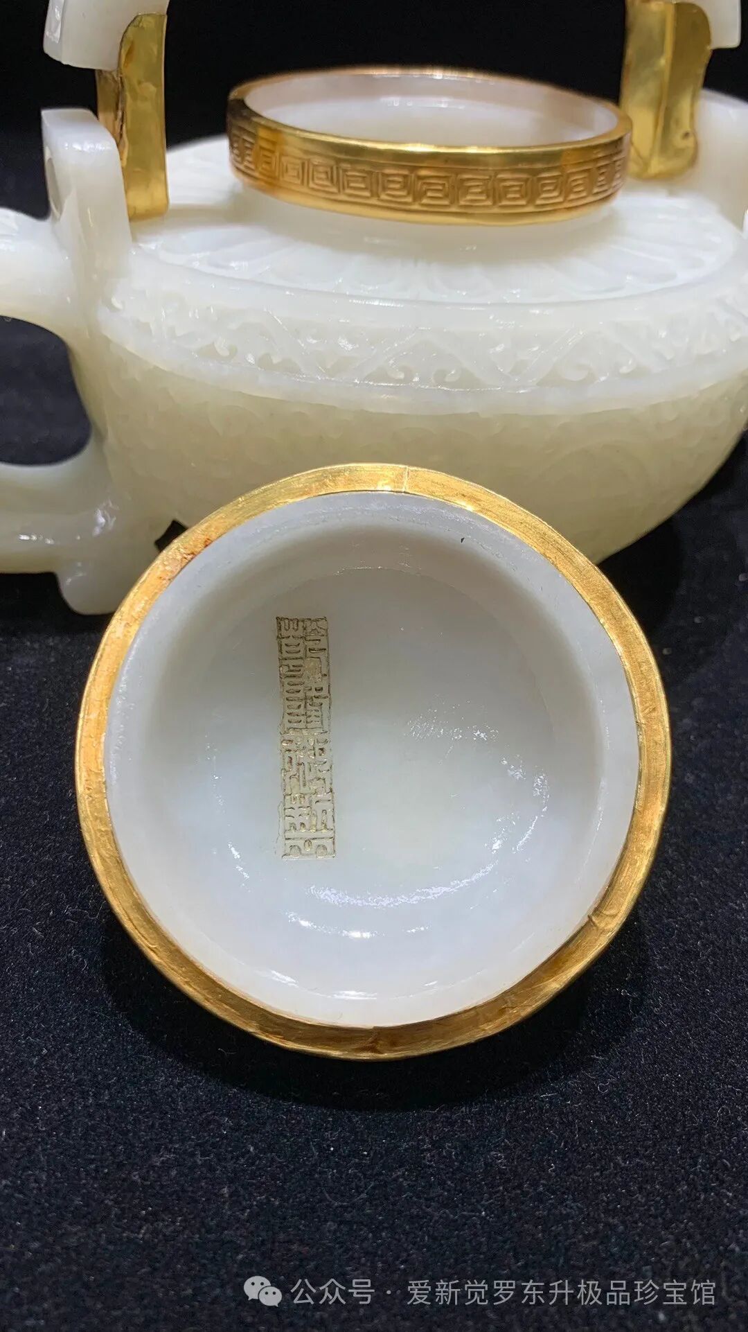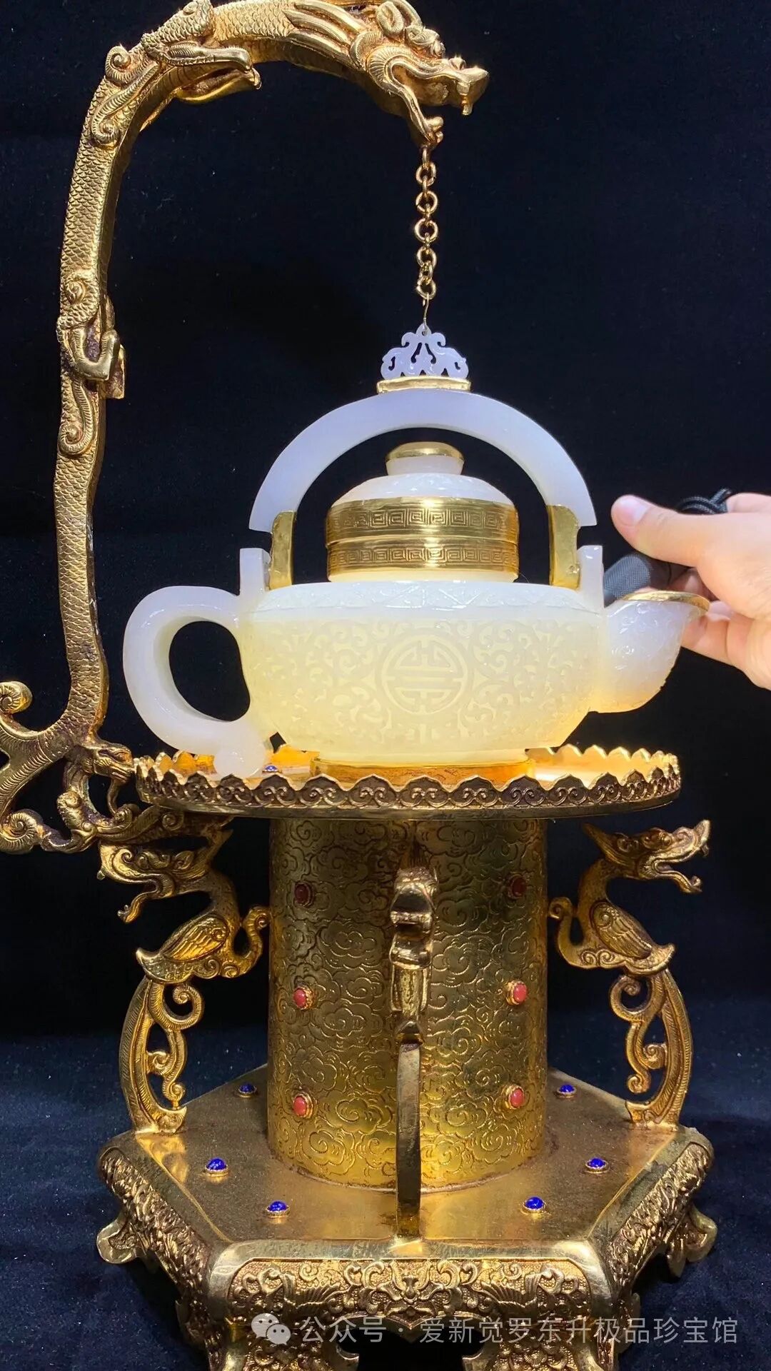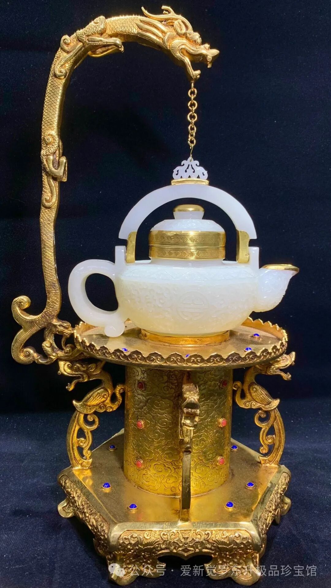 皇家:鎏金镶嵌和田白玉【提梁壶】一级白润 完美 可鉴定整体高48cm 宽30cm壶净宽23cm 高17cm总重10.9斤壶重3.1斤