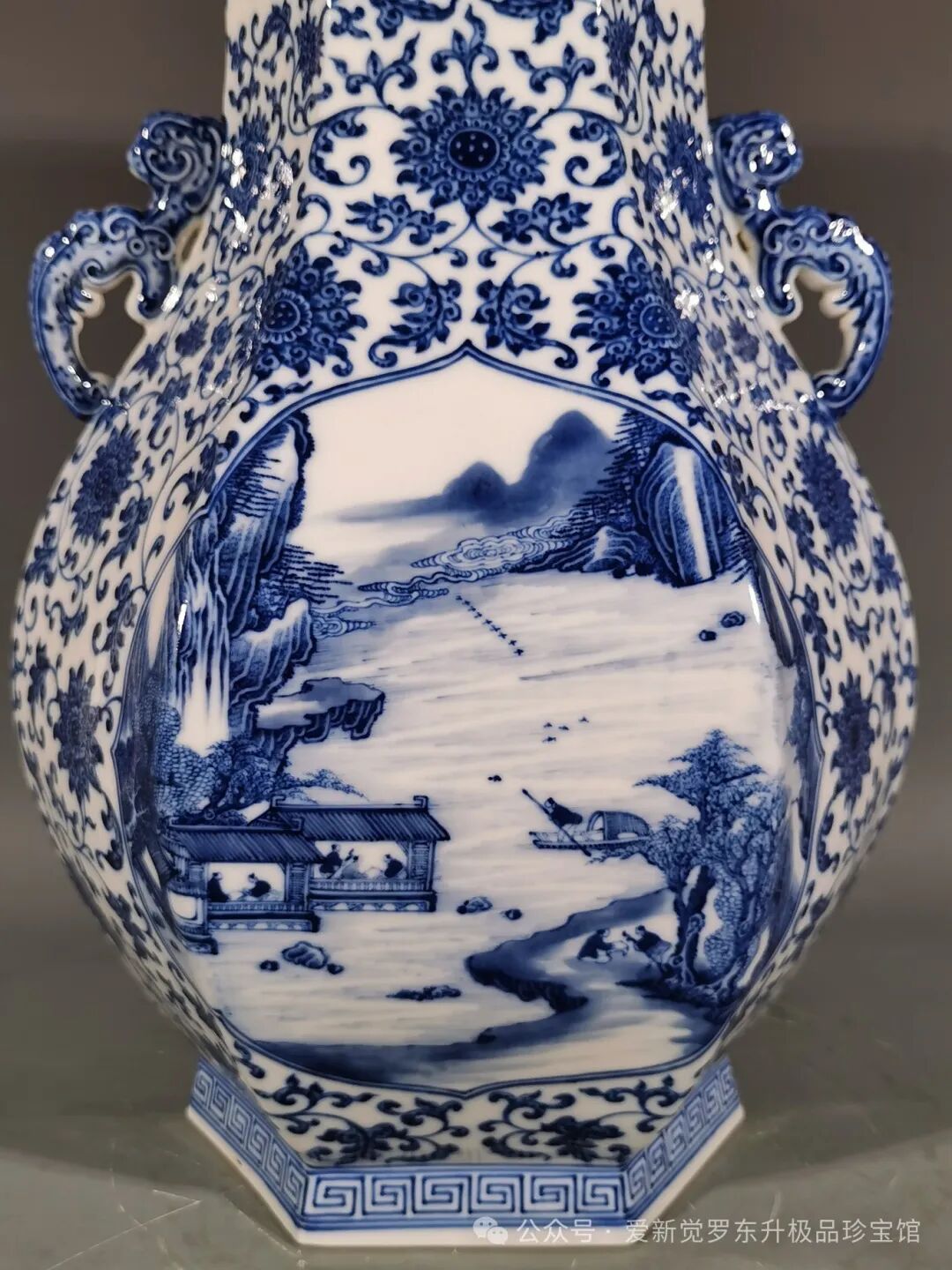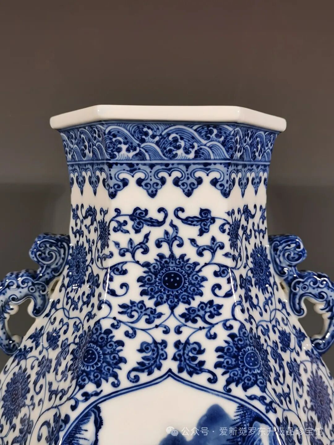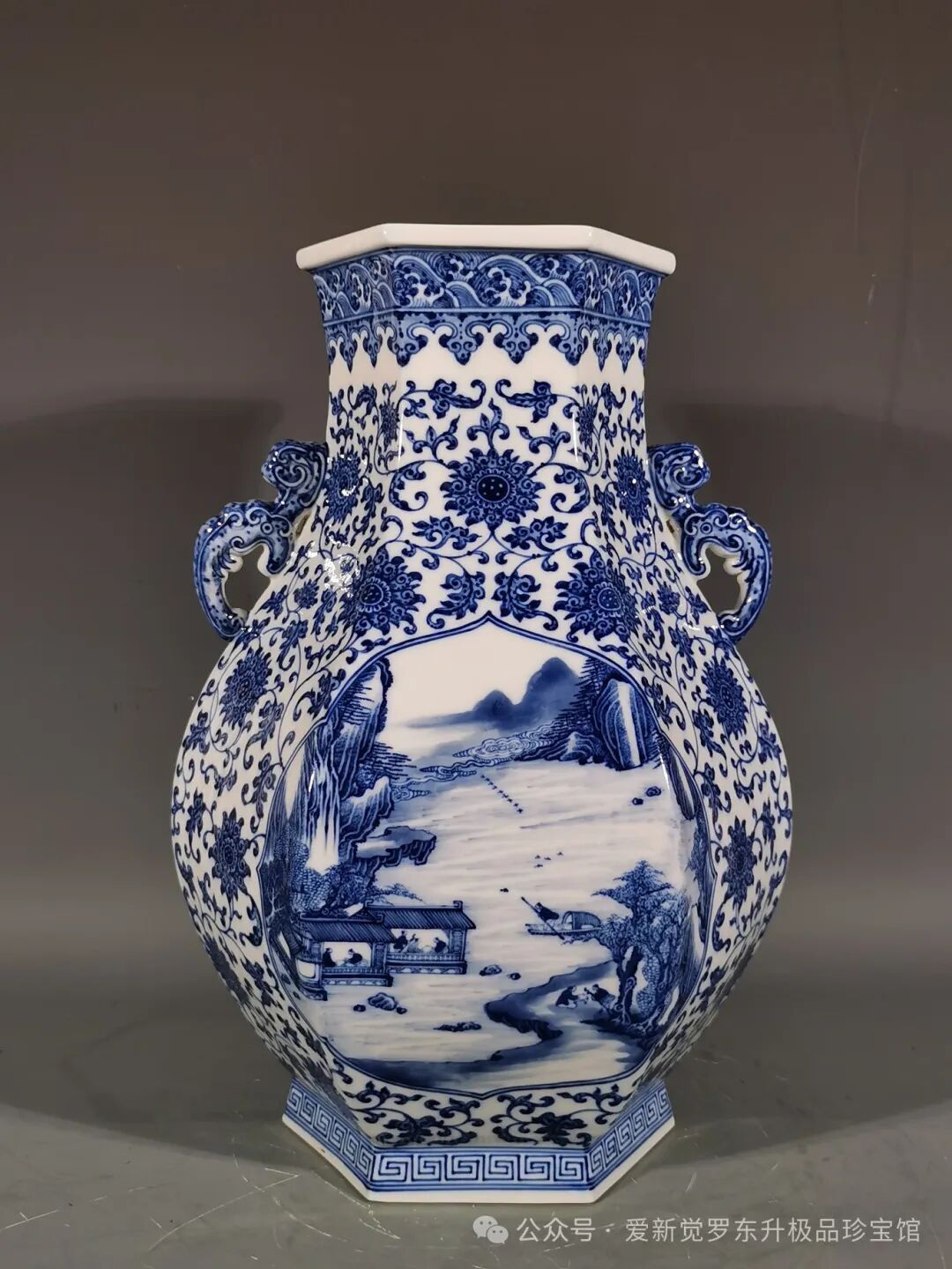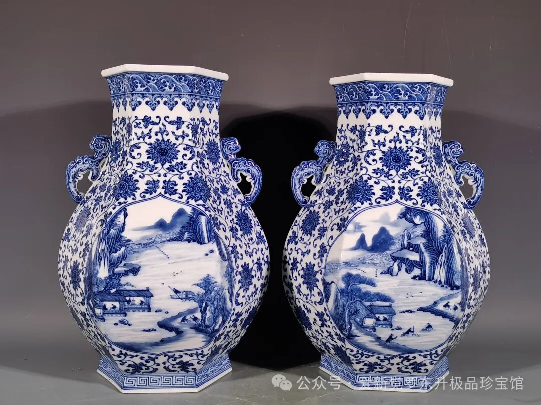 清雍正,青花缠枝莲纹开窗山水人物双耳如意六方尊高度42口径17.3,肚径31