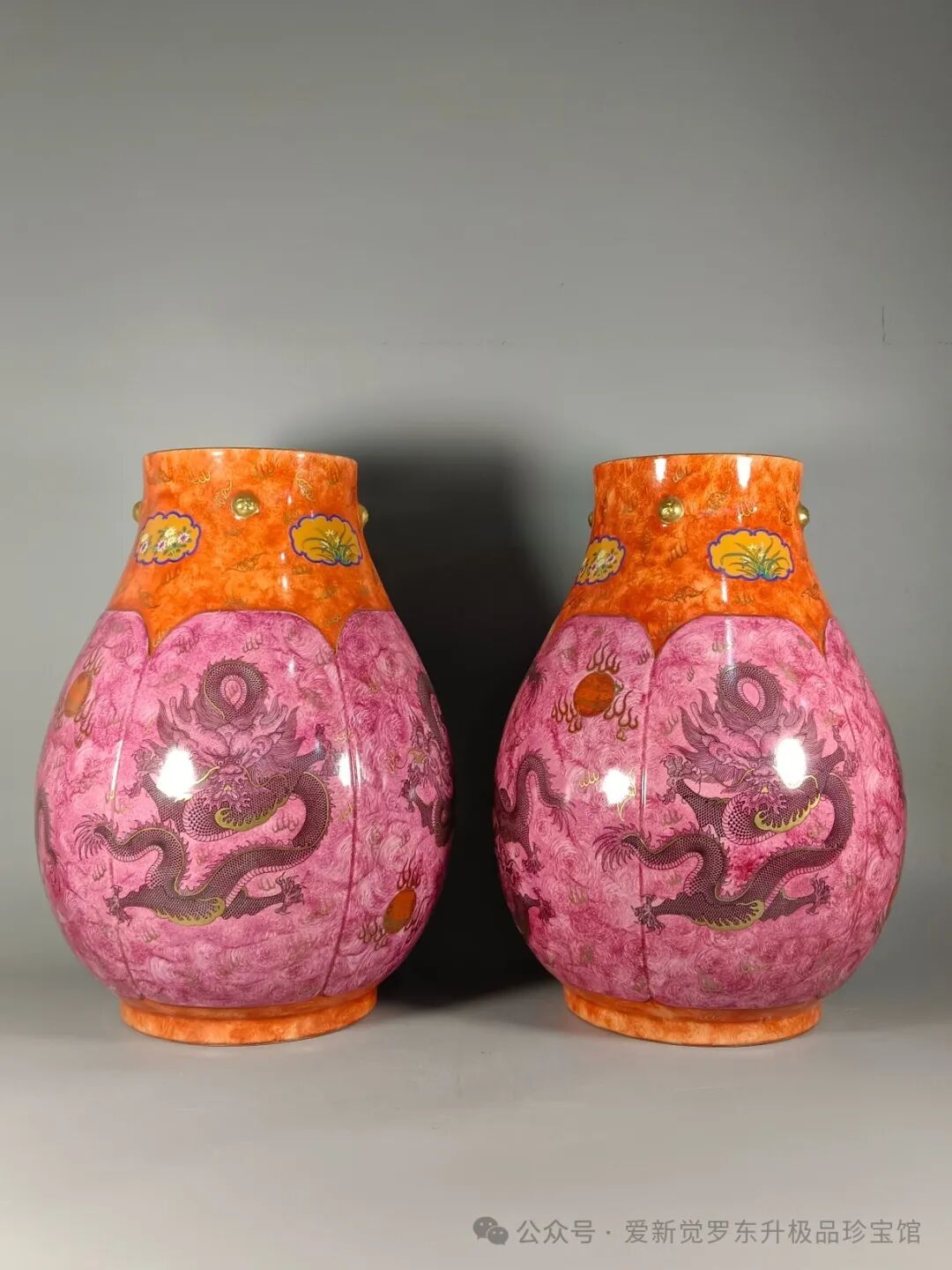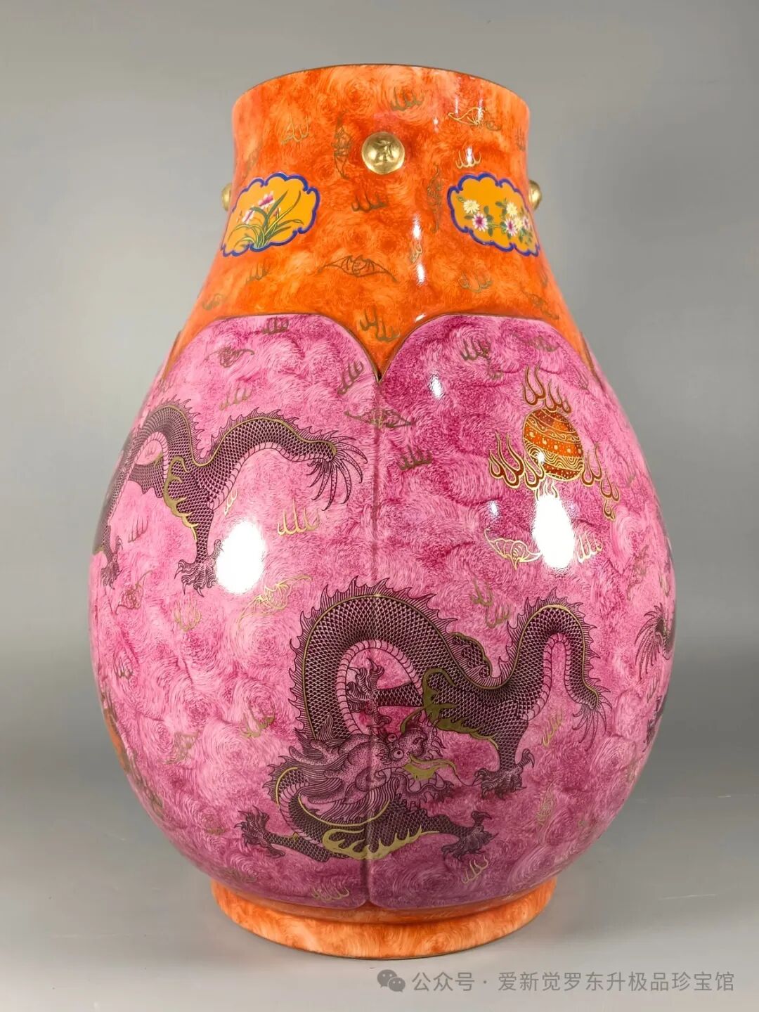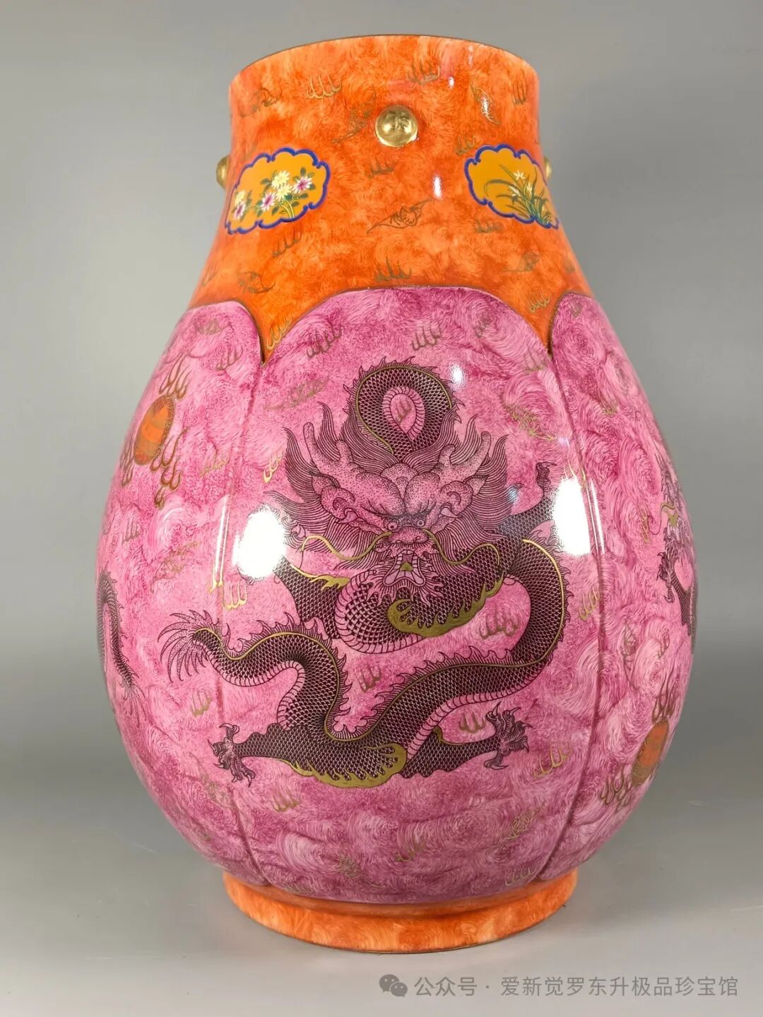 胭脂红龙纹福筒尊高52厘米,肚径39厘米,口径19.8厘米浮云惊龙,有龙则灵;祥龙献瑞,龙腾四海;龙腾盛世,龙翔万里!