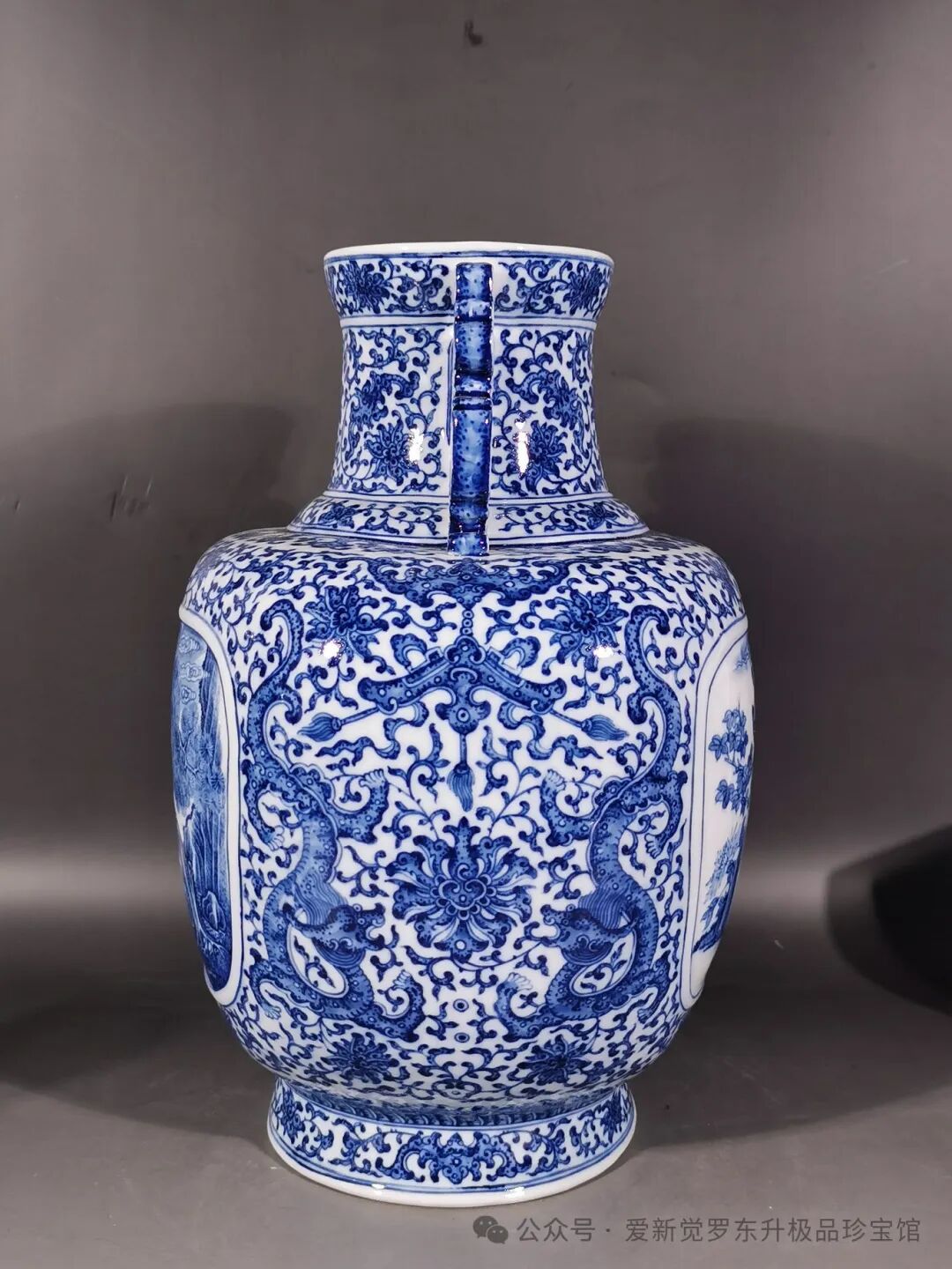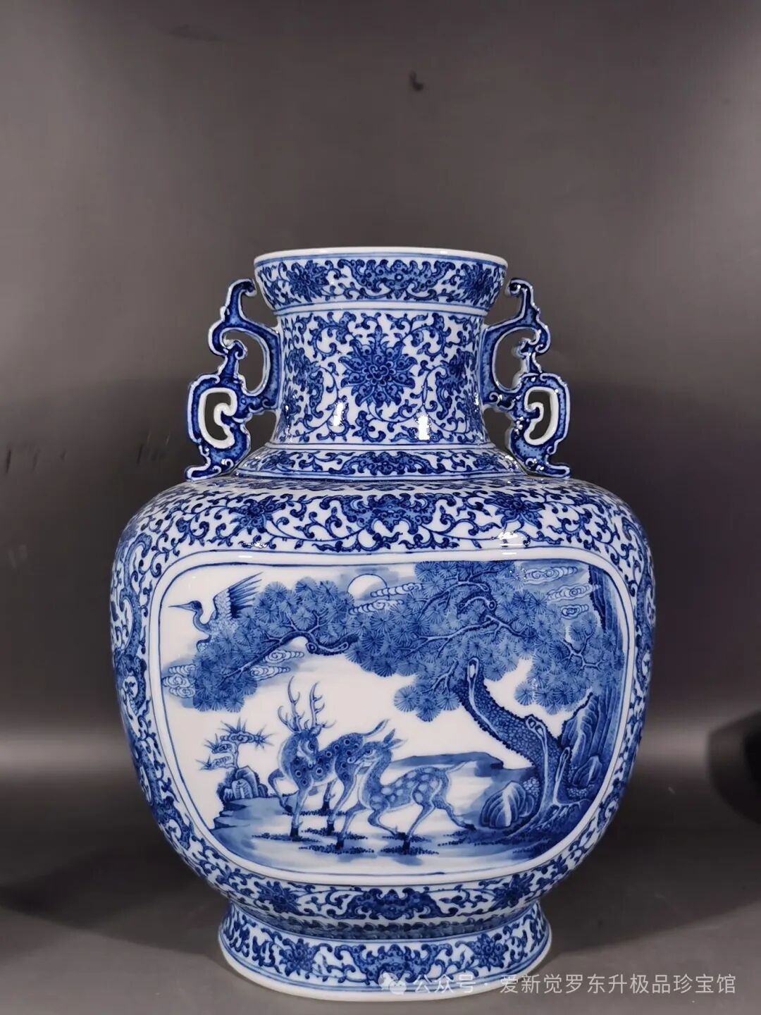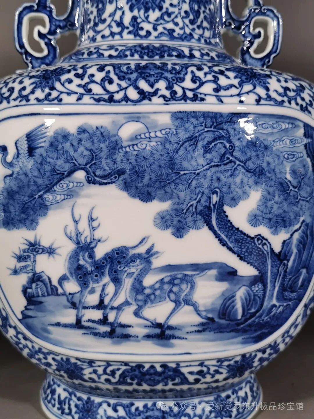 首先我和大家讲一讲 在浩瀚的中国历史长河中,大清乾隆时期无疑是一颗璀璨的明珠,其独特的文化魅力和艺术成就令世界瞩目。而在这一辉煌时期,元青花瓷器作为皇家御制的瑰宝,更是彰显了乾隆皇帝对于瓷器艺术的极致追求和无尽热爱。清乾隆,青花缠枝莲纹龙纹开窗松鹿同春双耳扁瓶高度34.2口径12.2,肚径26.5