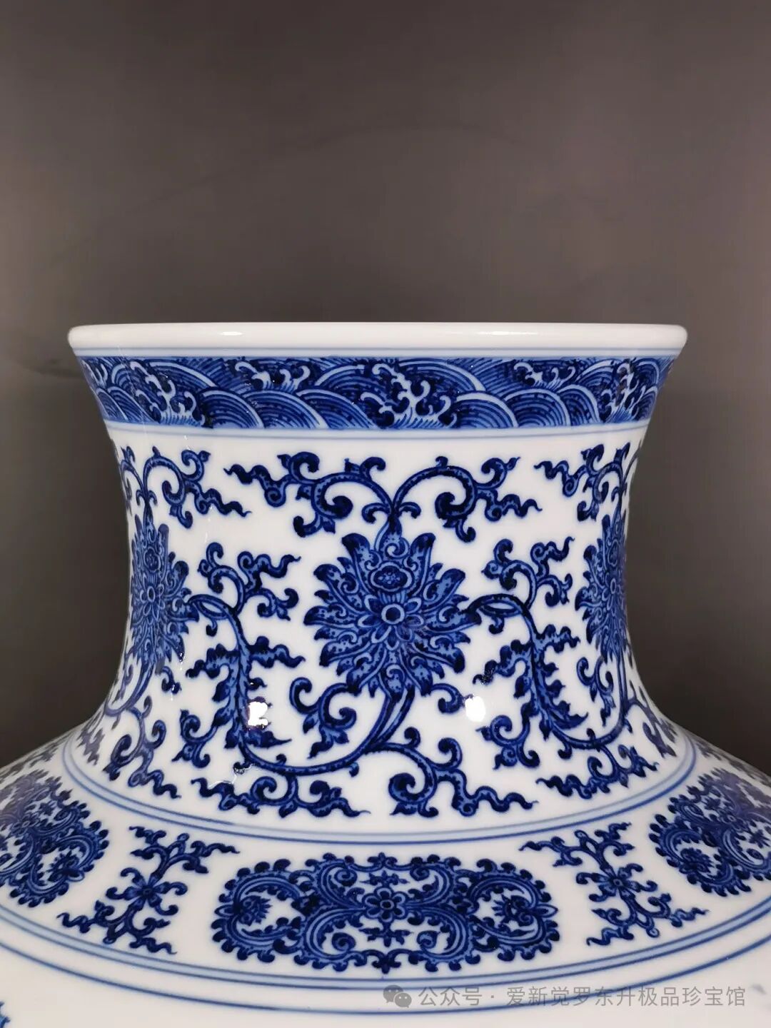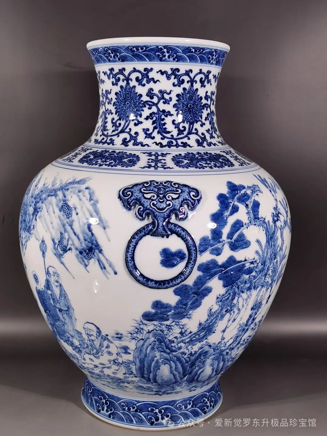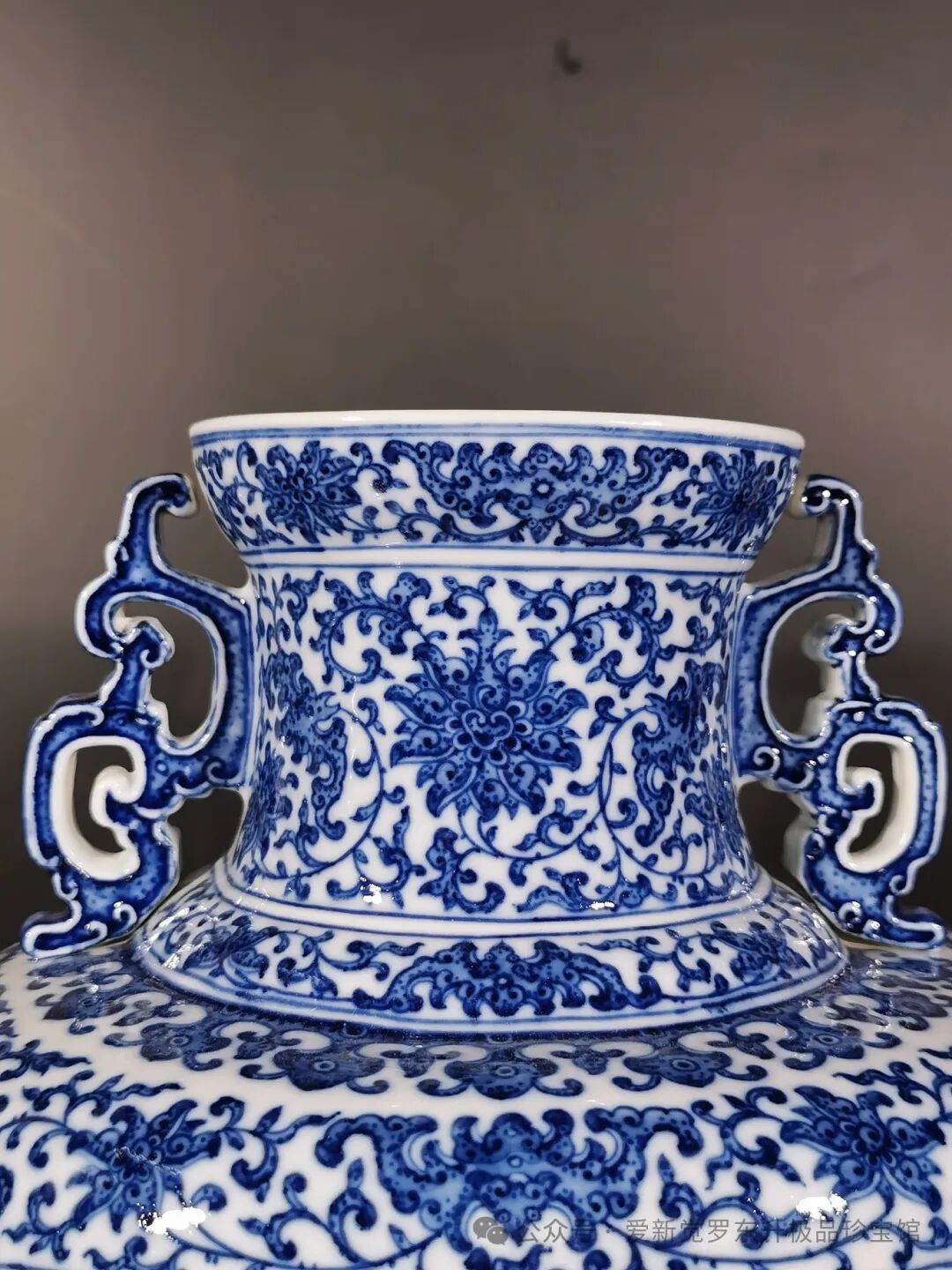 首先我和大家讲一讲 在浩瀚的中国历史长河中,大清乾隆时期无疑是一颗璀璨的明珠,其独特的文化魅力和艺术成就令世界瞩目。而在这一辉煌时期,元青花瓷器作为皇家御制的瑰宝,更是彰显了乾隆皇帝对于瓷器艺术的极致追求和无尽热爱。清乾隆,青花缠枝莲纹龙纹开窗松鹿同春双耳扁瓶高度34.2口径12.2,肚径26.5