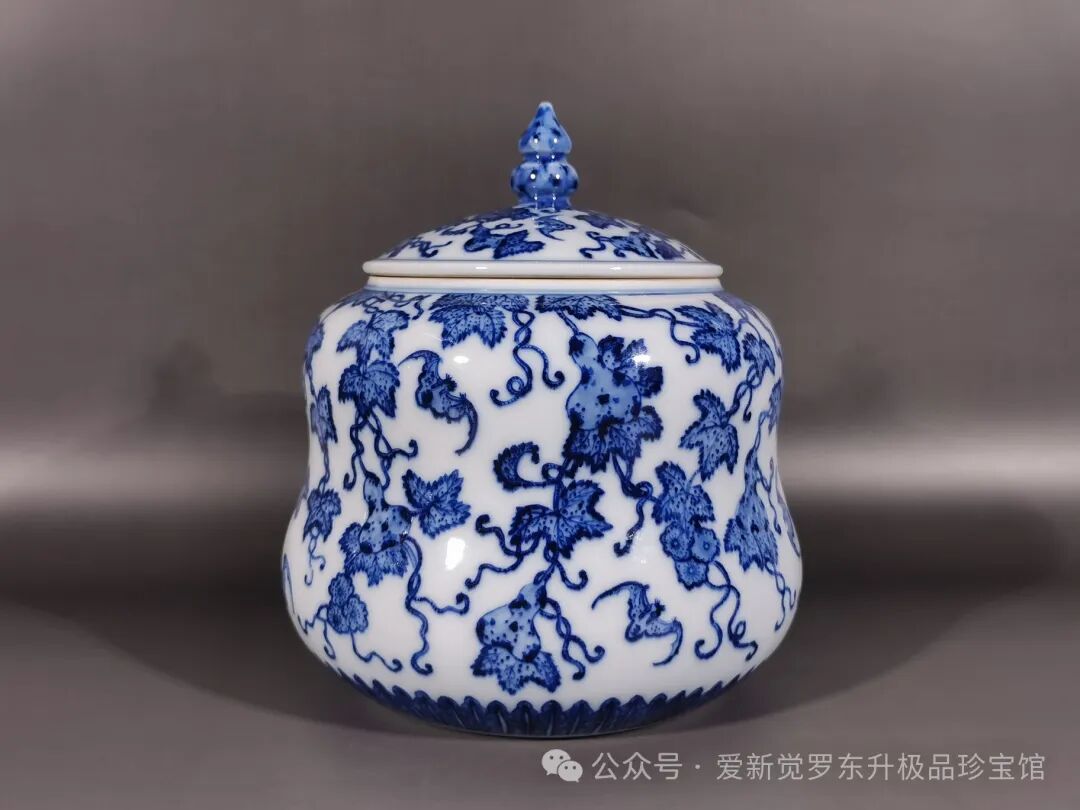 这一时期的元青花瓷器,胎质细腻、釉面润泽、青花发色深邃。在绘画方面,乾隆皇帝亲自指导工匠们绘制各种花卉、山水、人物等图案,使得每一件作品都充满了浓厚的皇家气息和极高的艺术价值。此外,乾隆皇帝还经常将自己的御制诗篇题写在元青花瓷器上,使得这些瓷器不仅具有极高的艺术价值,还具有极高的文化价值。清乾隆,青花瓜果福纹葫芦茶叶罐高度19.5,口径10.8,肚径16.8