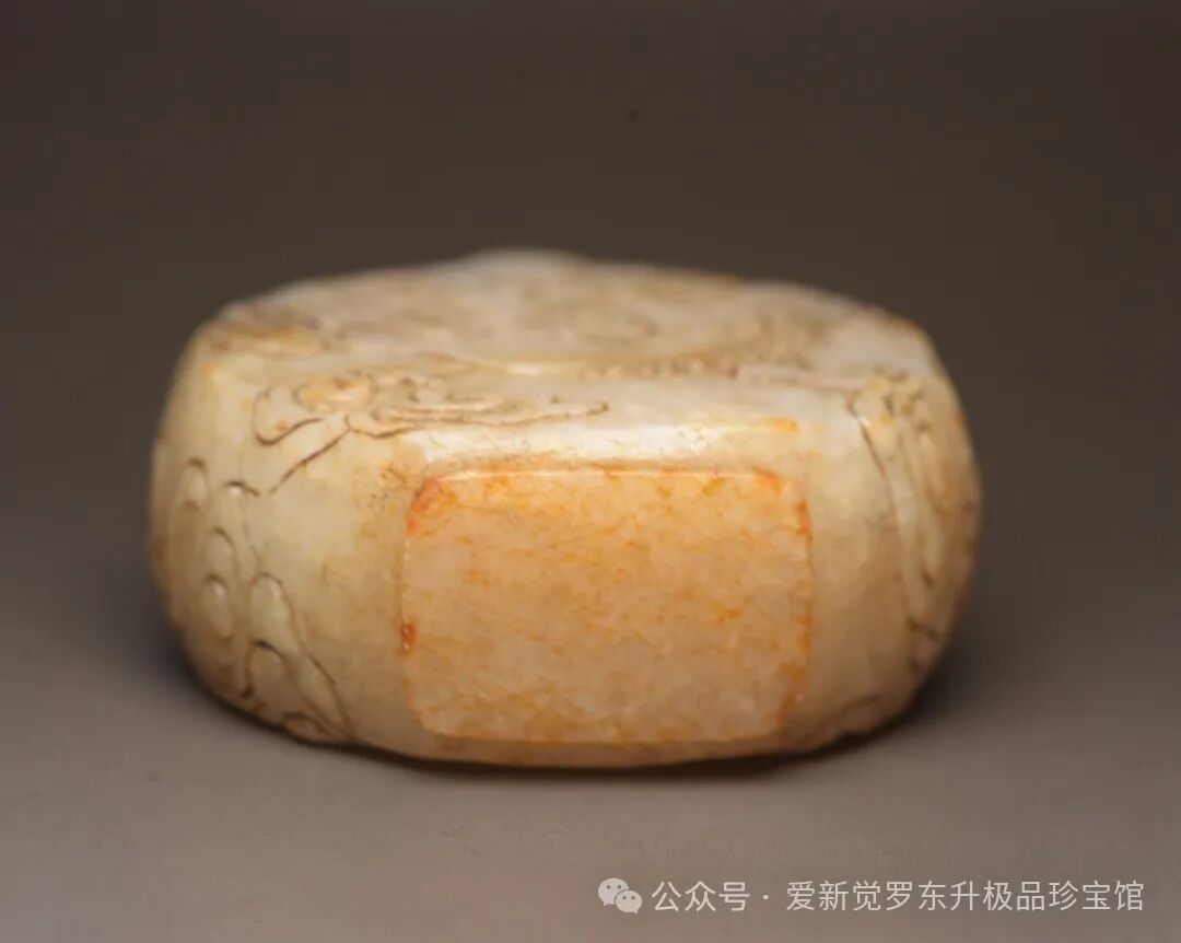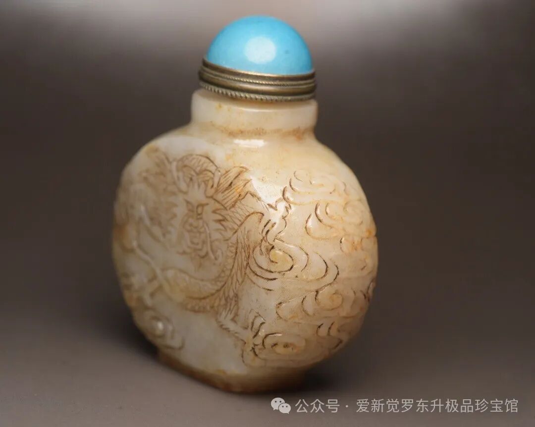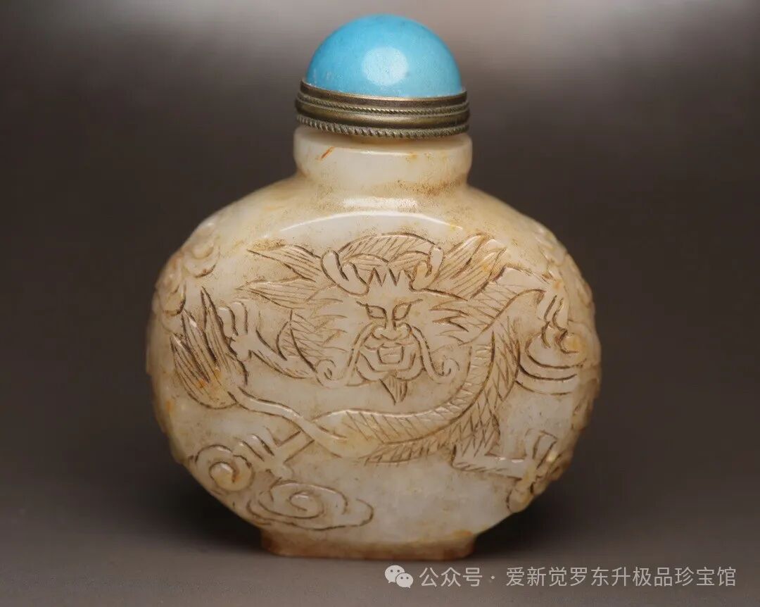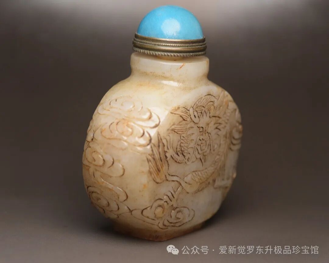 清 和田玉鼻烟壶 规格: 6.6×5.7×2.6厘米,重 145克。 玉质温润细腻,沁色自然,刀功老道,皮壳包浆一流,雕刻生动,线条流畅,品相完美!