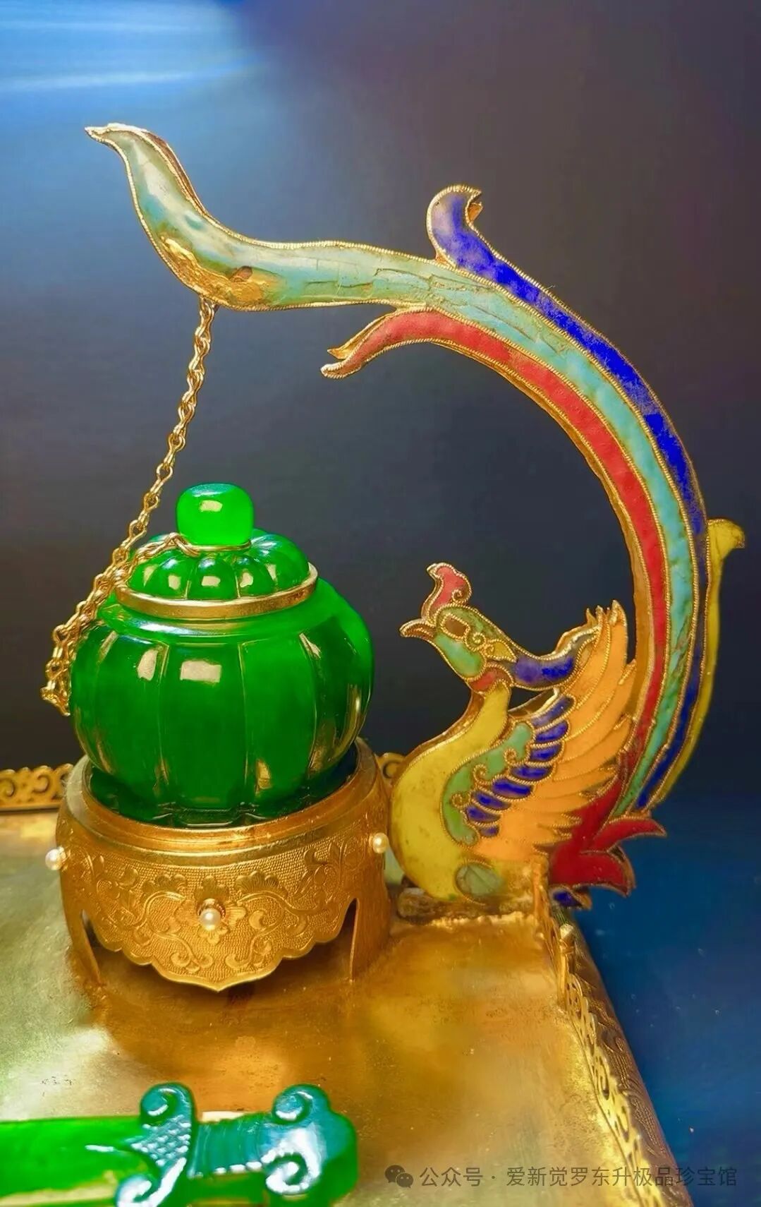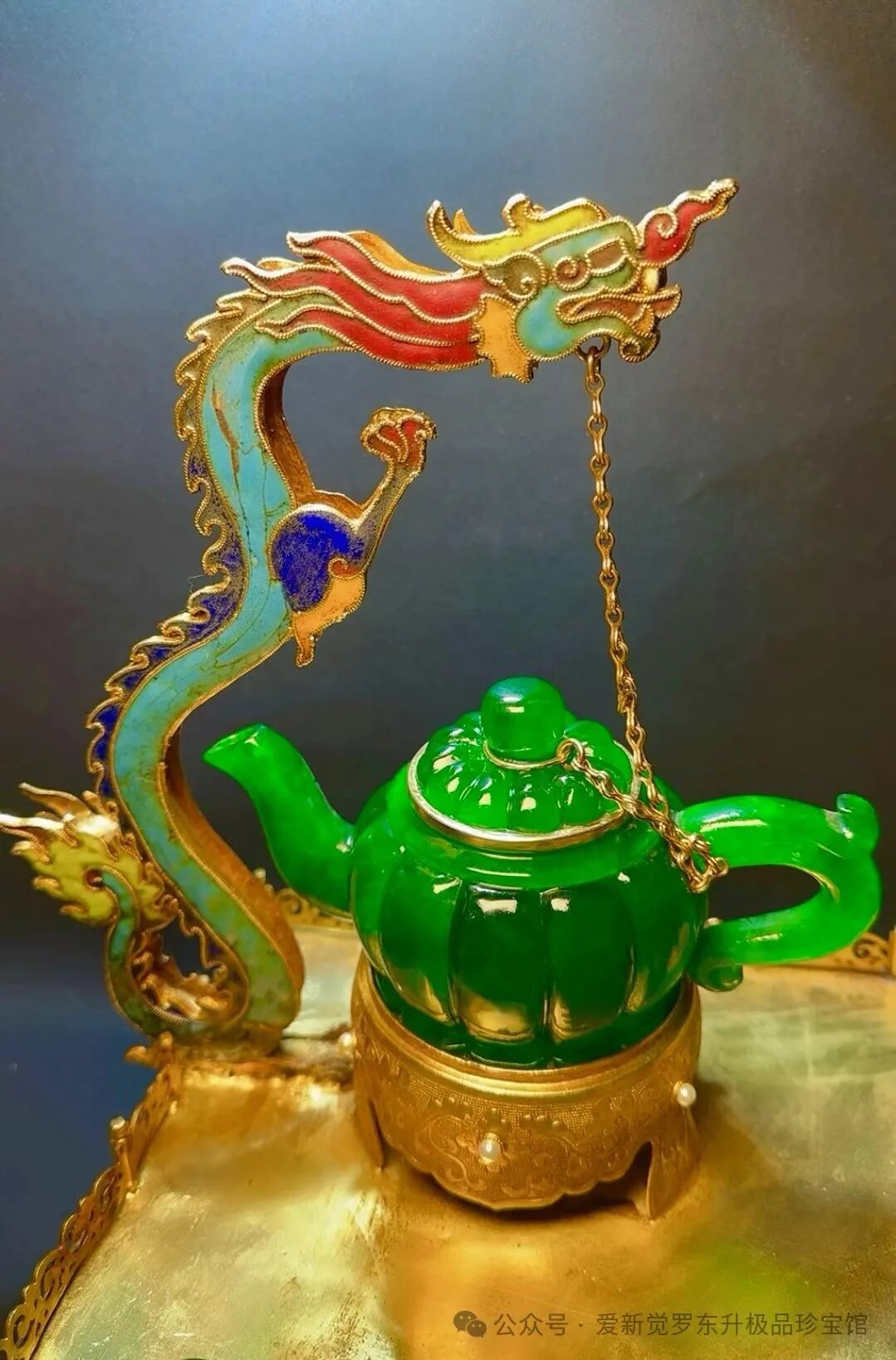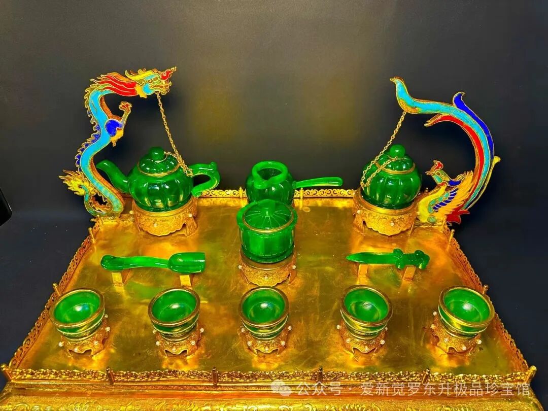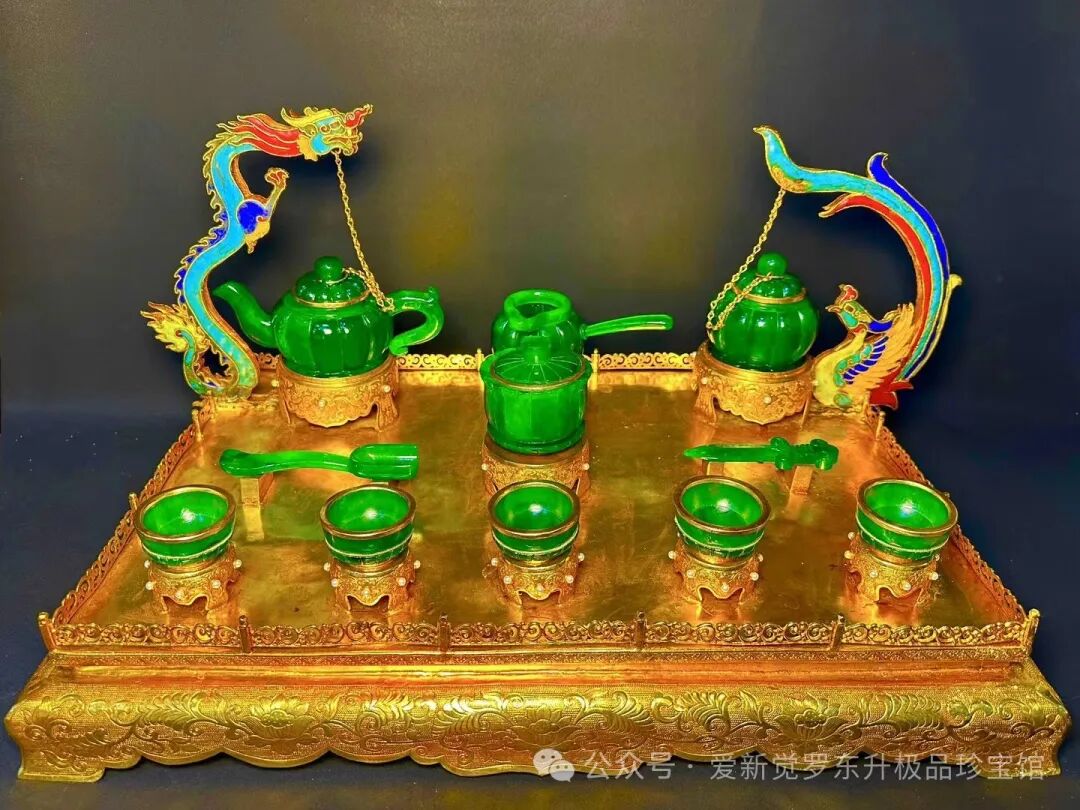 旧藏清代老翡翠 鎏金景泰蓝精工【龙凤呈祥 茶具套装一套】长55cm、宽36cm、高30cm总重17.3斤