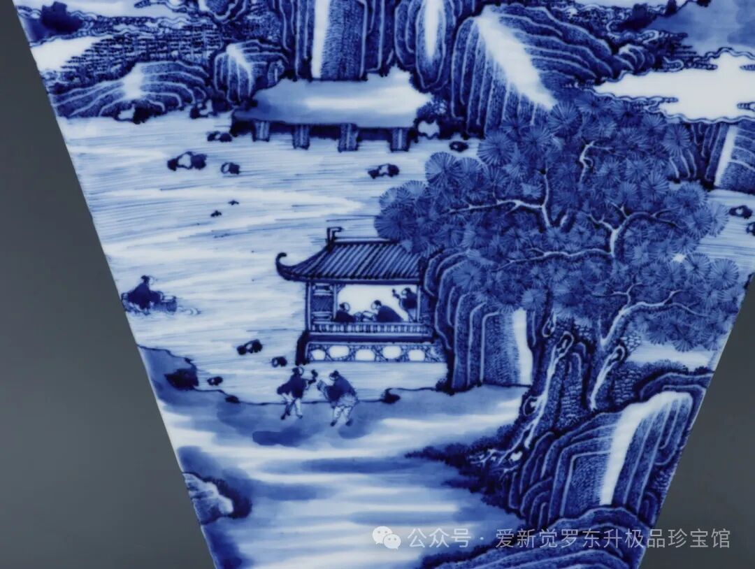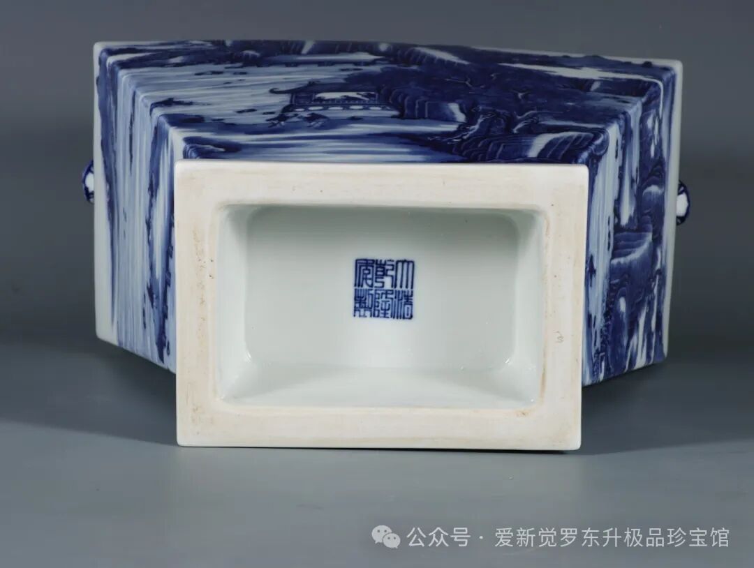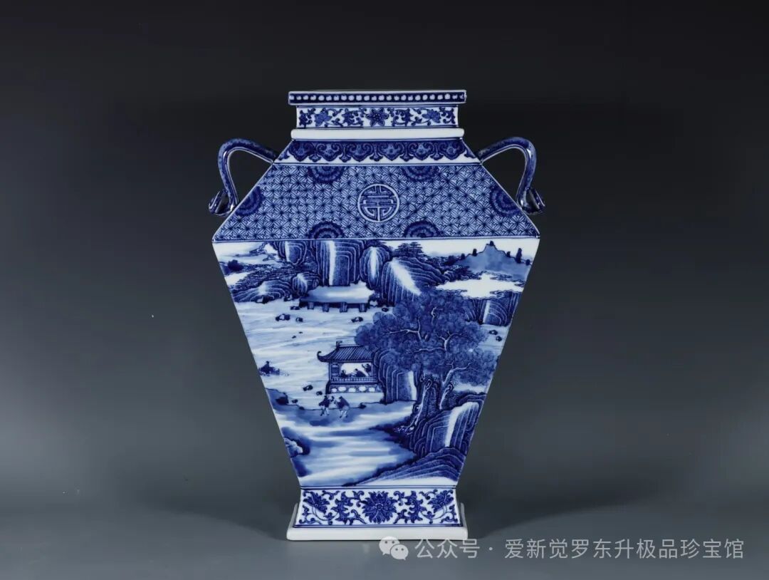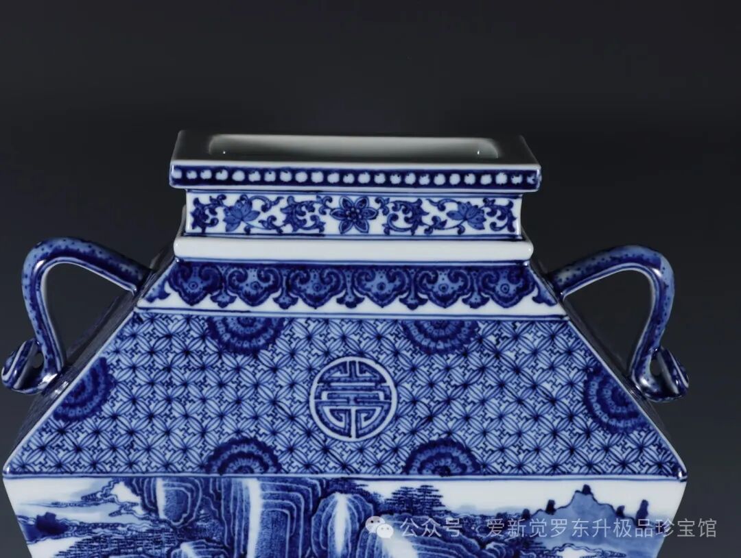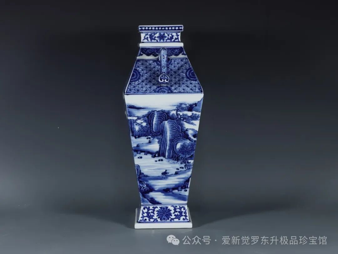 清乾隆,青花缠枝莲纹铜钱边开窗山水人物双耳如意四方瓶高度38.3肚径26.8口径14.8底径15.3