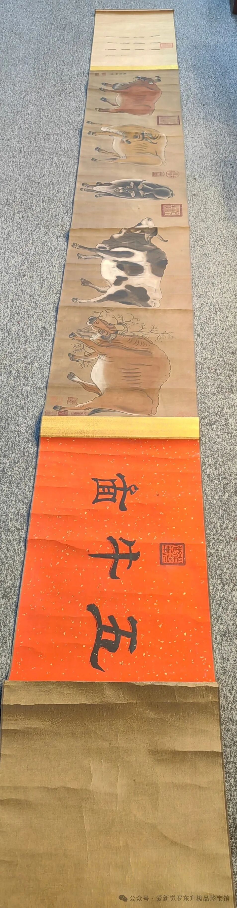 乾隆御笔,精品绢本:五牛图,总尺寸38.3厘米X4米左右全长,画心37.8厘米X200.5厘米