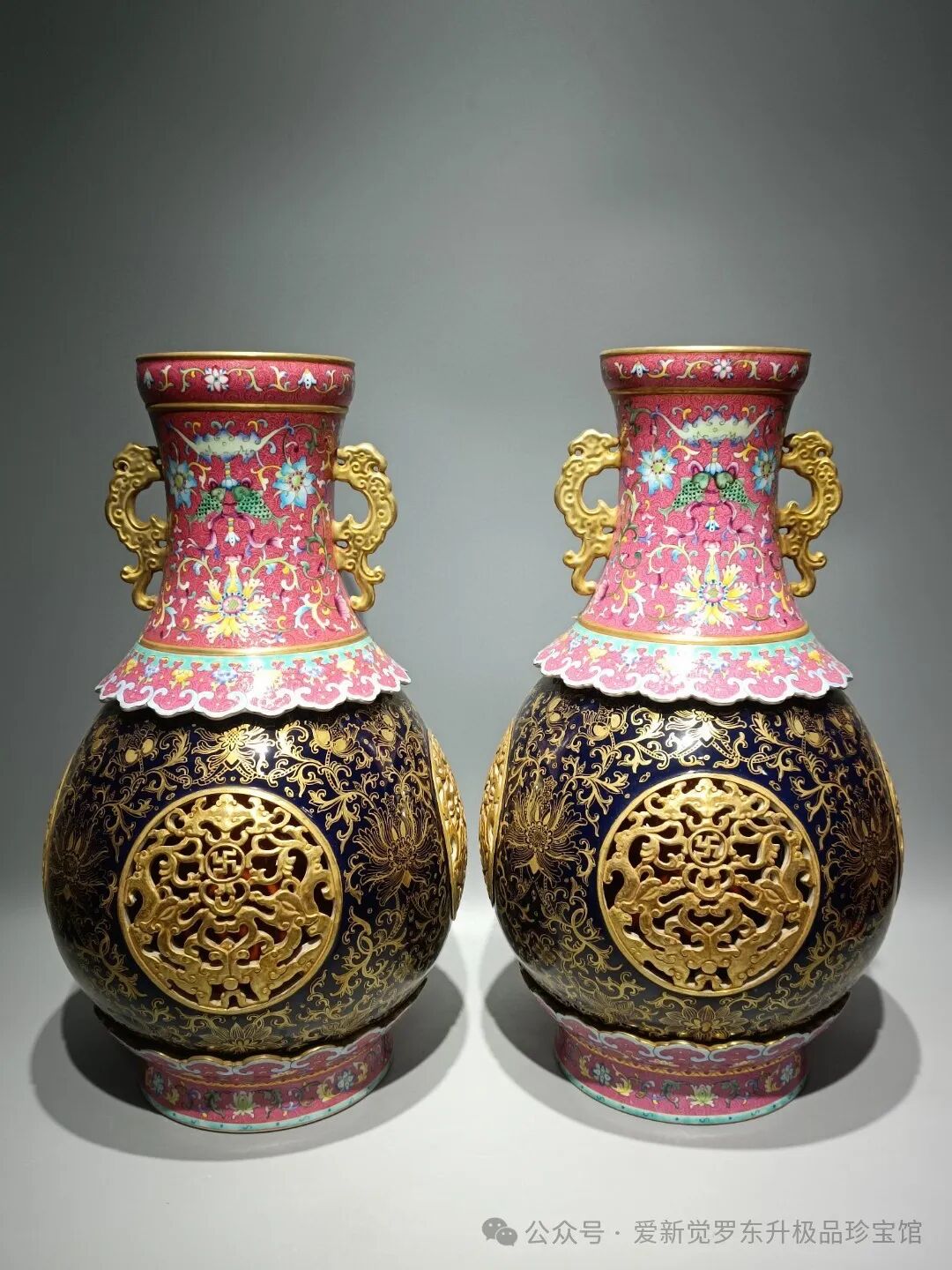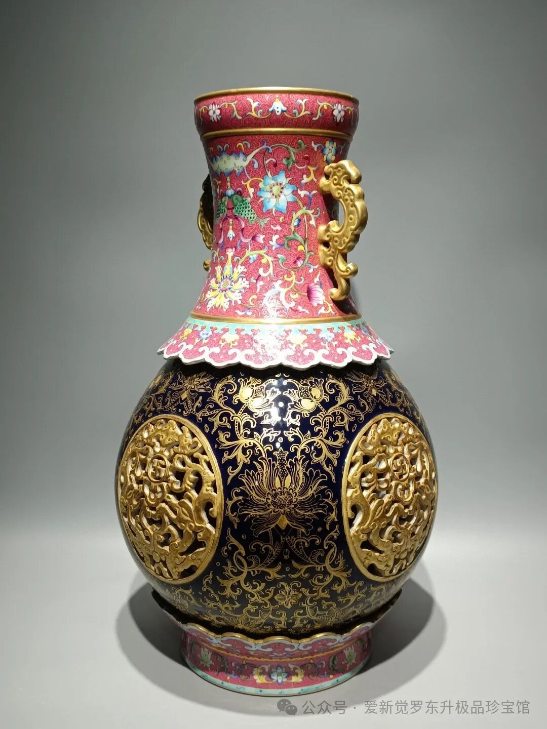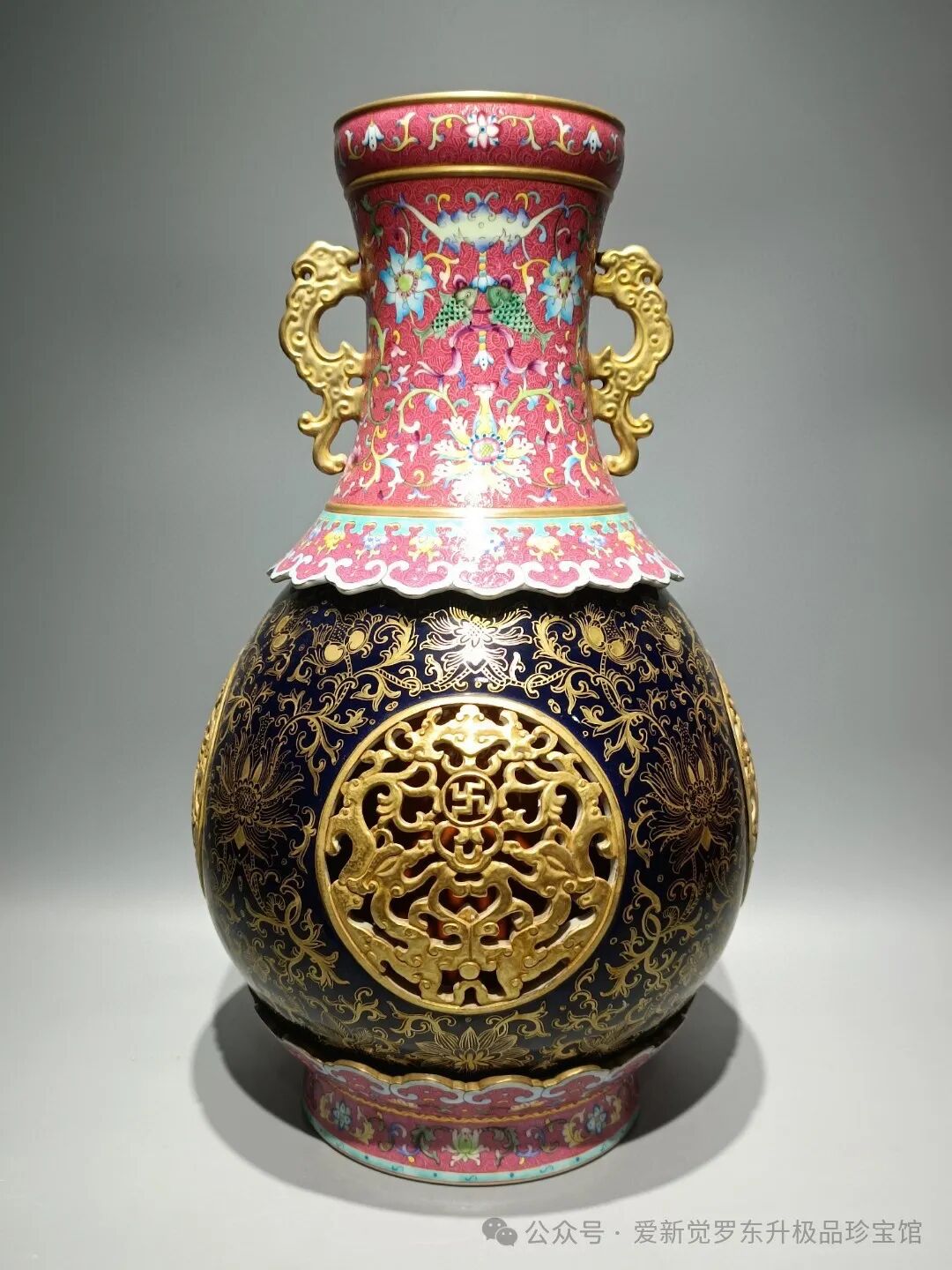 清乾隆款,洋彩胭脂红轧道纹霁蓝描金四面镂空鎏金福寿连连双耳转心瓶 高:50cm宽:28.5cm
