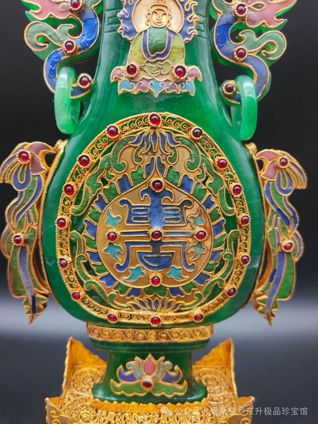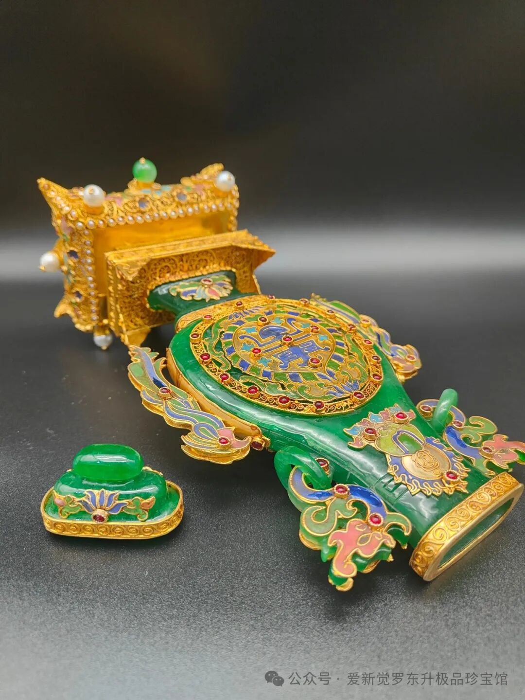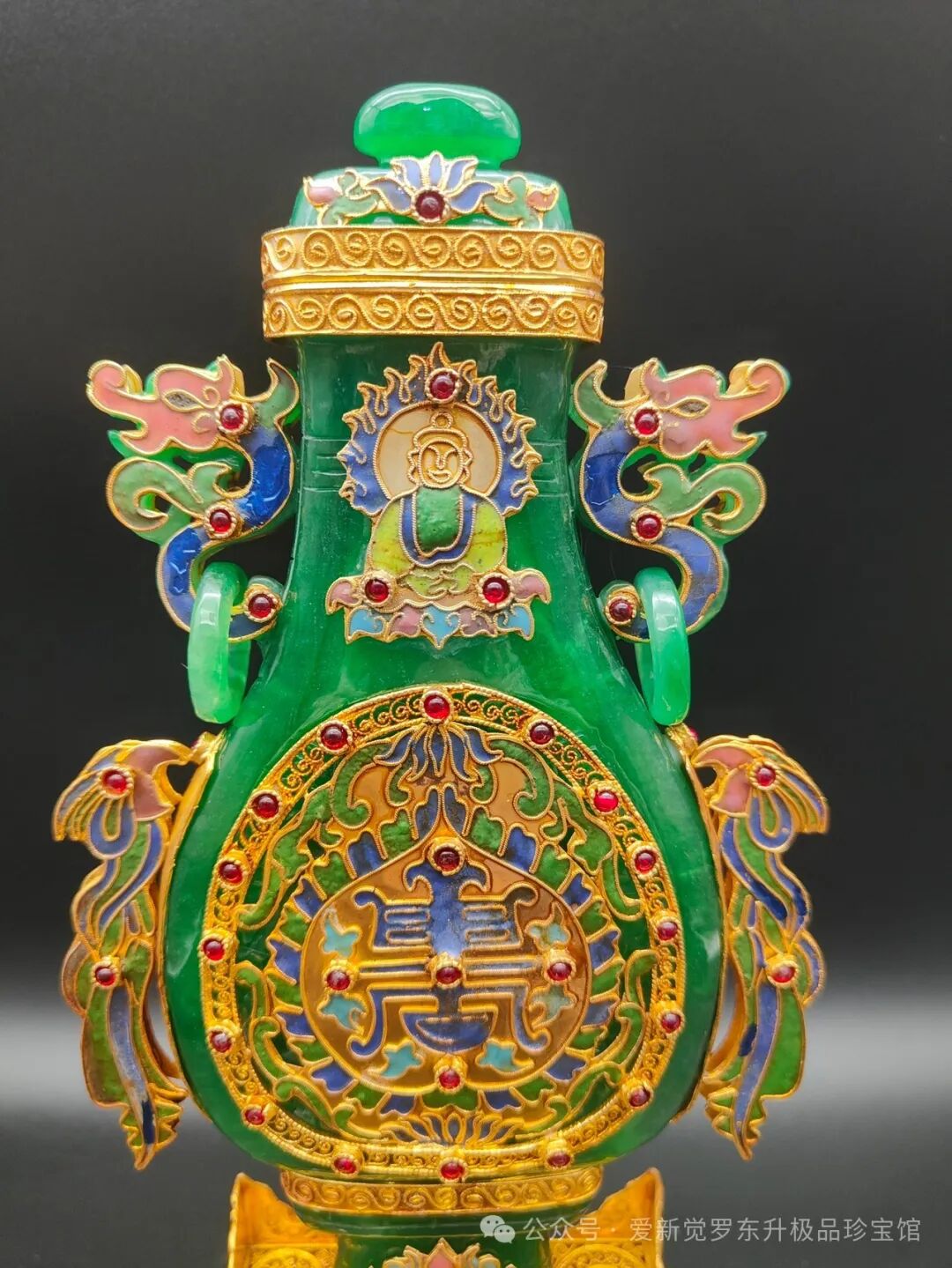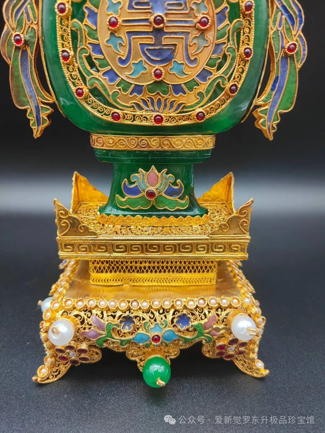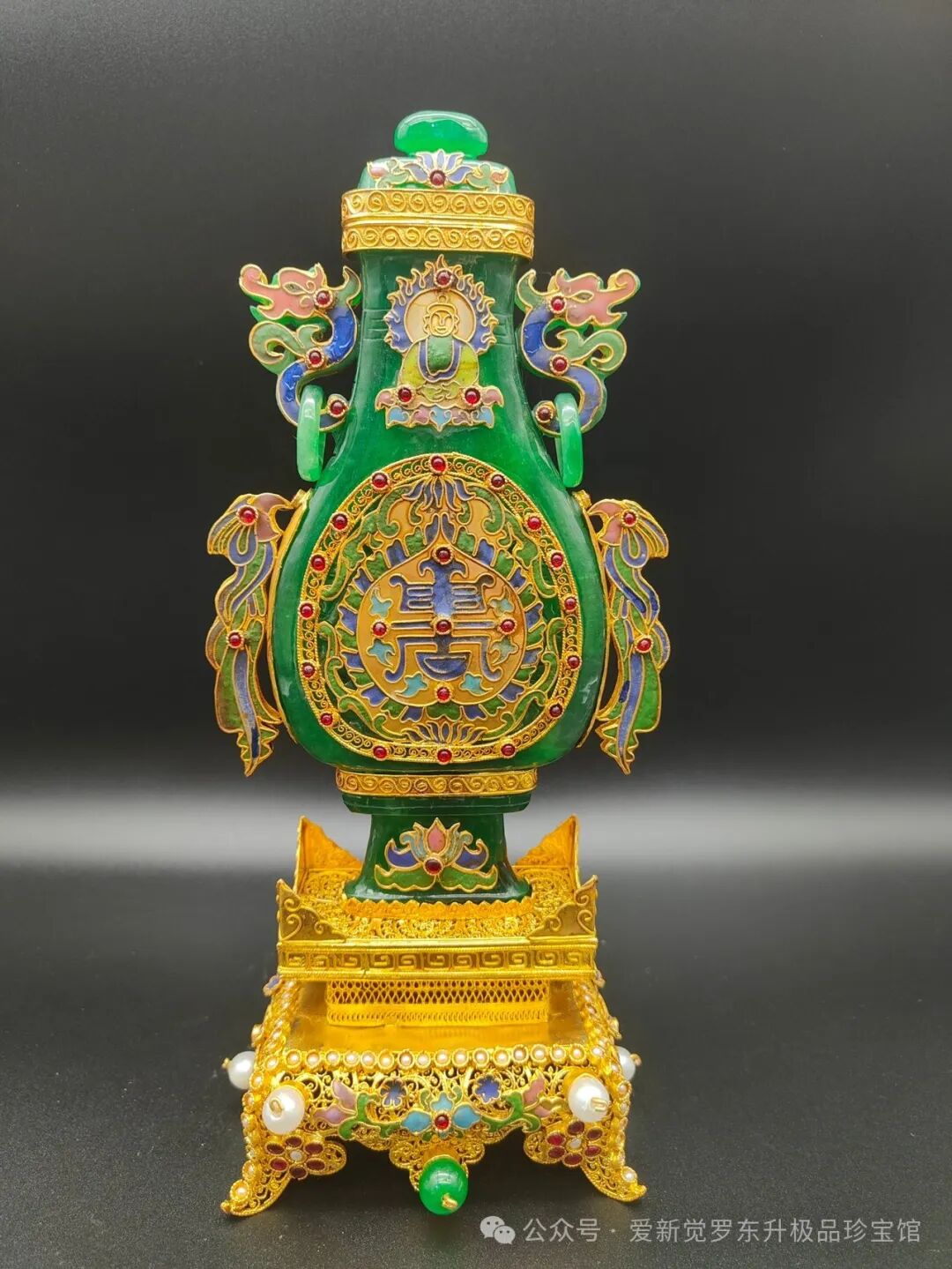 旧藏清代花丝鎏金镶嵌翡翠扁瓶,精工镶嵌高冰翡翠,宝石珍珠点缀,高28厘米,宽12厘米,重830克