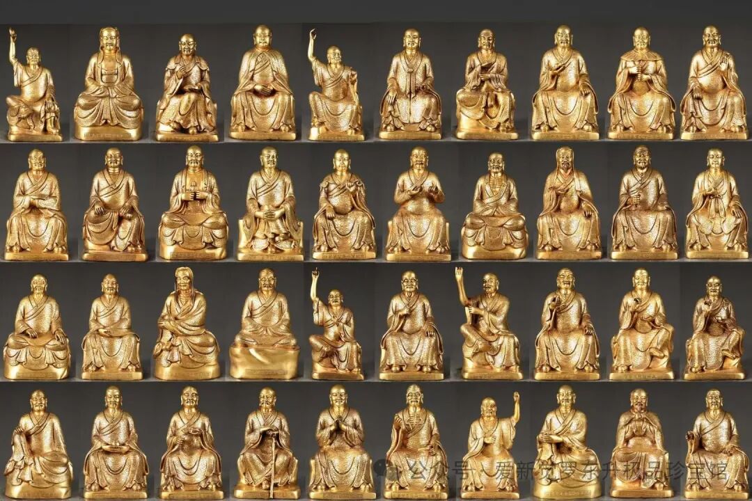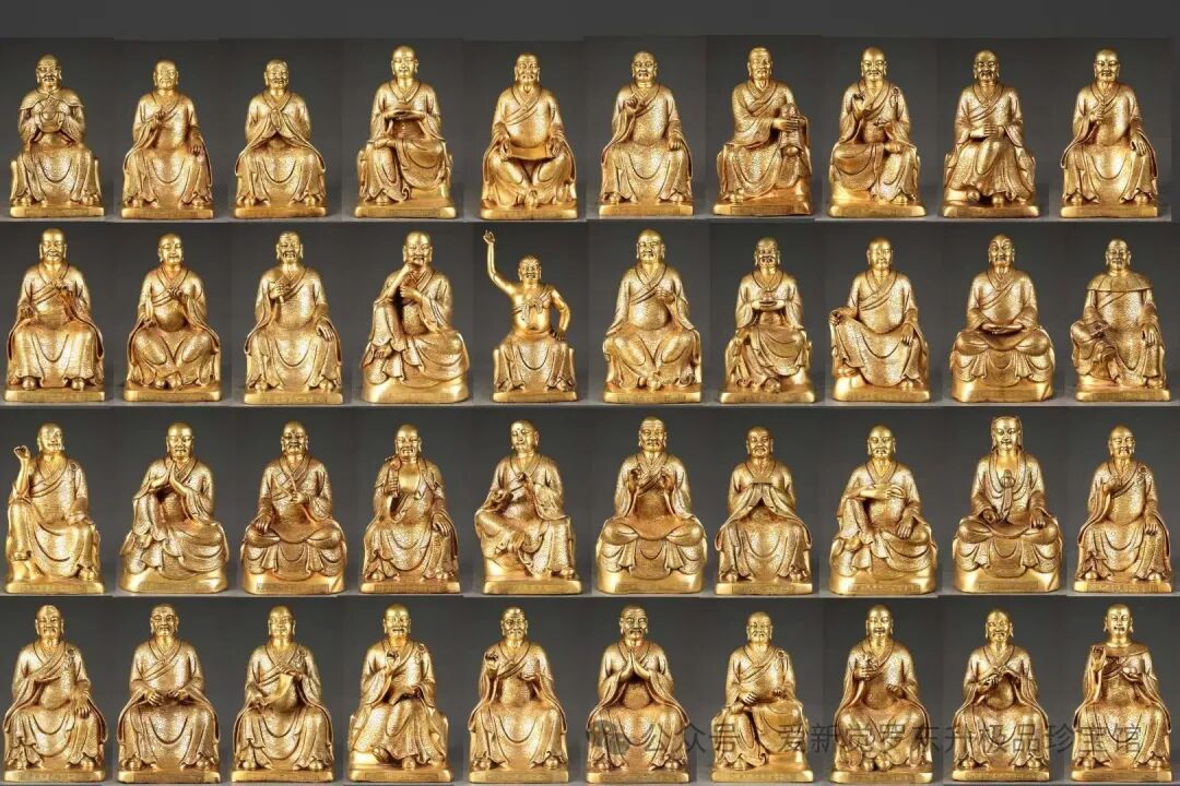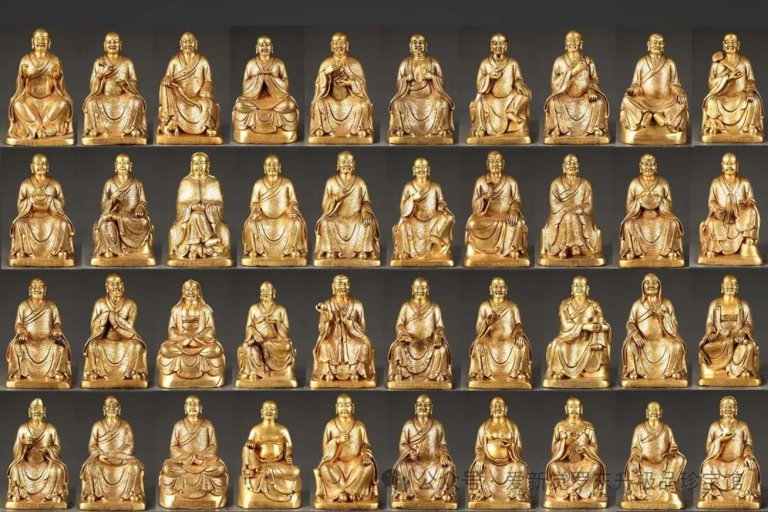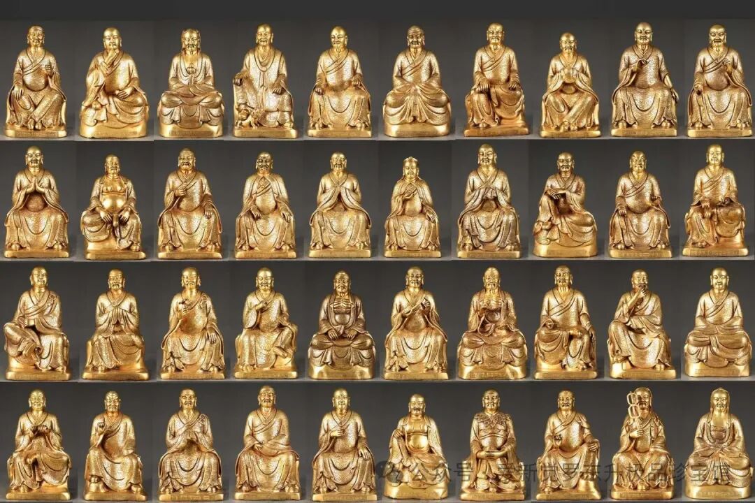 明 精铸紫铜胎鎏金五百罗汉坐像 一套【规格】高32cm左右 宽约18左右cm 一套重10000斤左右【款识】大明永乐年施【详述】 匠心独运,精铜铸就,完美塑形。每尊罗汉造型严谨规范,比例匀称,生动形象,惟妙惟肖,栩栩如生,各有特色。五官刻画清晰细腻,面部表情生动且各不相同,体现了深厚的艺术底蕴和超强的艺术表现力。神采奕奕,威武庄严,让人为之一振。身型或圆润饱满、或瘦骨嶙峋。身披满工祥云纹图案袈裟,衣缘减地浅浮雕卷草纹装饰点缀,使整像协调有度,增加一分神秘感。造像写实风格,刀工熟巧,遒劲有力,线条流畅,婉转悠扬,飘逸灵动。背部后座錾刻落款“大明永乐年施”、底部刻“金刚杵”图案。 整组五百罗汉像保存完整,工艺精湛,不论整体把握,还是细部处理,皆增益有度,恰到好处,充分表现了明代永宣宫廷高超的造像艺术和铸造技术。包浆醇厚,古拙凛然,金水一流,深穆沉着,过渡自然,实属鎏金佛像中的精品,具有极高的艺术性和收藏价值!