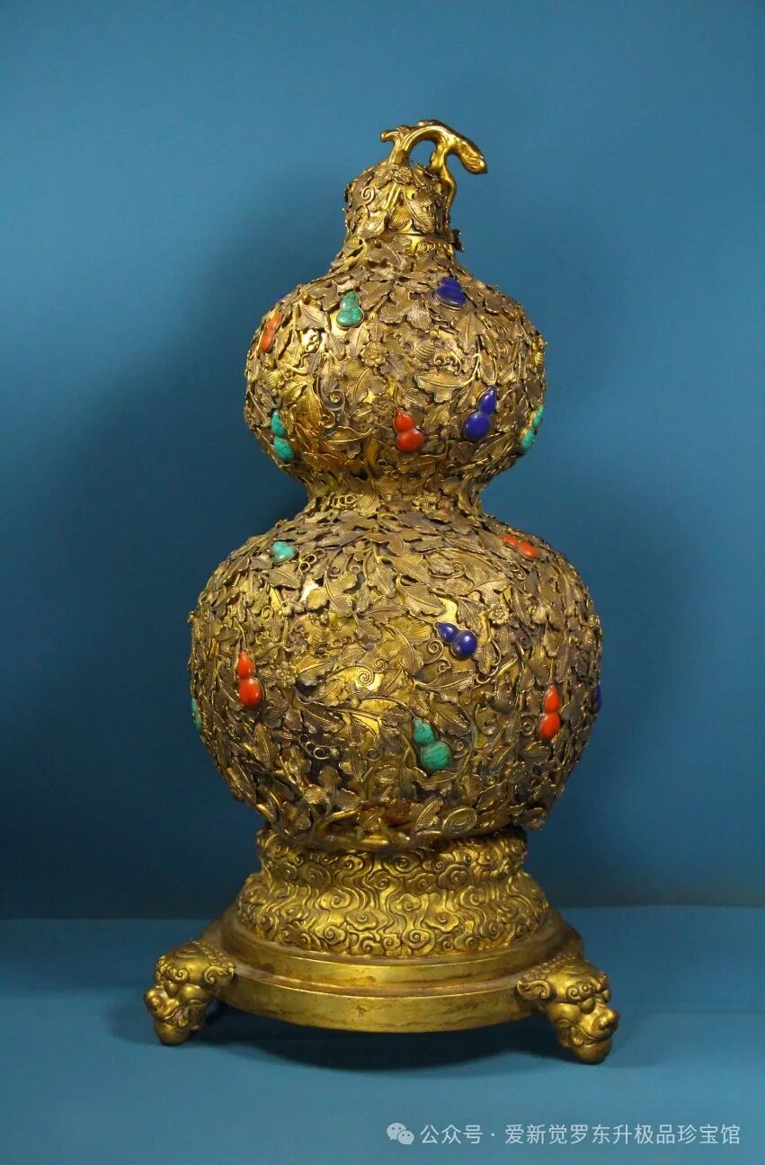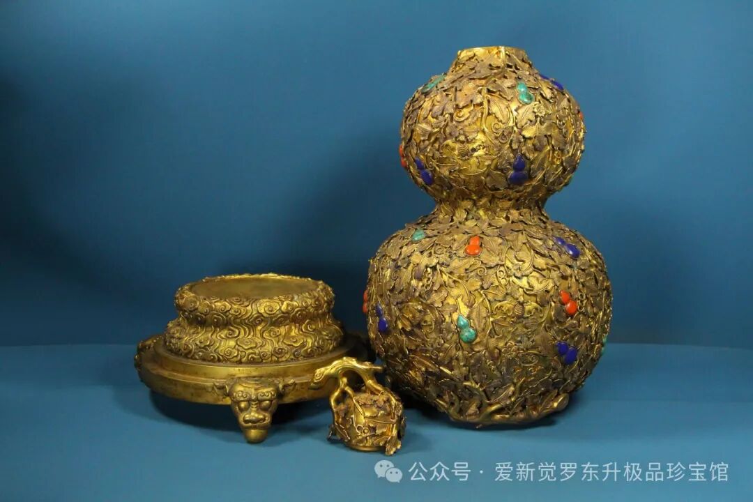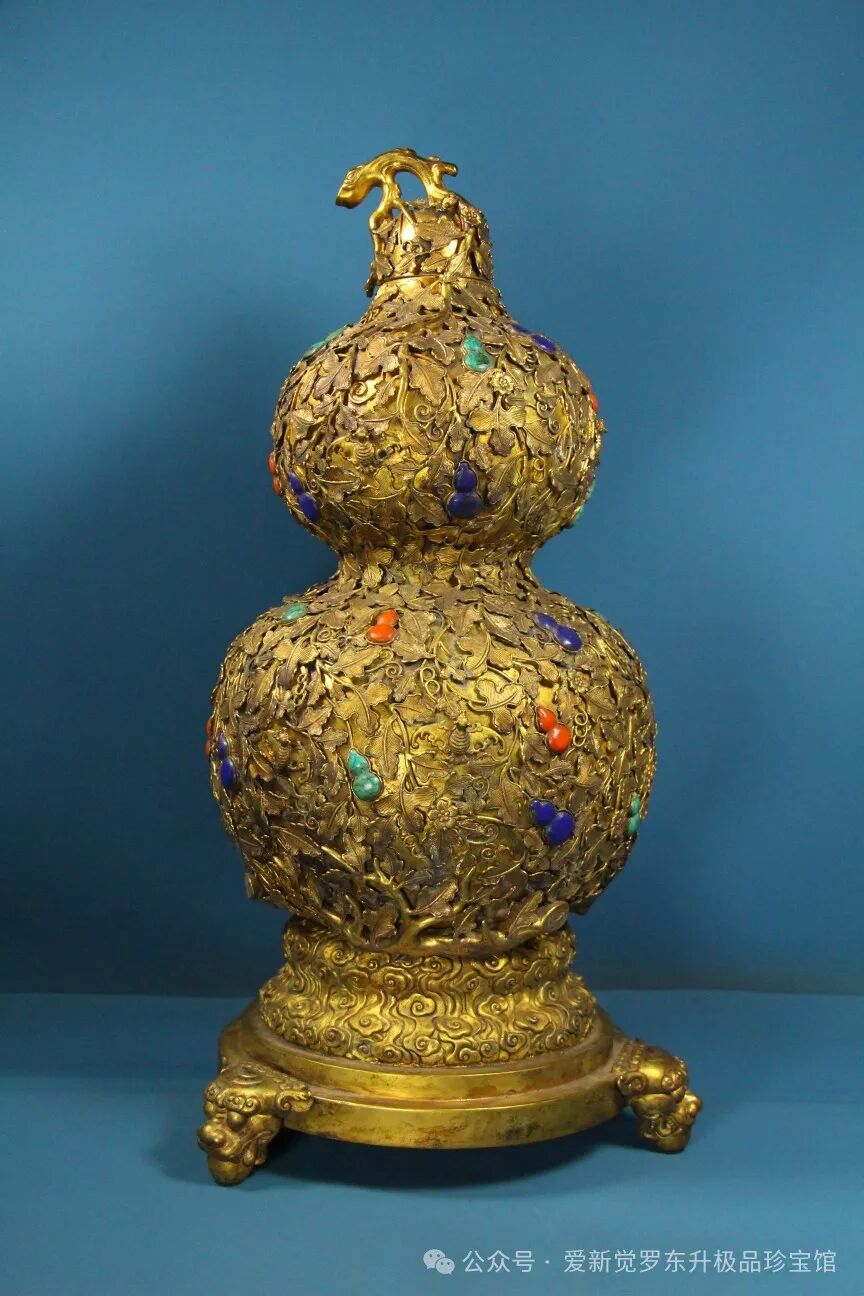 旧藏精品纯手工打造铜鎏真金镶宝石高浮雕錾刻葫芦瓶高52.5厘米 宽26厘米 重8430克