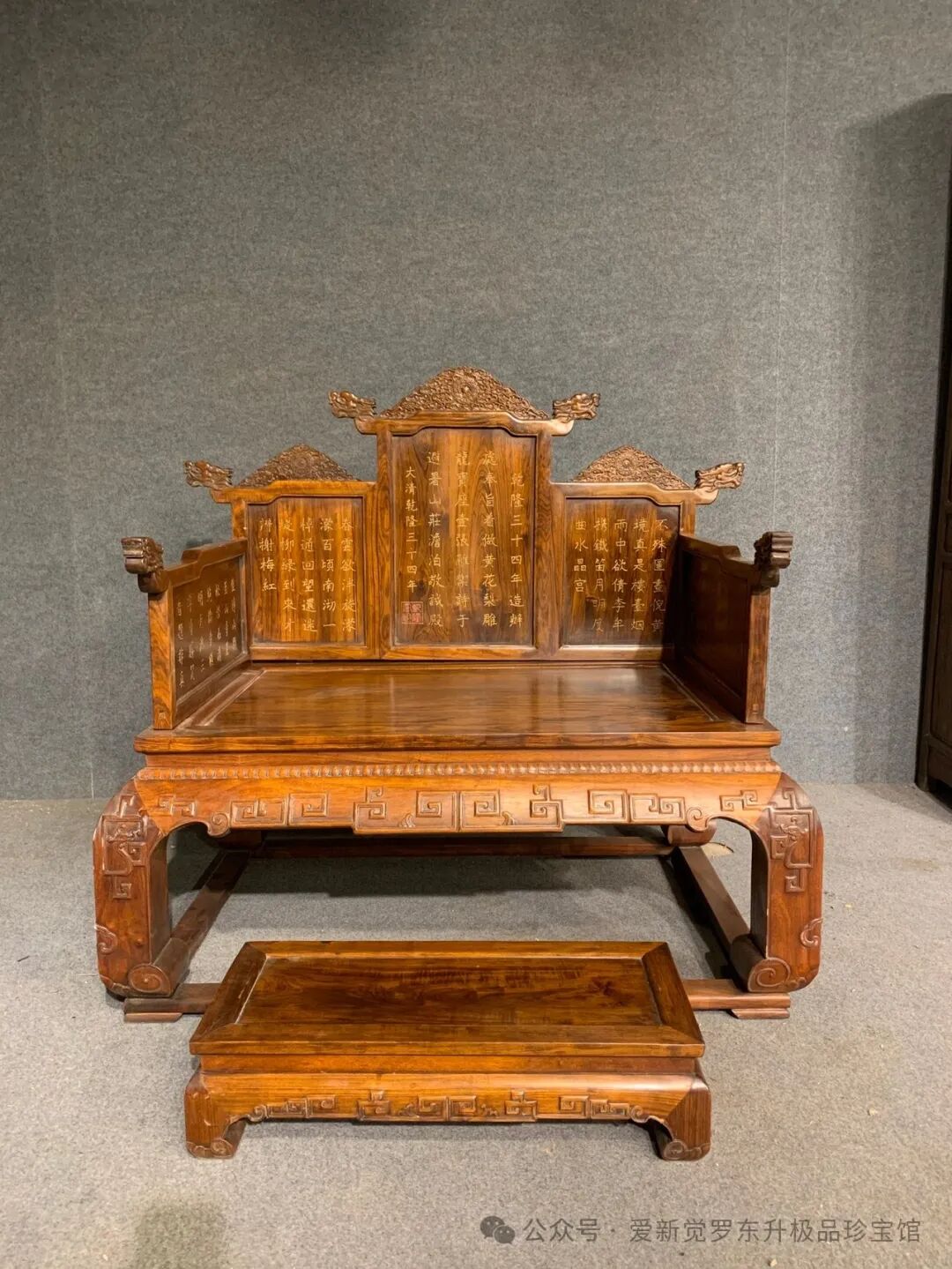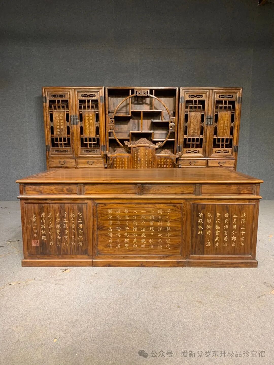 4. 维护社会稳定。通过立法规范艺术品市场,可以有效打击欺诈、洗钱等活动,维护社会稳定和公共利益。三、立法建议为了制定出科学合理的法律法规,我们需要从以下几个方面提出建议:乾隆三十四年造办处奉旨着做黄花梨博古柜三组,书桌壹张,宝座壹张雕刻御诗安置于避暑山庄澹泊敬诚殿以供御用!长318高2米厚38字台长220宽1米高82宝座长110宽70高120