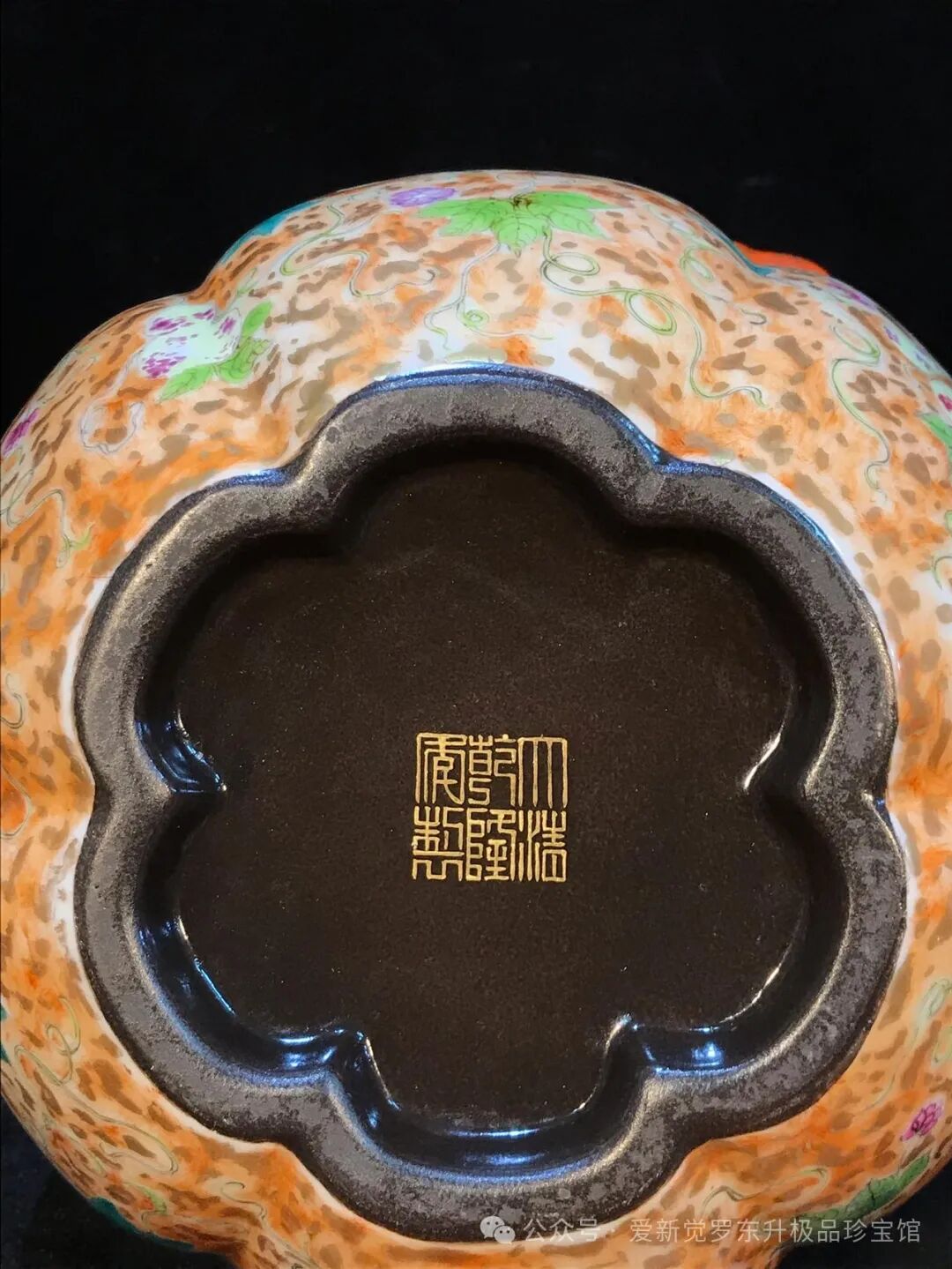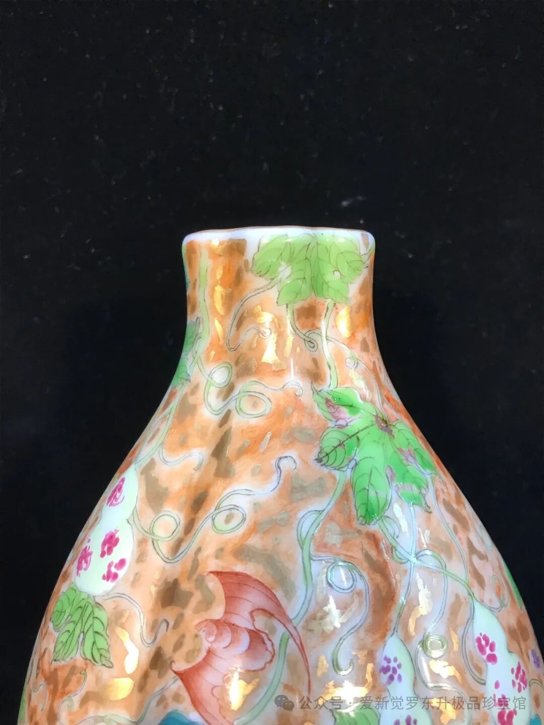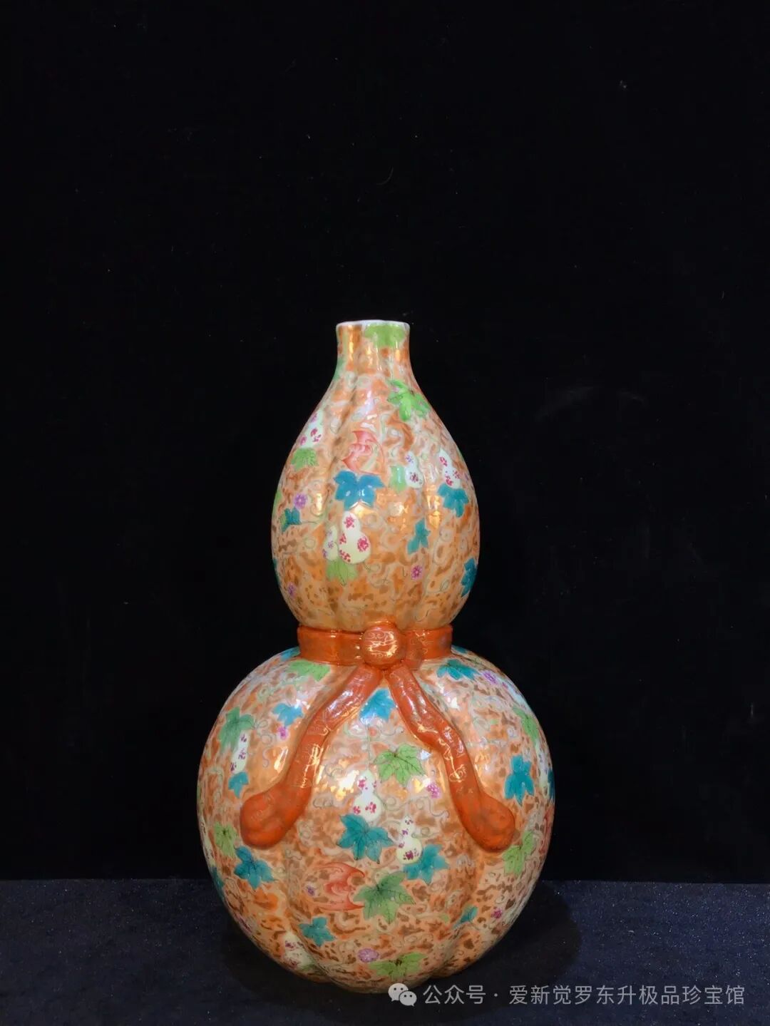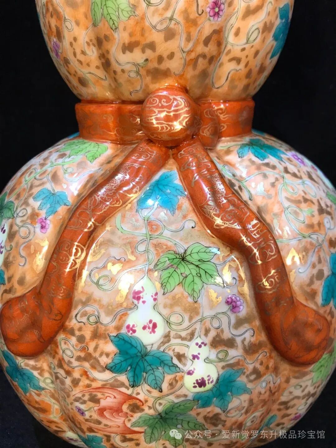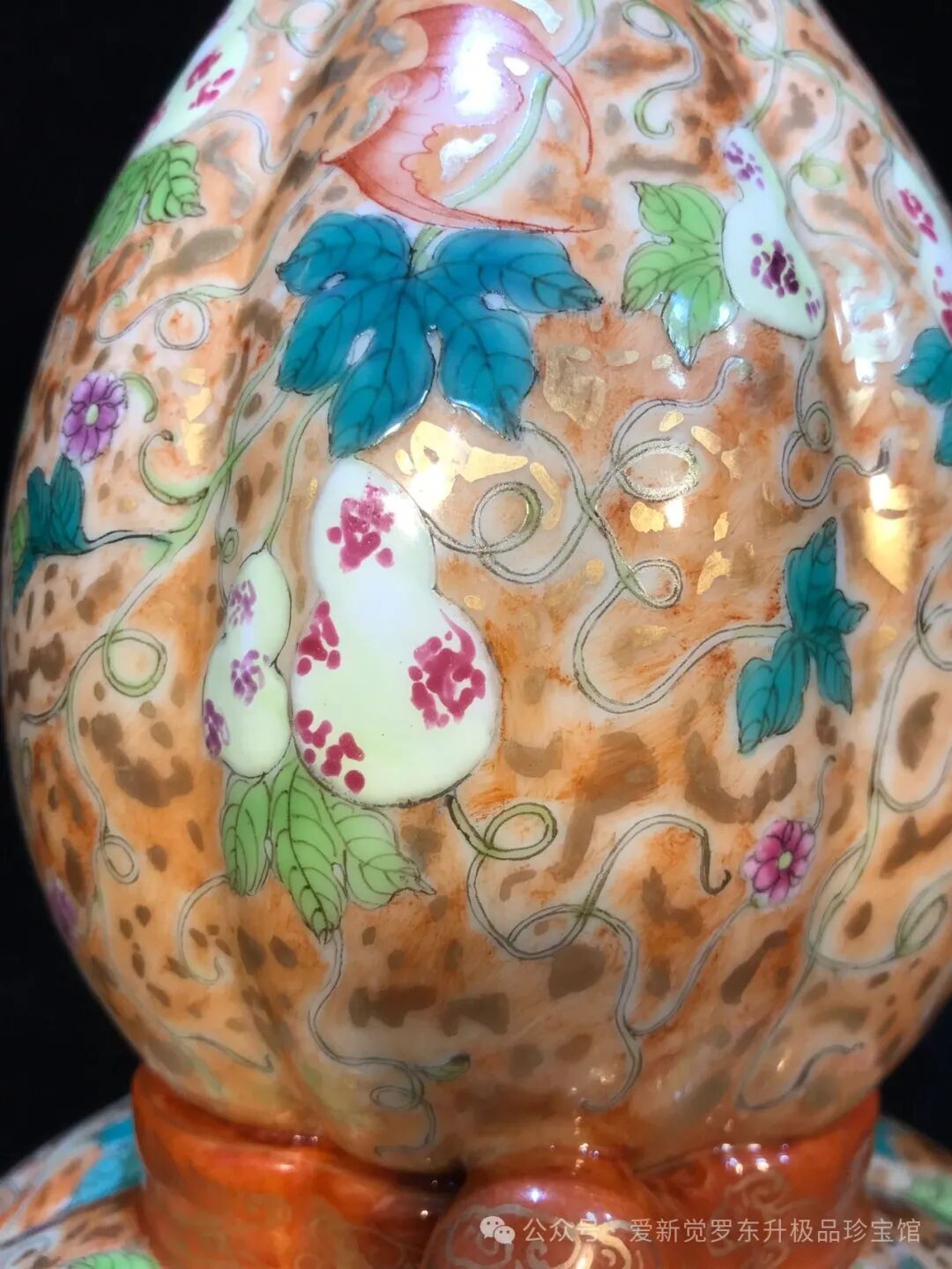 清宫旧藏,清乾隆,粉彩洒金福寿万代瓜莲布袋葫芦瓶,高37.4厘米,口径4.6厘米,底径11.8厘米。