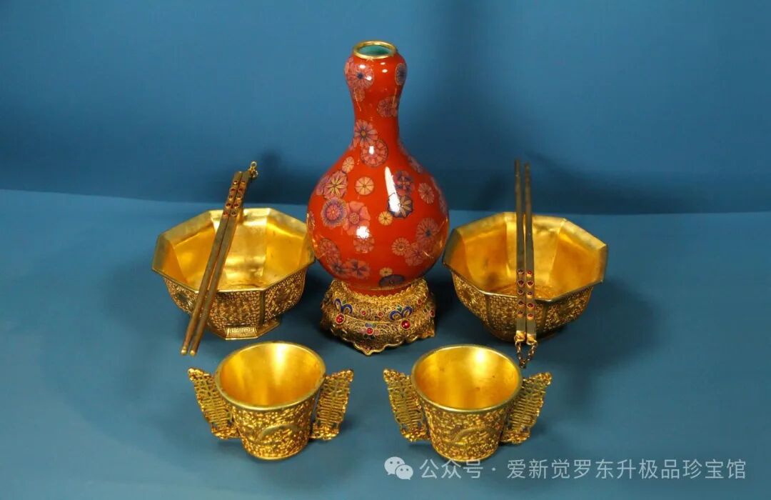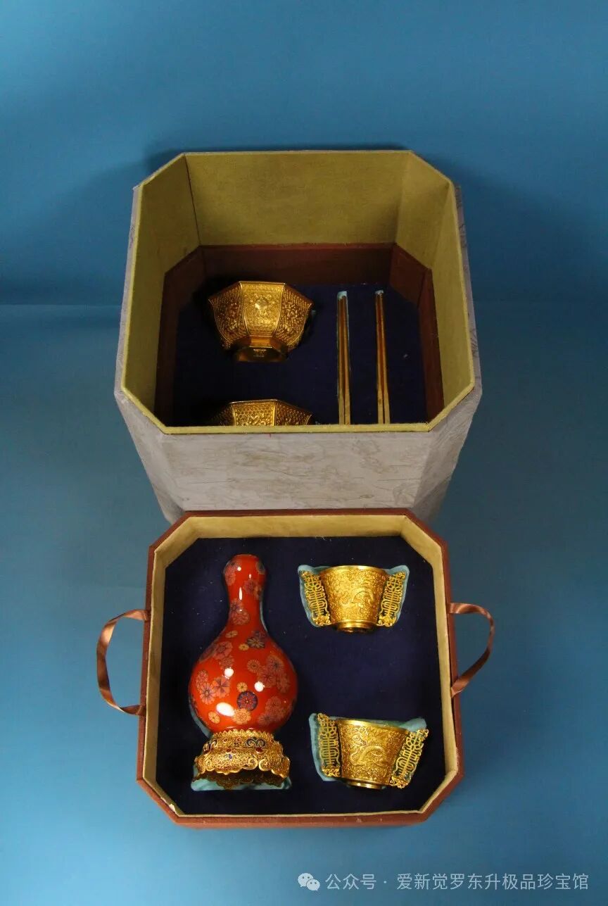 旧藏精品纯手工打造铜鎏金碗筷,杯子,瓷瓶一盒瓶高21.5厘米 底座直径8.5厘米 杯子高6厘米 长10.5厘米 口直径6.8厘米 碗高6厘米 口直径12厘米 筷子长24厘米 重2026克