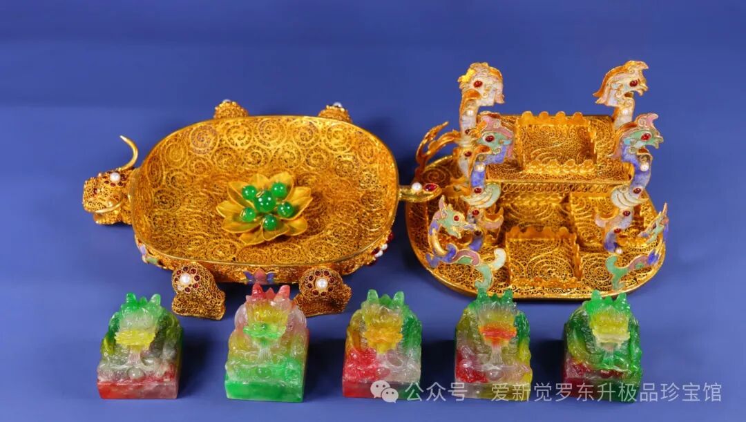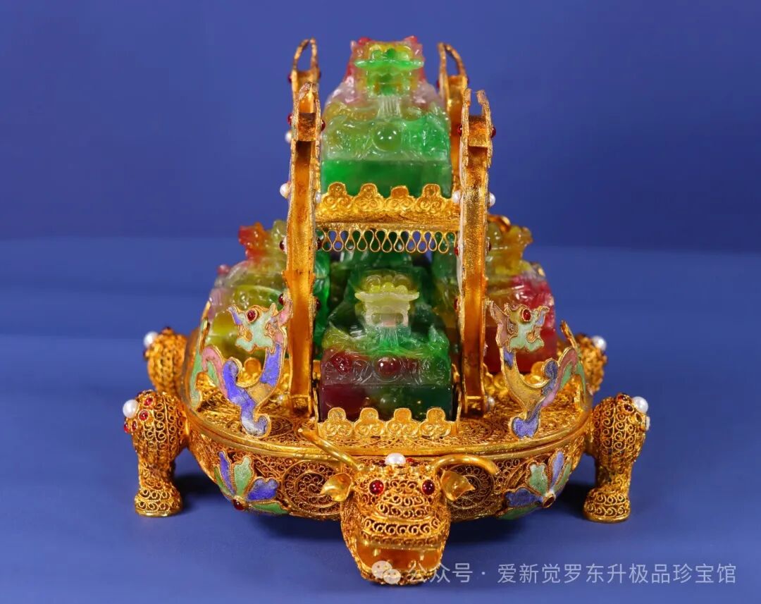 旧藏精品纯手工打造掐丝鎏金镶老翡翠印章一套高15厘米,长22厘米,宽16.5厘米,印章高5厘米,长宽4厘米,重1510克