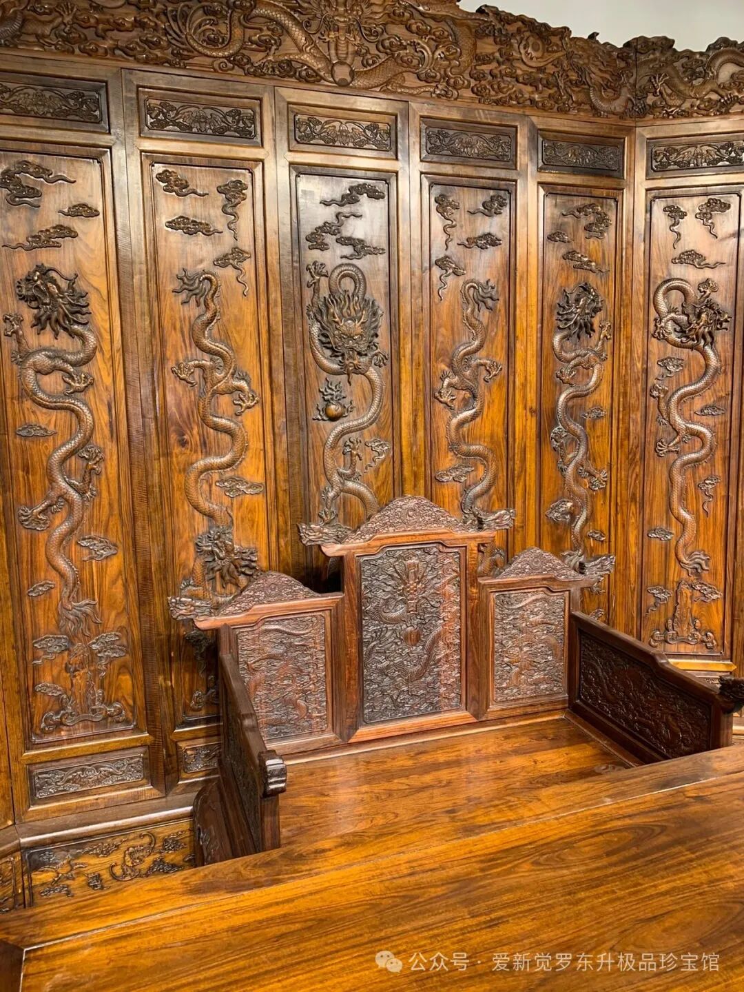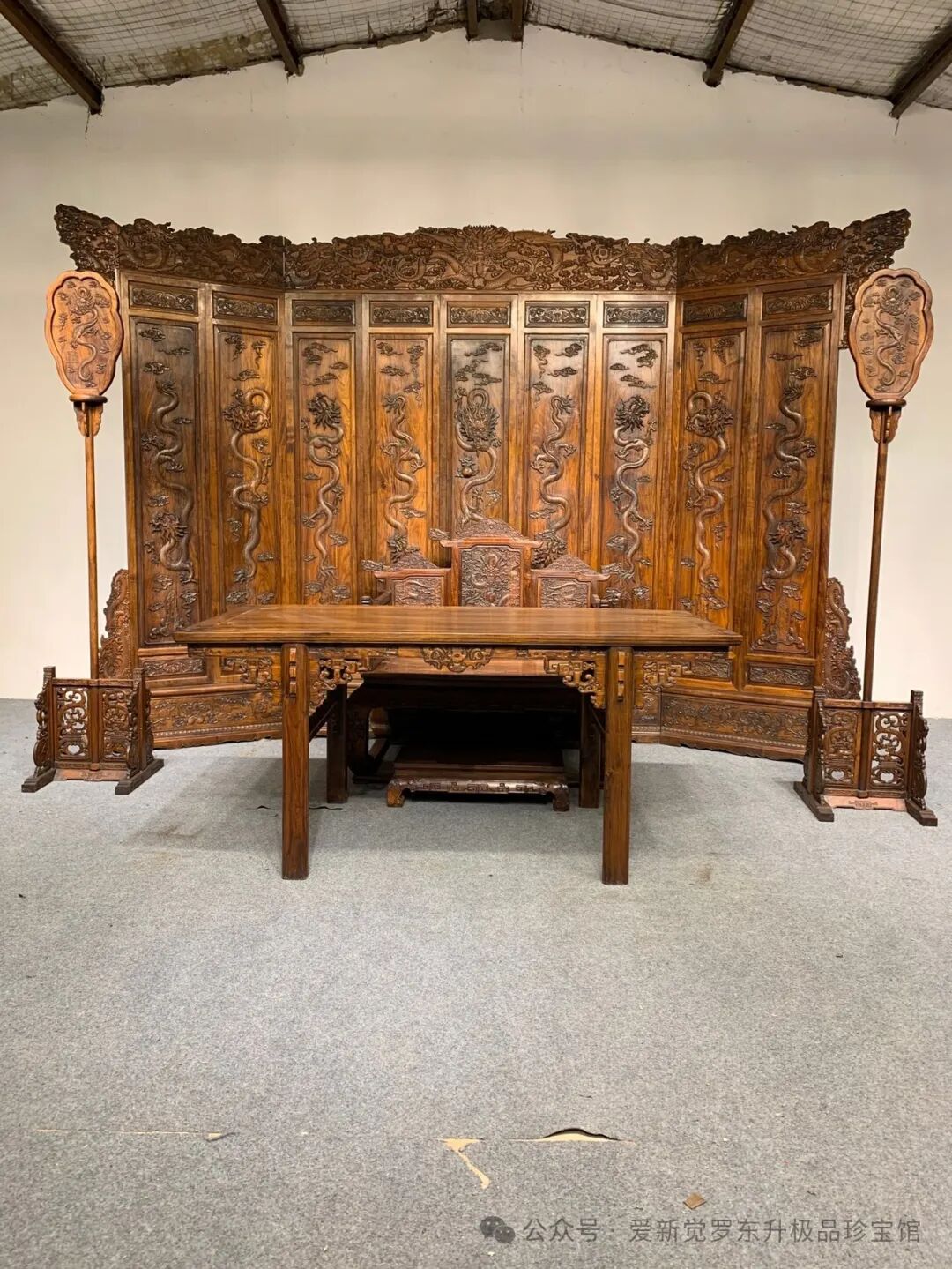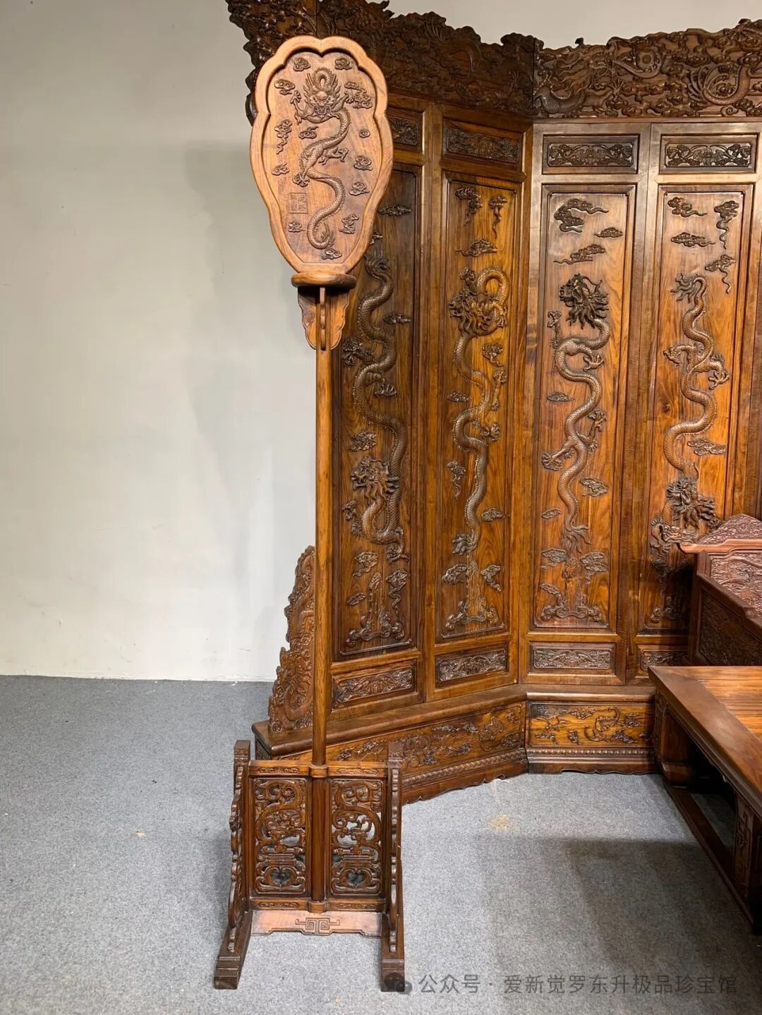 精品黄花梨木九龙屏风组合,高幅雕云龙工艺,彰显霸气!花纹漂亮工艺精湛细腻,此屏风乃皇家御用!至今保存完好!具有极高的收藏价值!尺寸屏风高265长4米画案长180宽90高82宝座长110宽70高118宫扇高215长43宽46