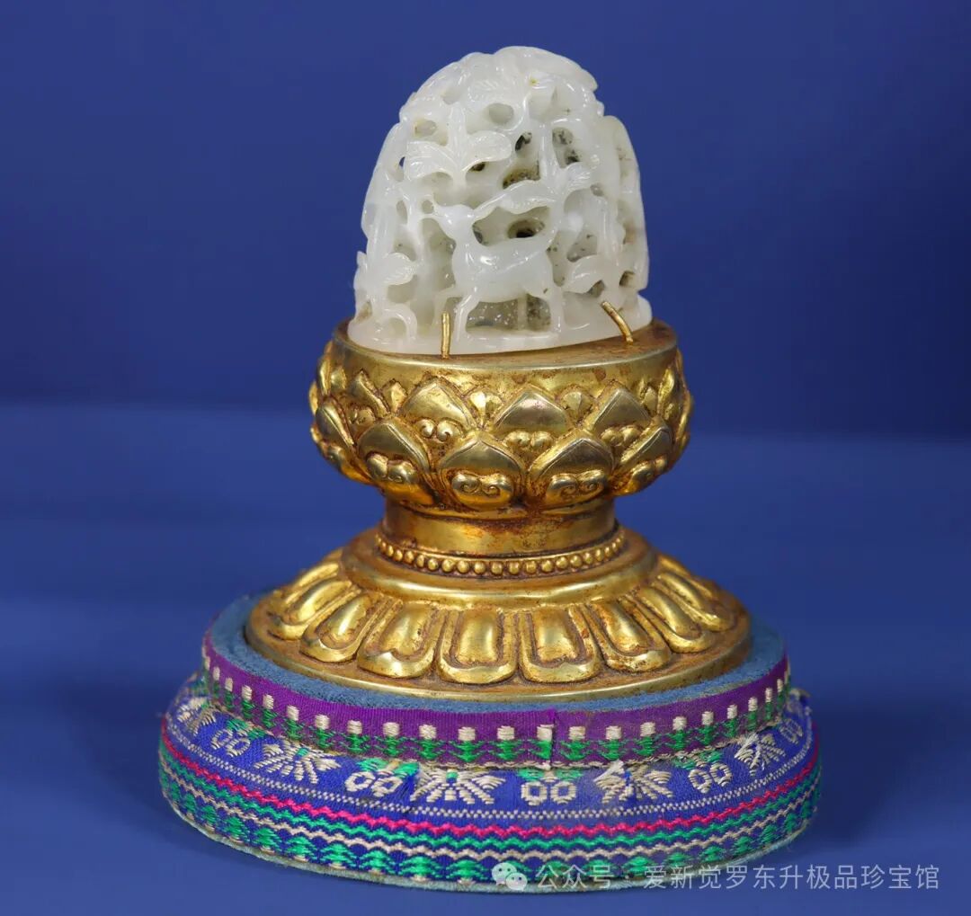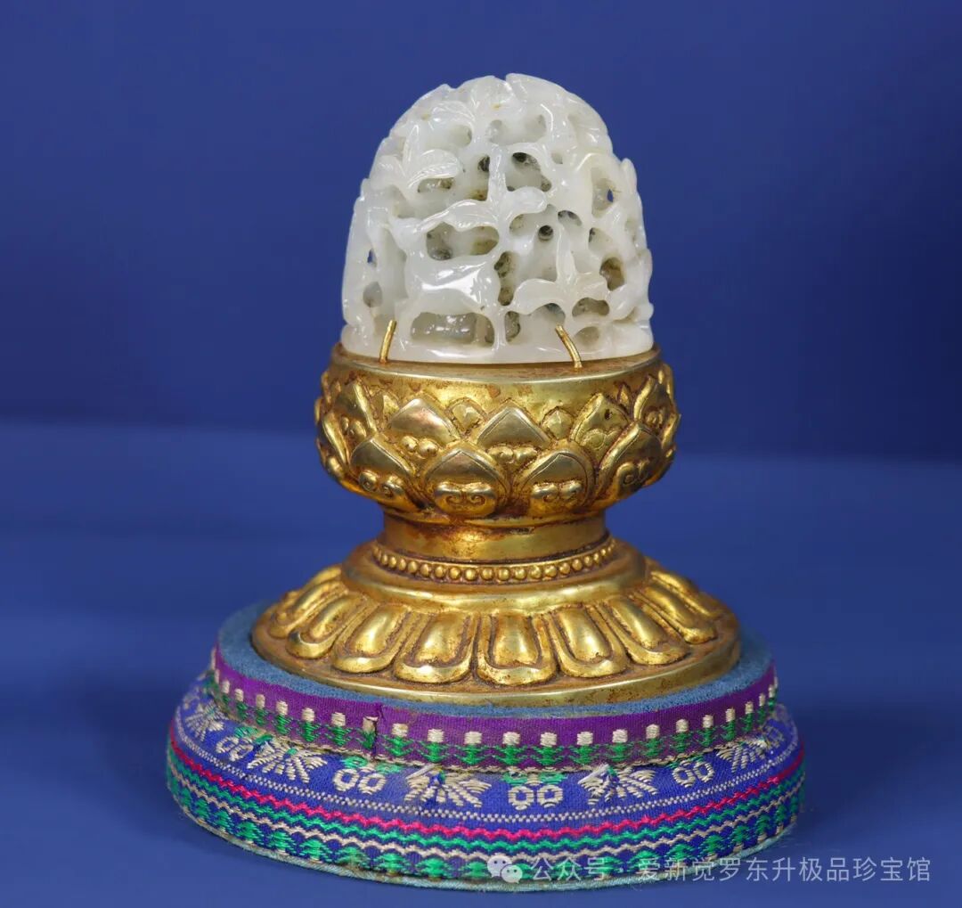 旧藏精品纯手工打造纯银鎏金镶和田玉摆件高10厘米,底座直径8.5厘米,重220克