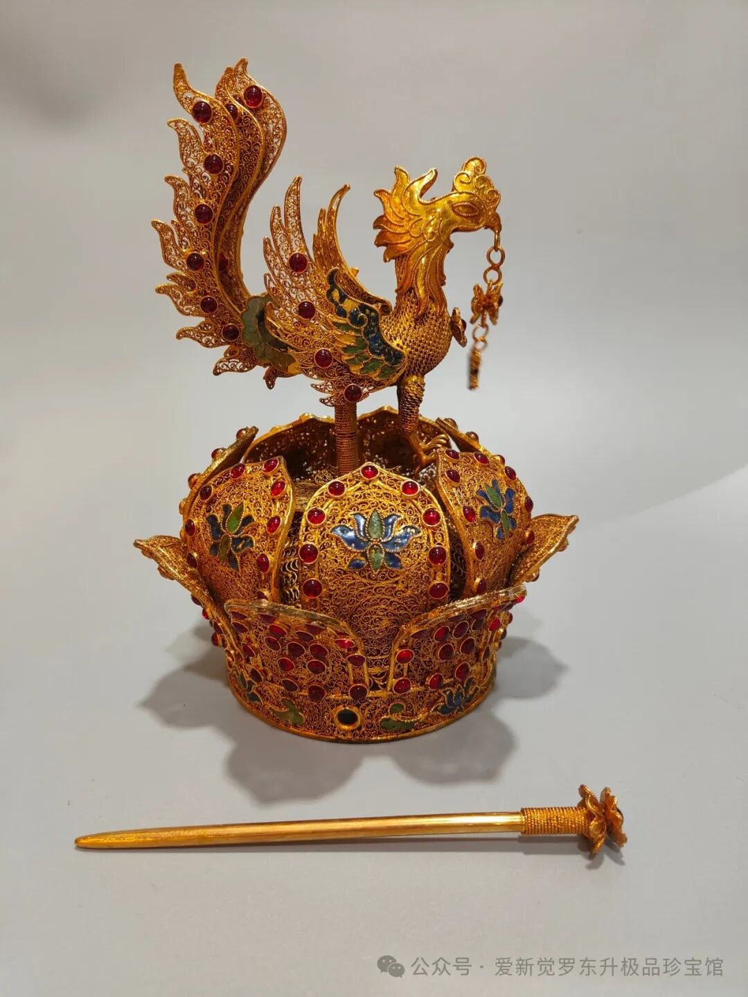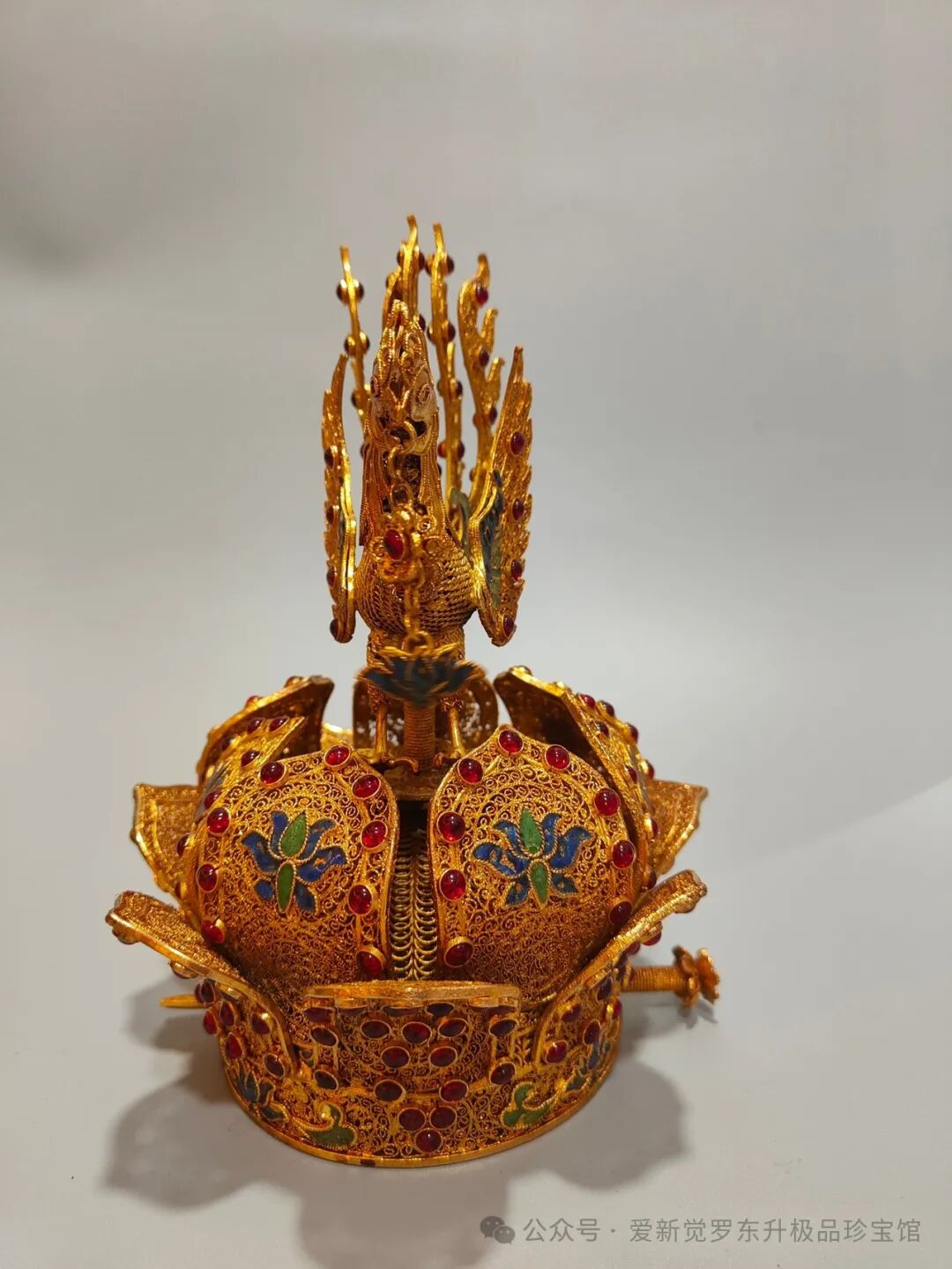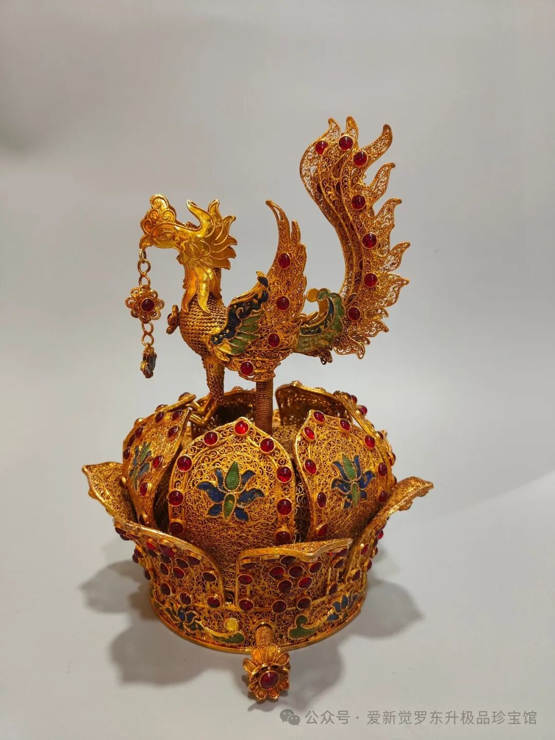 旧藏清代花丝鎏金镶嵌宝石凤帽单个重约780克,高21厘米,宽15厘米