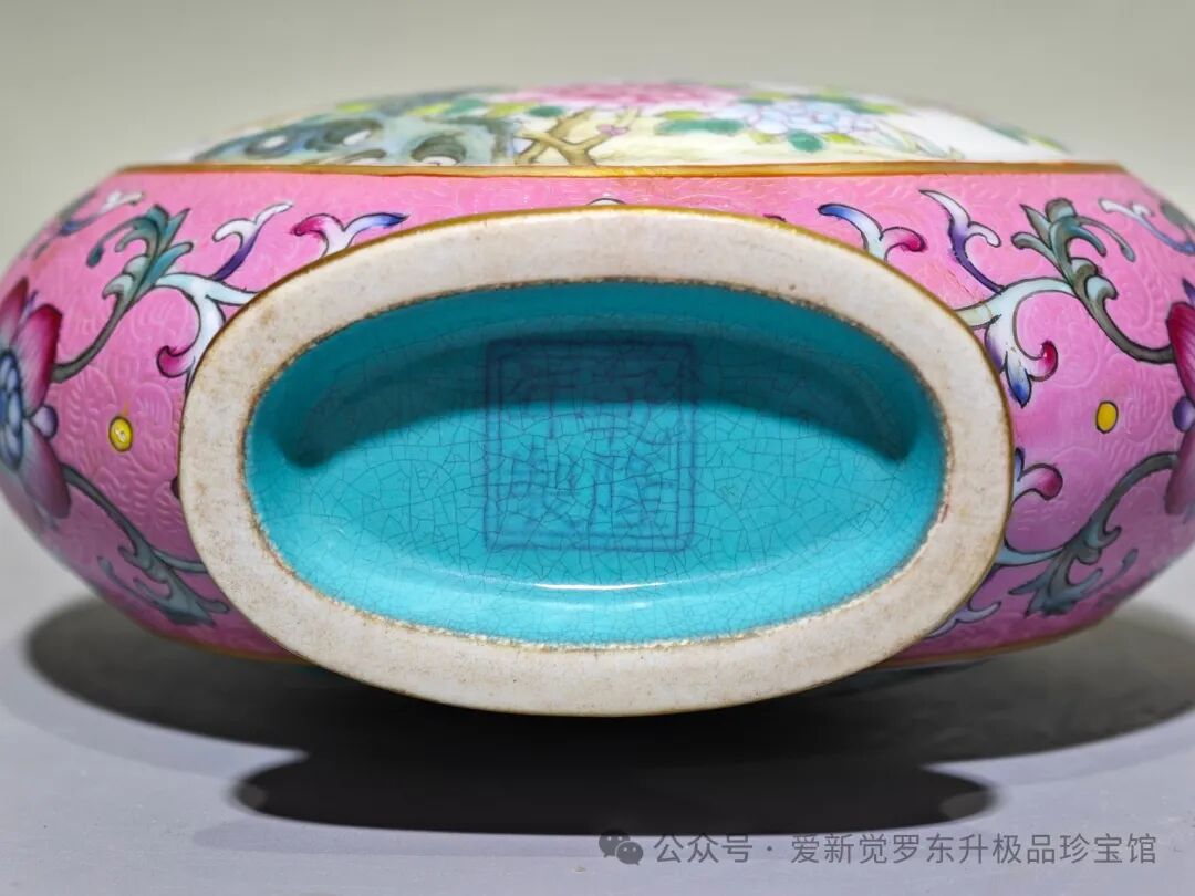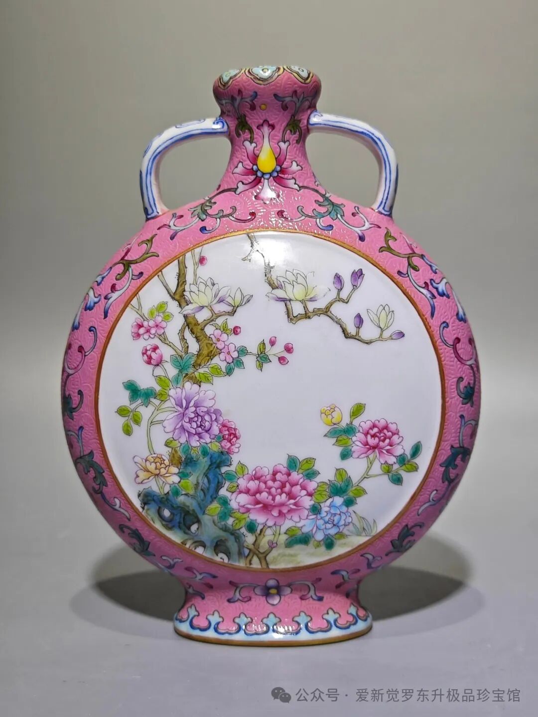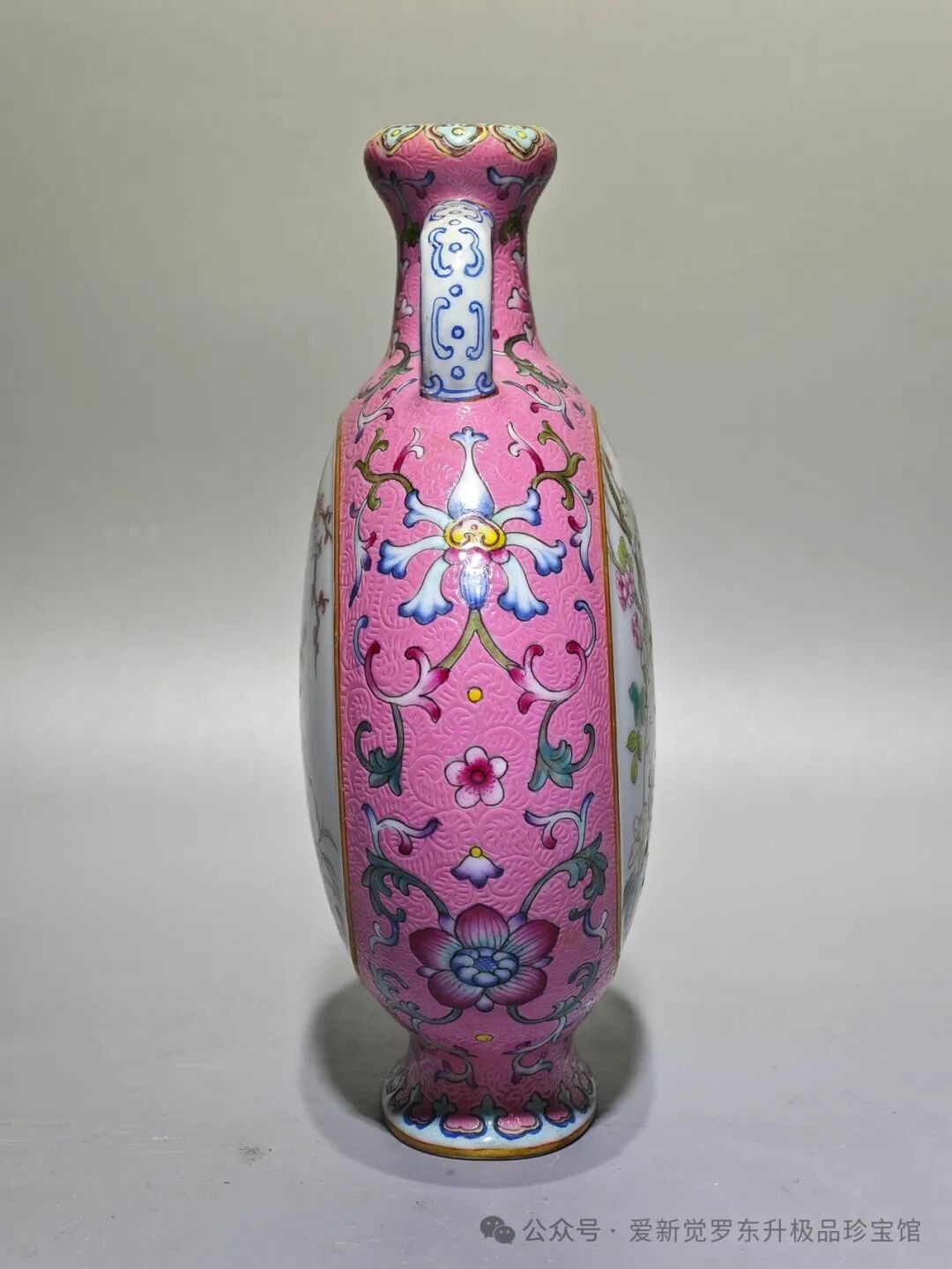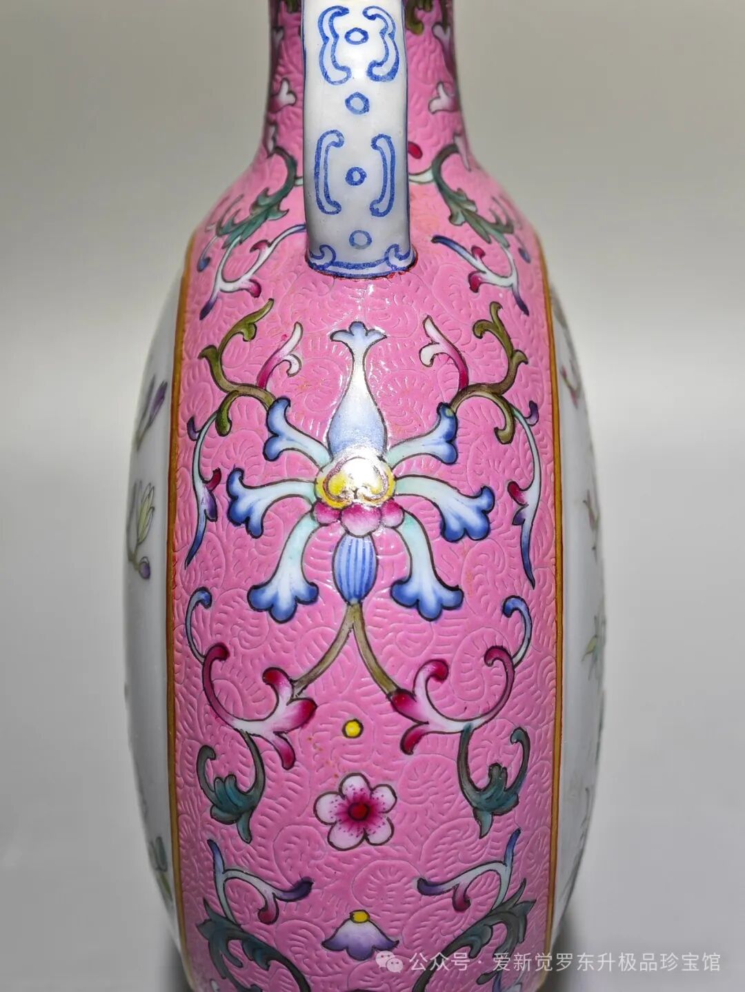 乾隆年制,珐琅彩胭脂红暗刻扒花福运连连开光花卉纹抱月瓶,高:16.8cm,宽:12.5cm