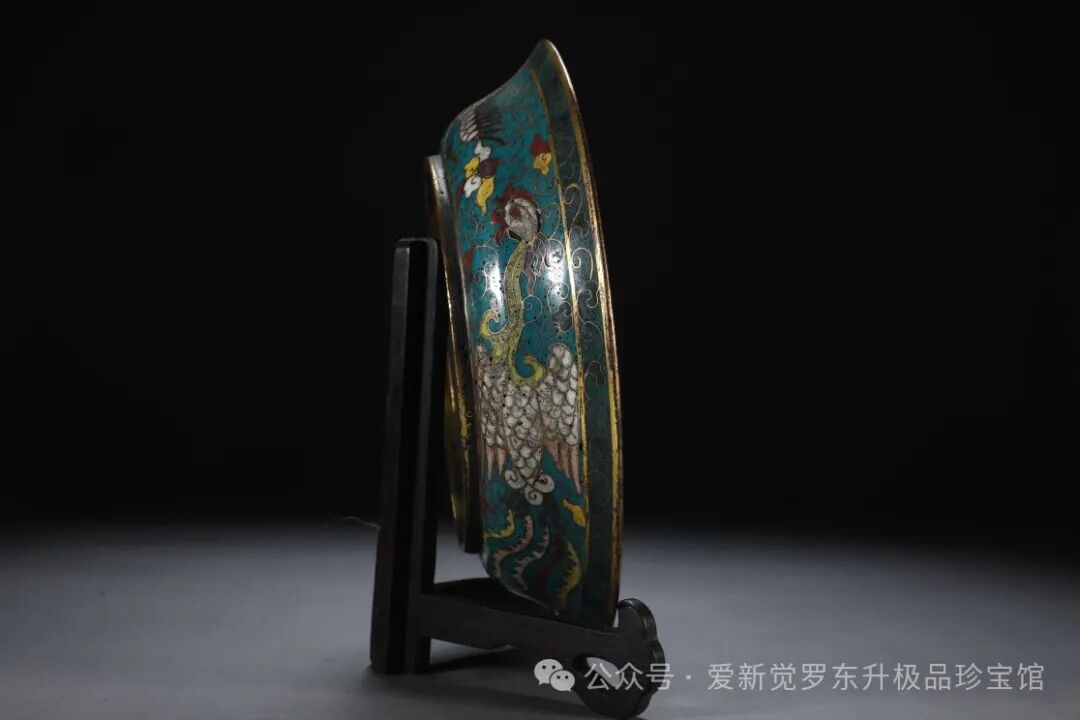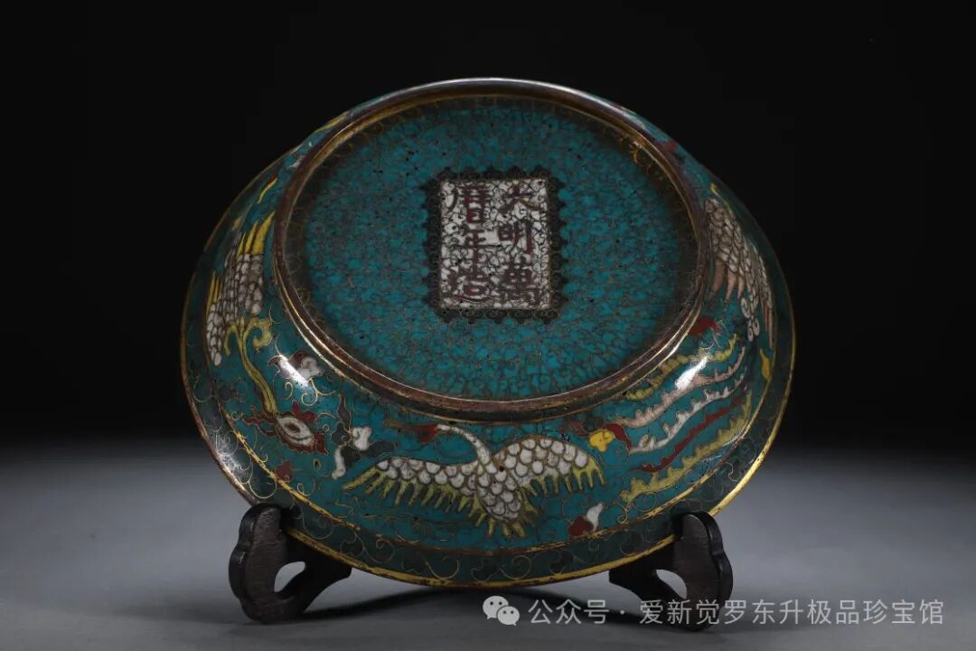清 铜胎景泰蓝掐丝珐琅腾龙纹盘【规格】高5.5cm 直径25cm 重1050克【款识】大明万历年造【详述】 铜盘广口,折沿,浅腹,弧壁,平底,圈足。通体施珐琅浅蓝色珐琅釉为地,盘心一圈鎏金弦纹做圆形开光,开光内以蓝、红、白、绿、黄等珐琅釉色掐饰腾龙纹,器壁内外掐饰飞凤、仙鹤纹饰。盘底部满饰祥云纹,层层叠叠,中央开窗,白地祥云纹,掐饰朱红楷书“大明万历年造”六字楷书款识。另盘口、足墙复饰以鎏金。全器纹饰疏密有度,清雅瑰丽,寓意吉祥美好。