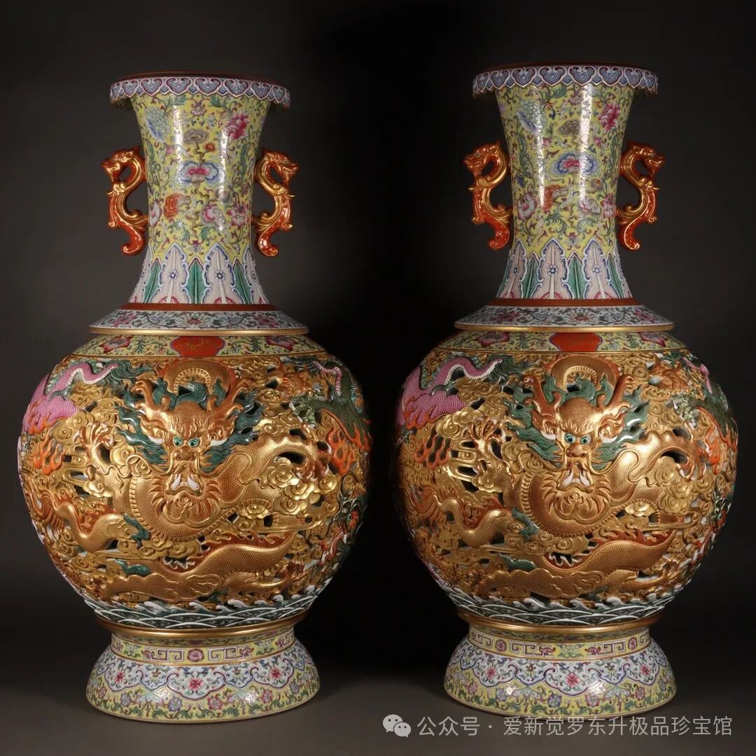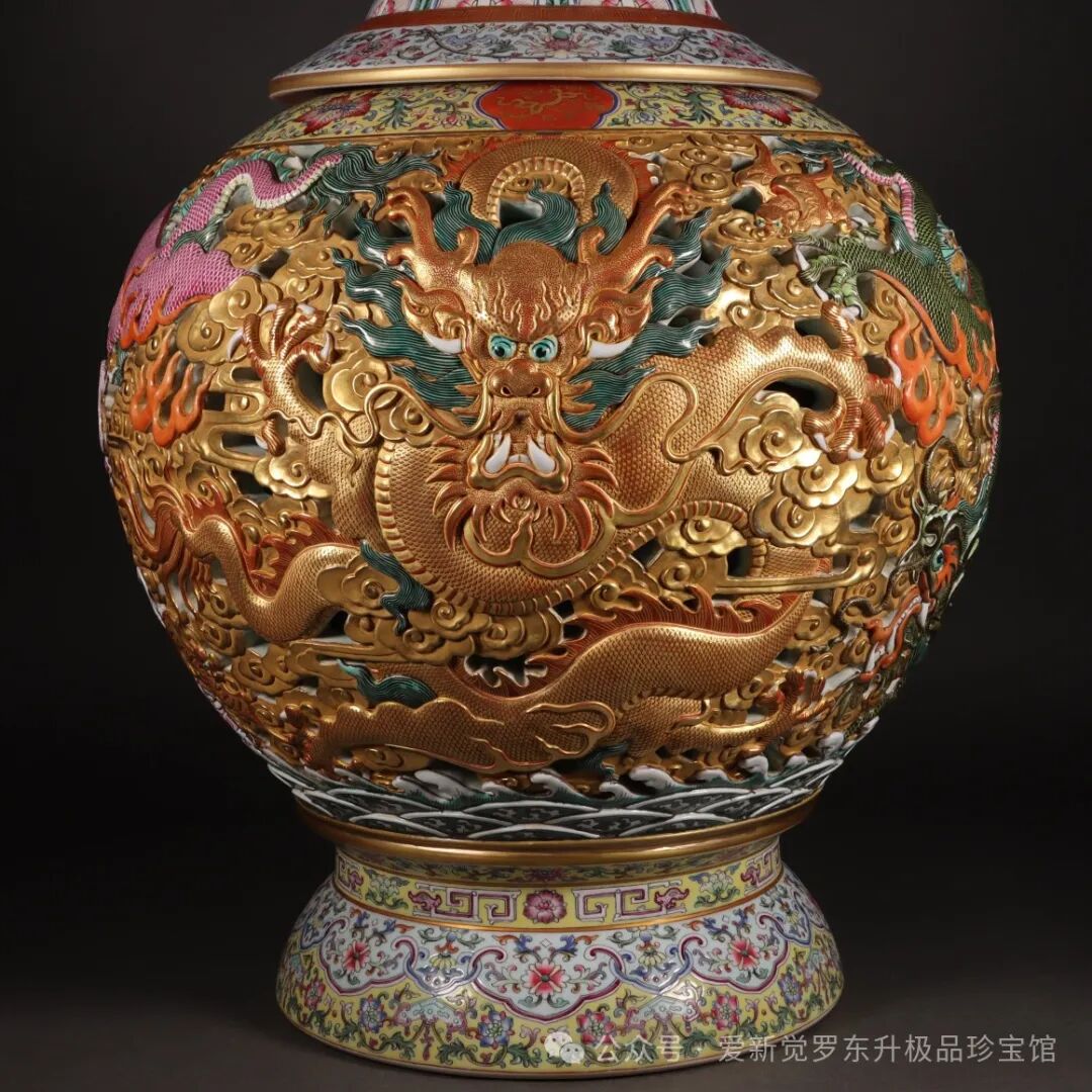 央视认为,艺术品市场之所以会迎来大牛市,主要有以下几个原因:首先,随着社会经济的发展和人们生活水平的提高,越来越多的人开始注重精神文化生活,艺术品市场也因此得到了更多的关注和支持。同时,随着互联网和移动互联网的普及,艺术品市场的交易和传播方式也在不断变化和创新,为投资者提供了更多的机会和选择。清 乾隆年制款,珐琅彩雕刻镂空龙纹转心瓶尺寸:高64.5cm口18cm肚37cm