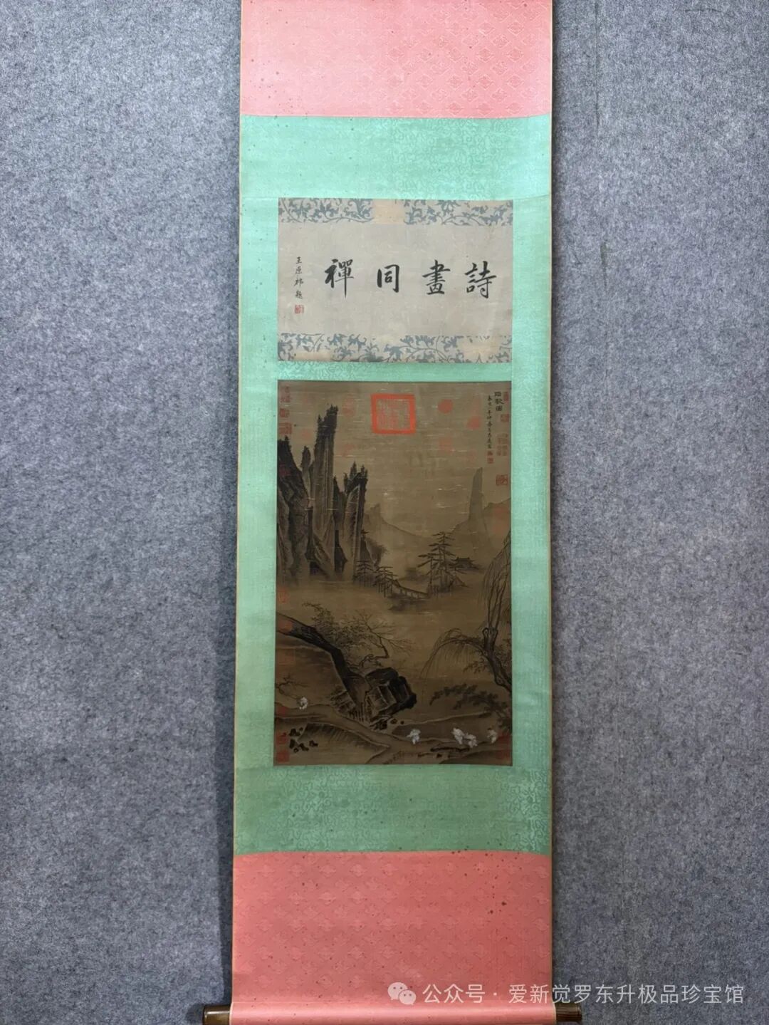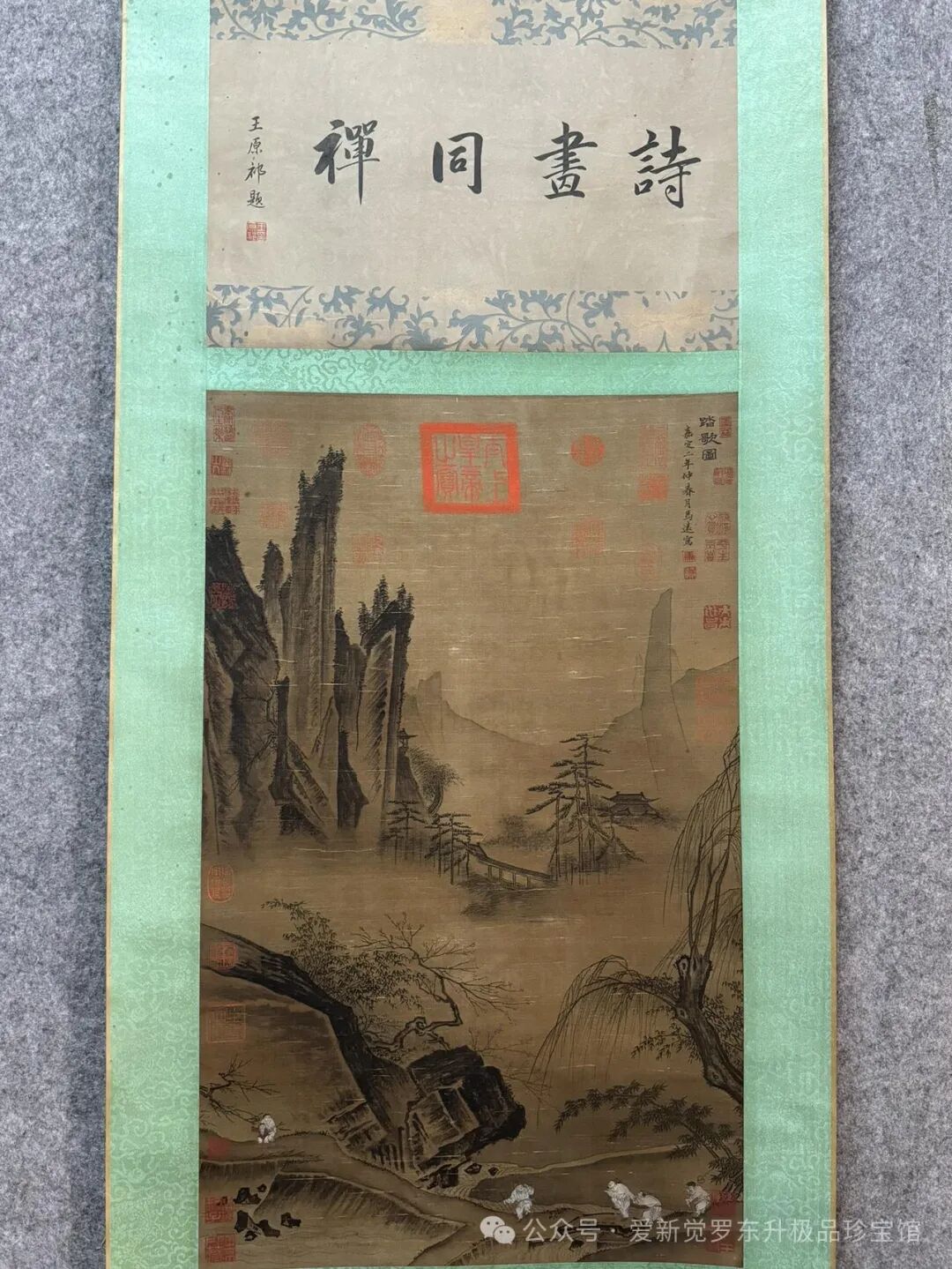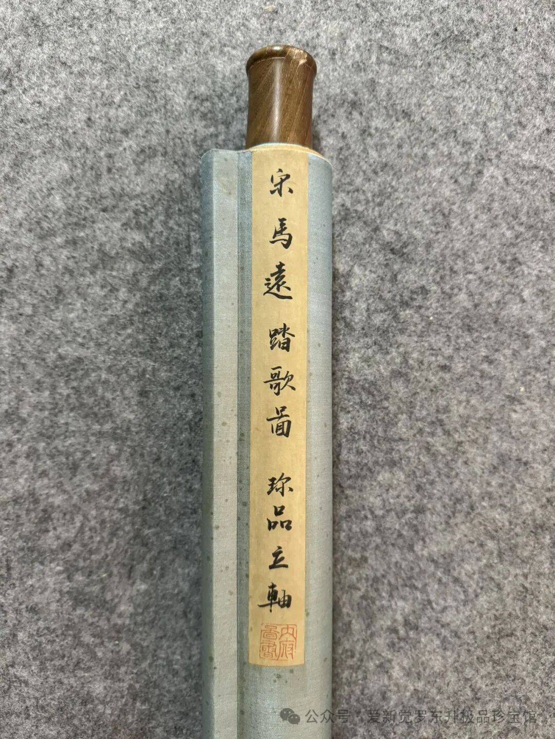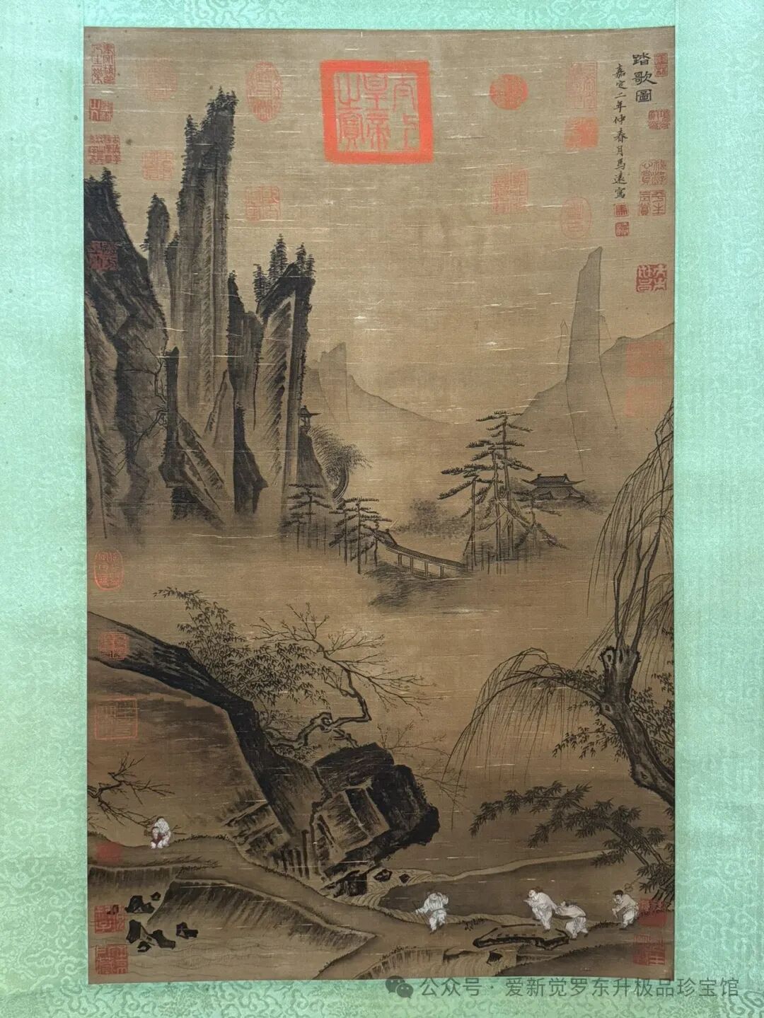 旧藏、宋代、马远精品绢本(踏歌图)规格:祠堂加画心总尺寸:43.5x105厘米。拍品介绍:此画实物拍摄,踏歌图。该图景色中山石、林泉、楼阁、人物尽有,整个画幅近景、中景和远景相互衔接,层层铺设,由近及远,虚实相间,开阔了然。近景中描绘一派田园风光,画面下部有两大巨石,田间阡陌中有六位农人似在酒后边踏边唱,一位长者在中间,其余分别位于两边,神态相异。(收藏最佳妙品)