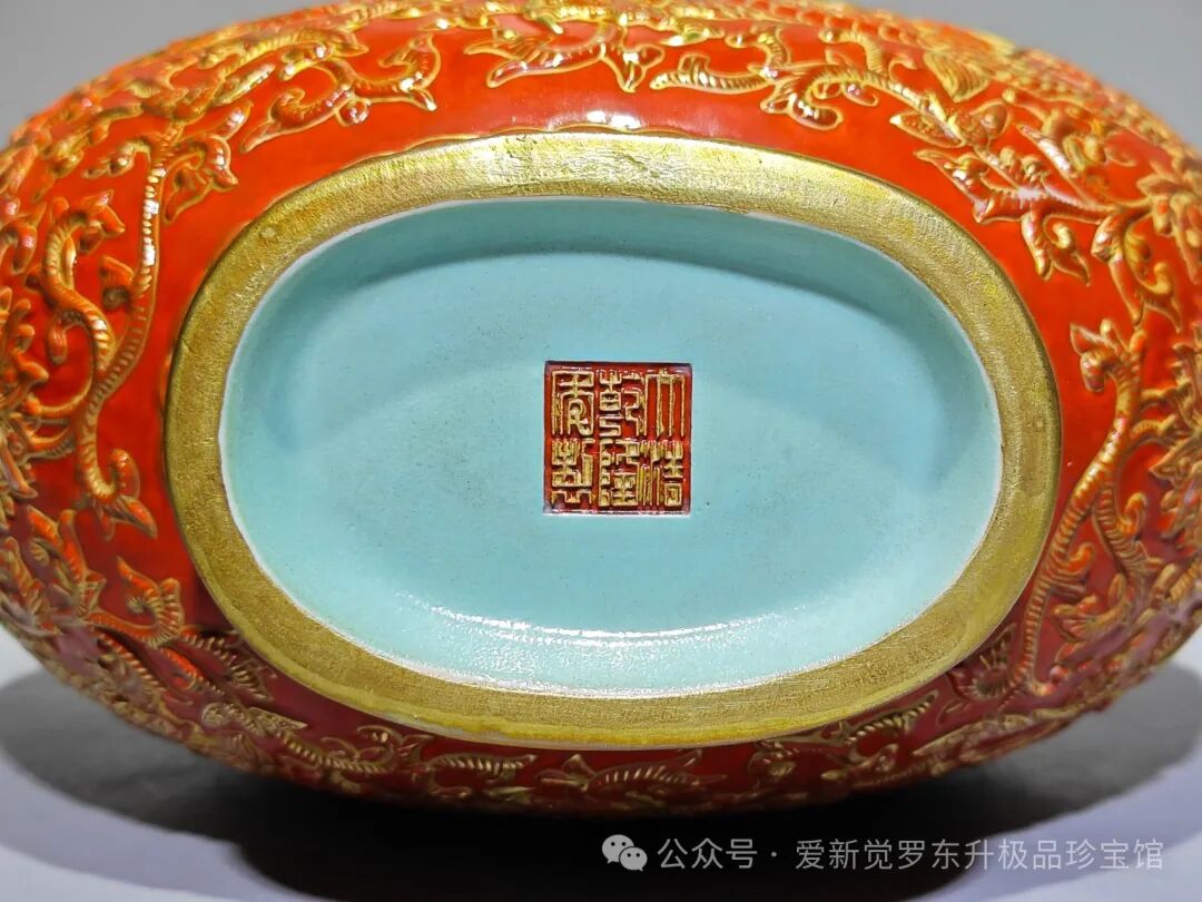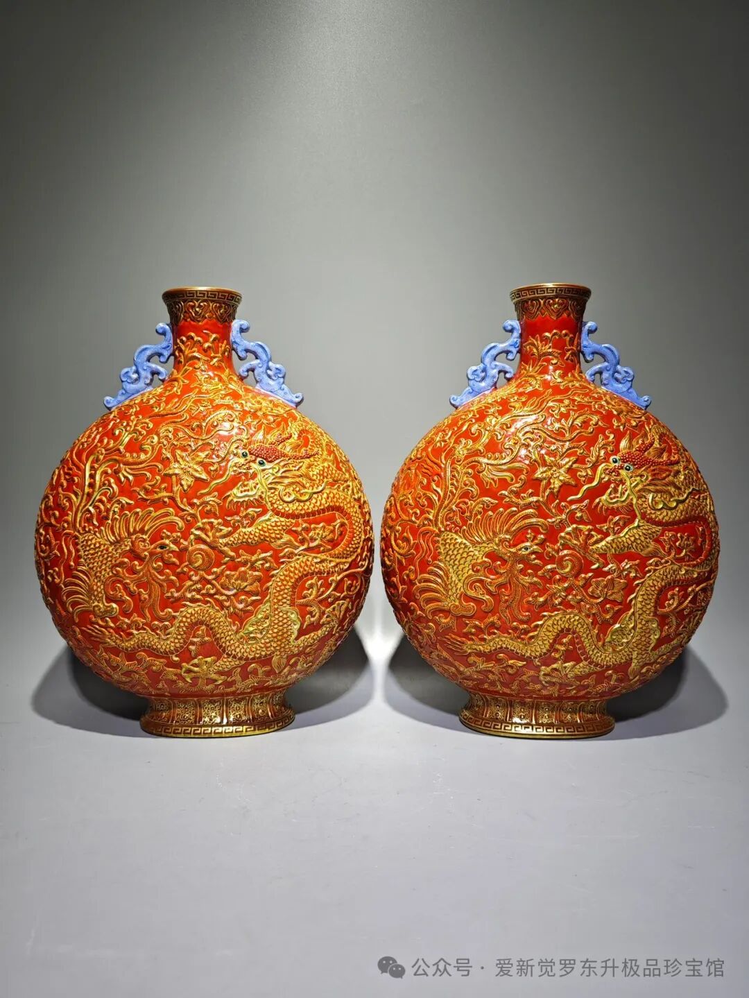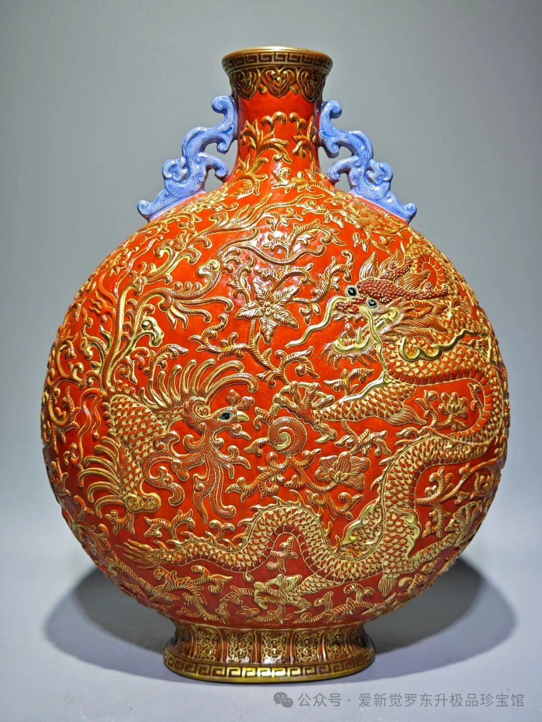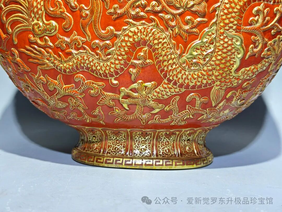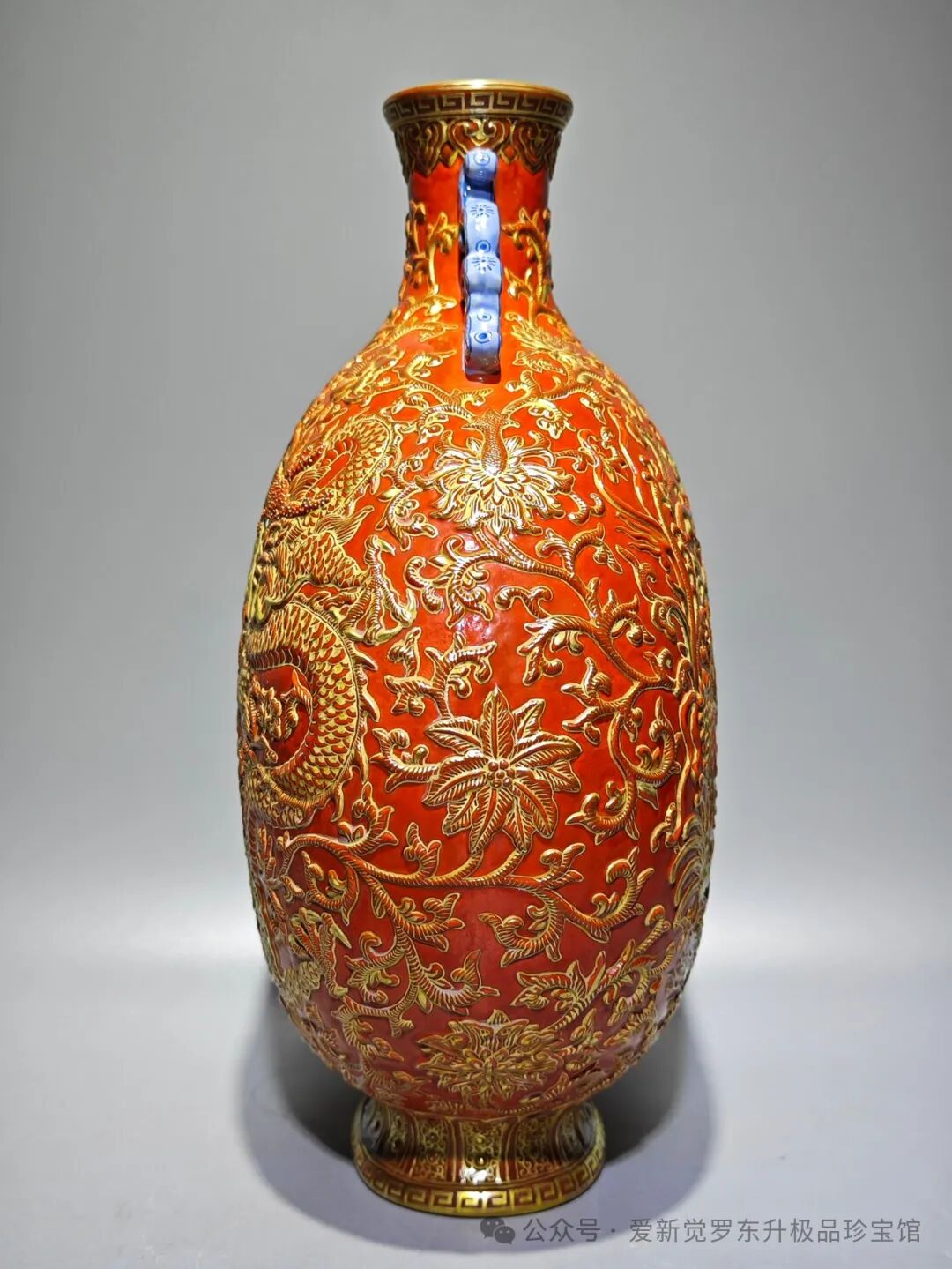大清乾隆年制,珊瑚红浮雕缠枝莲龙凤呈祥描金抱月瓶,高:32cm,宽:25cm