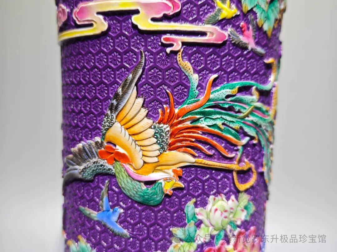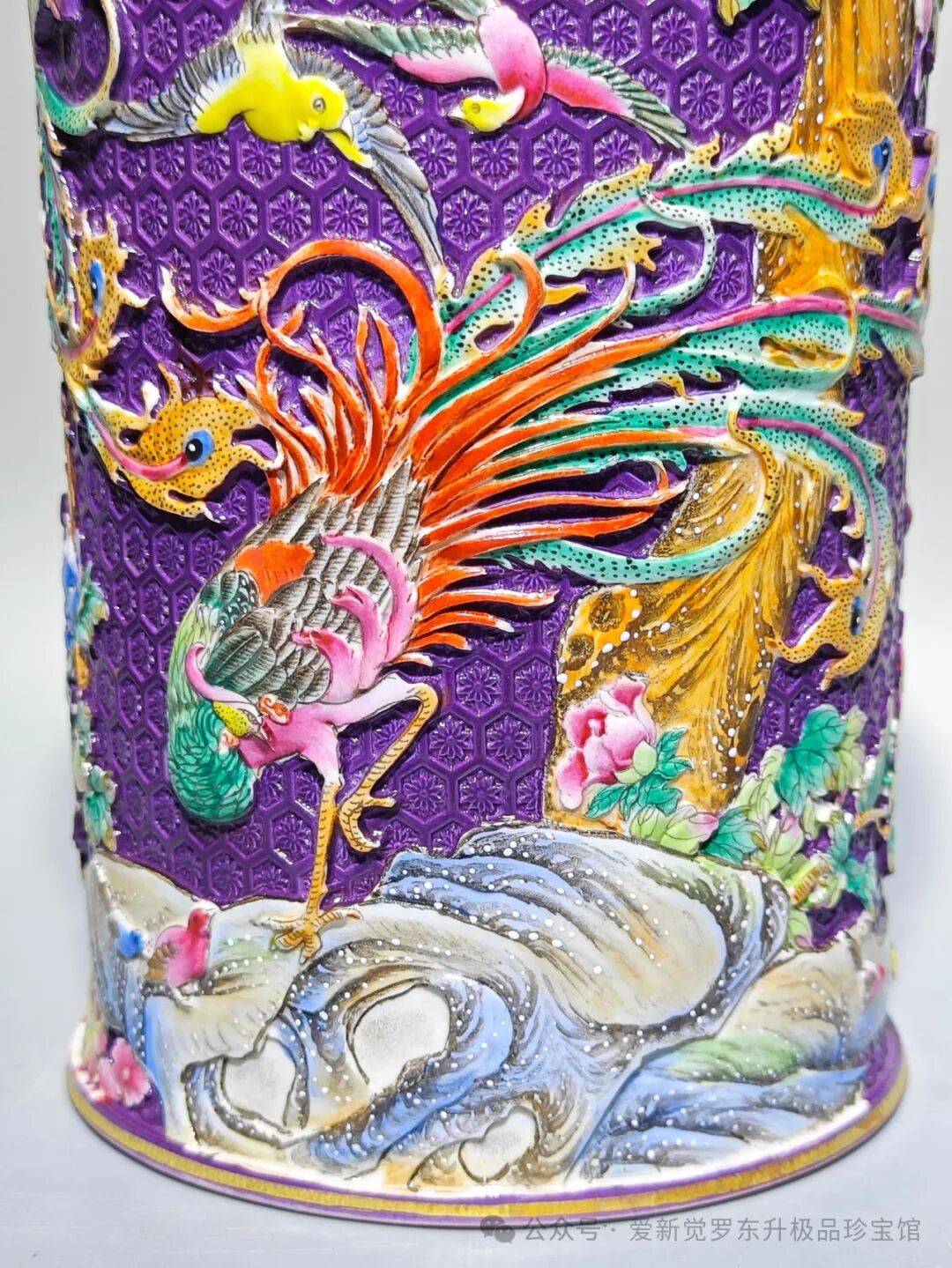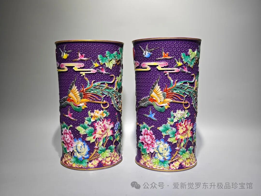 大清乾隆年制,珐琅彩浮雕百鸟朝凤冒筒,高:24.8cm,口径:13.9cm