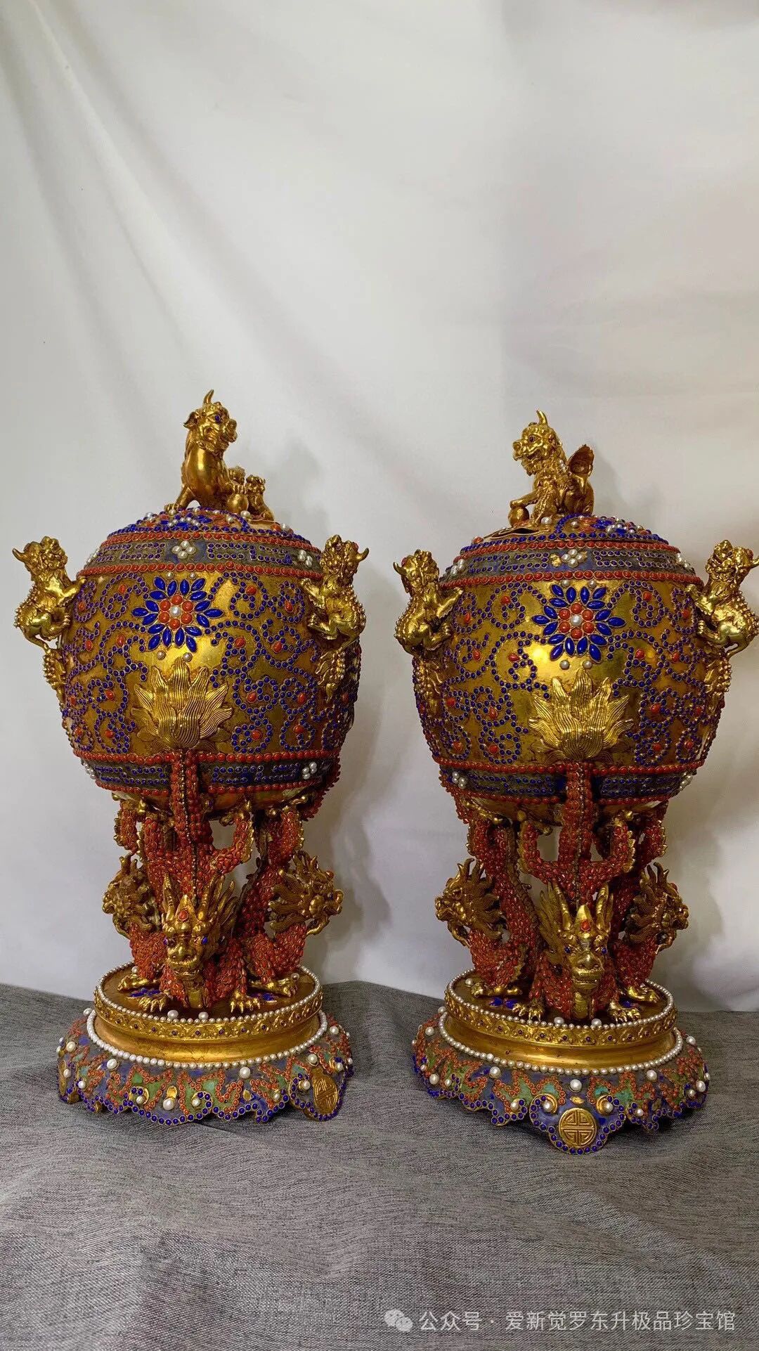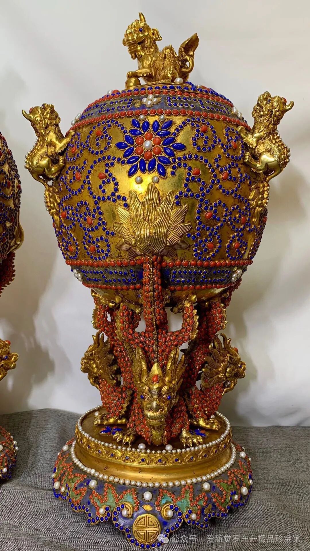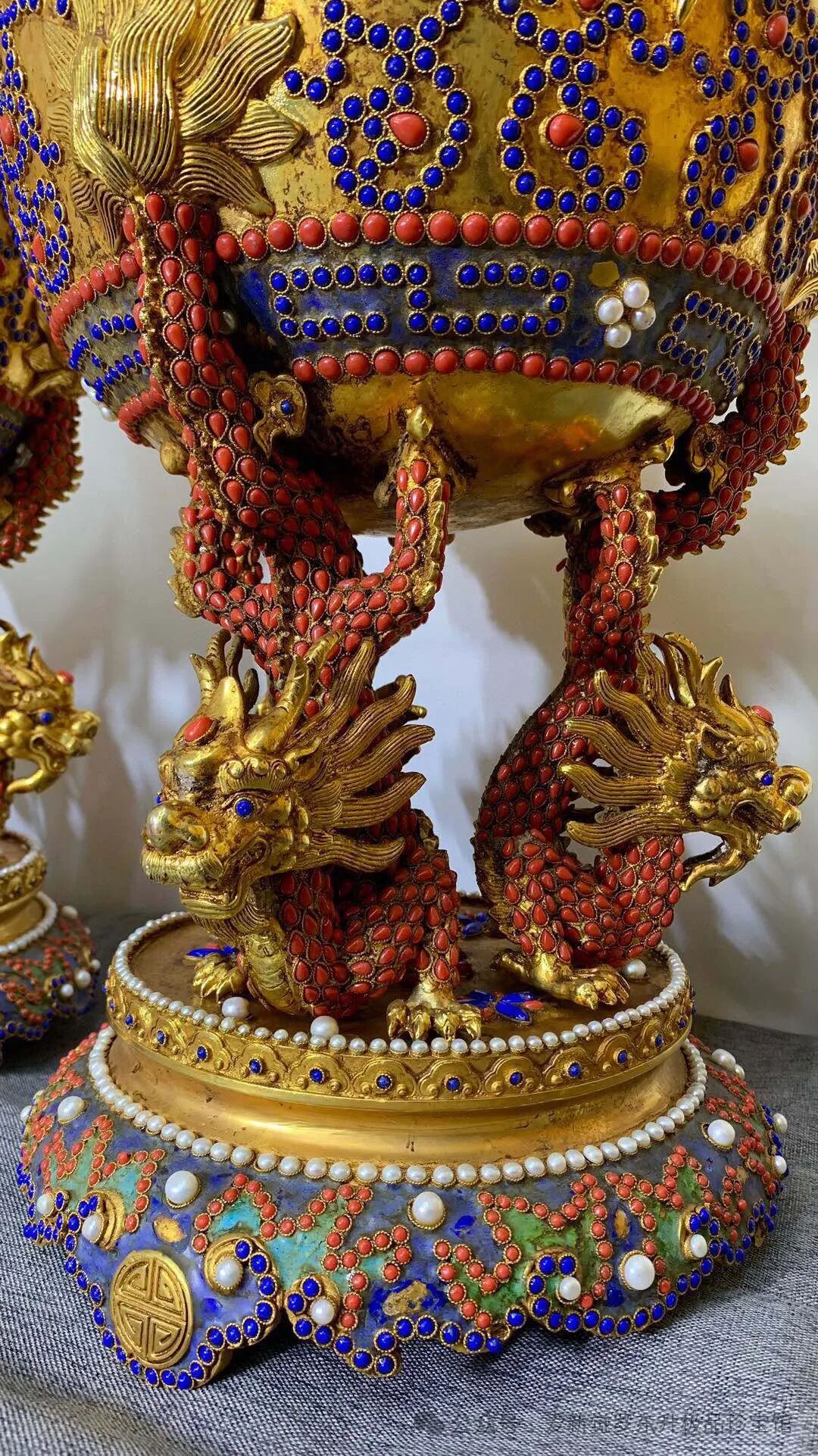 精工鎏金满镶嵌天然珍珠、珊瑚、松石、青金石【神龙炉】一对高60cm 宽30cm一对重50斤