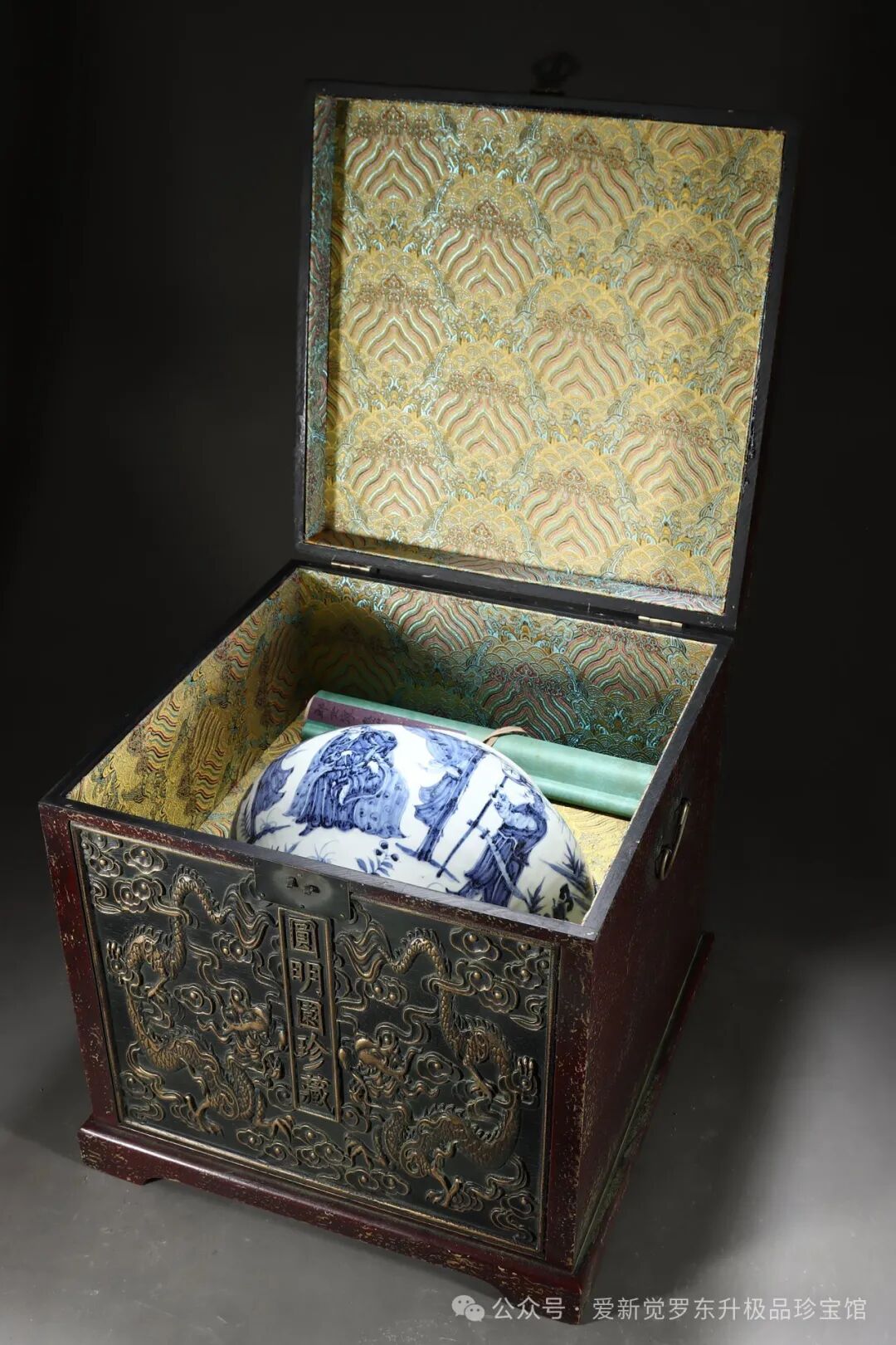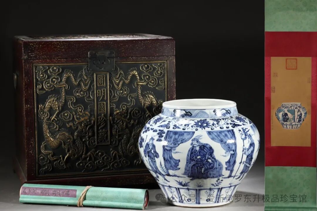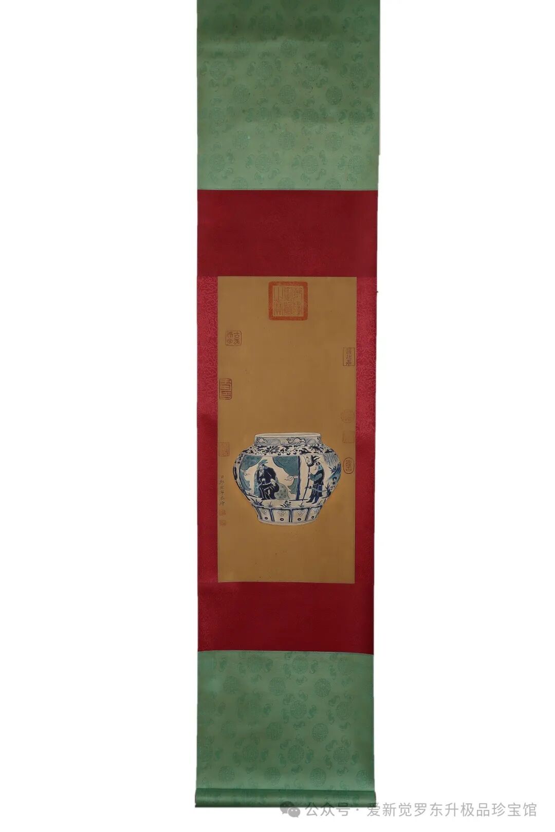 清代-郎世宁-精品绢本元青花人物故事罐-字画画心尺寸27.5x58厘米;瓷器高28厘米,腹径32厘米