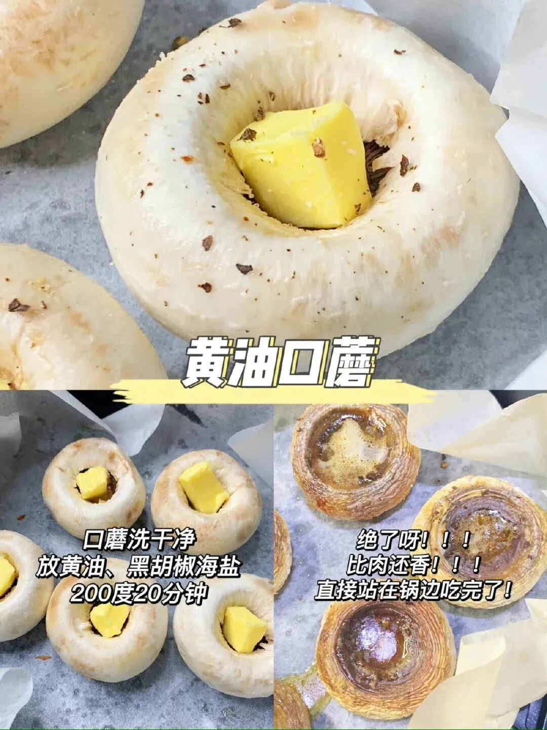食材:口蘑、黄油、海盐。口蘑裹好调味料之后直接放入空气炸锅~