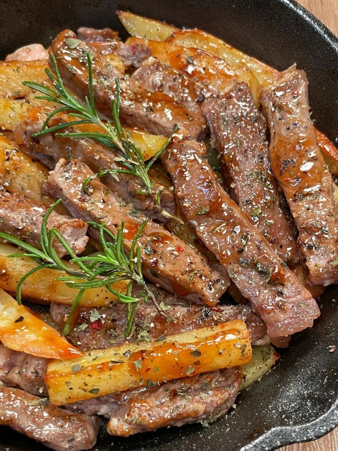 牛排切成条加入一勺生抽、一勺食用油、一勺蚝油、适量黑胡椒、腌制15分钟;土豆切成条,牛排和土豆一起放入空气炸锅180度10分钟,翻面,撒上黑胡椒碎,或者刷点黑胡椒酱更好吃啦,继续烤8分钟左右即可~