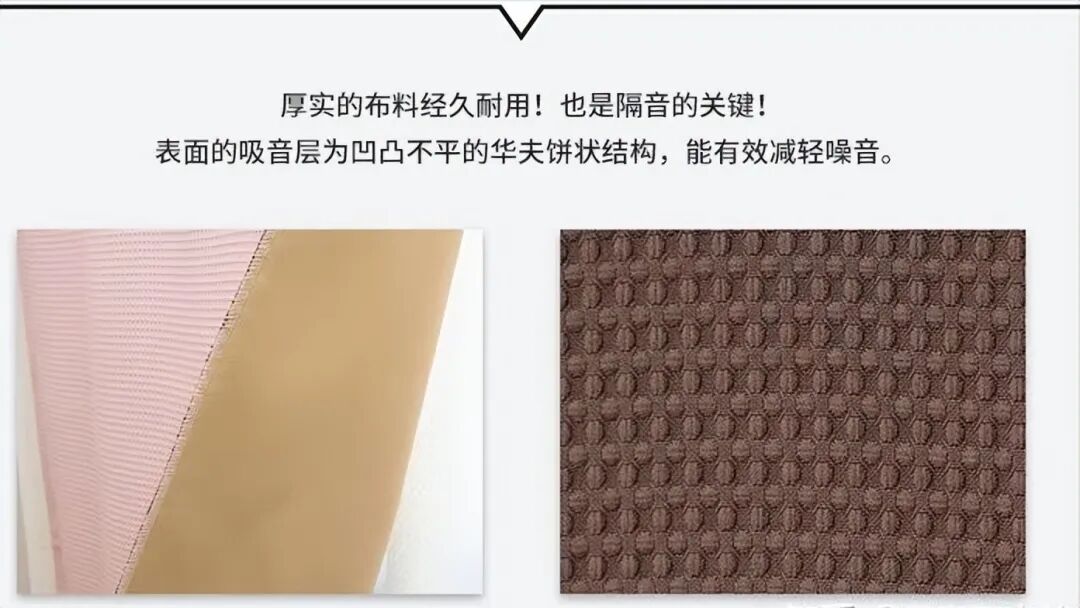⑥面料纹理隔音性能对比:华夫格>平纹织物>斜纹织物>缎纹织物。华夫格因为凹凸有致,立体感强,其声波在织物中线路中变得更长,声耗也更多,这样隔音性能也就更好。