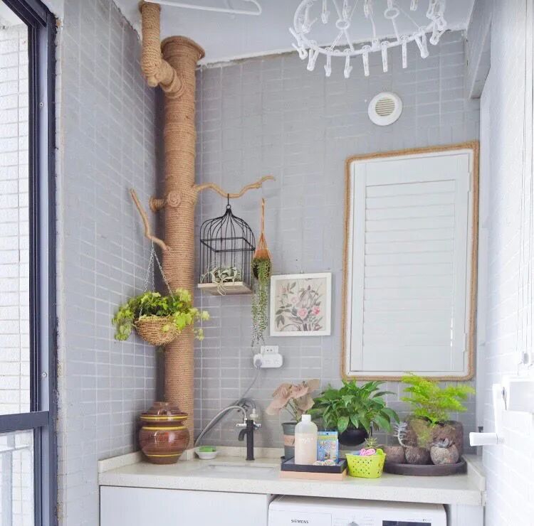 这家神仙设计,看到第一眼就忍不住想要点赞!用麻线缠下水管道的创意太好了,遮掉了丑陋的下水管道不说,整个阳台一下就有了生机。