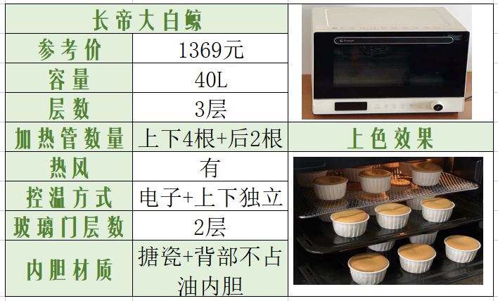 长帝大白鲸这款也是40升风炉烤箱,同样的搪瓷内胆、双层玻璃门、上下独立控温以及超强的热风循环。