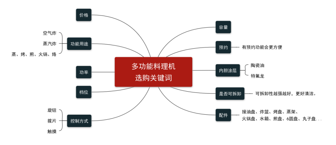 多功能料理锅的选购主要从价格、功率、功能、内胆涂层、是否可拆卸、配件等多方面作参考,如图示: