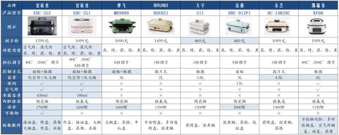 拿捏了选购要点的你是不是已经磨刀霍霍了?这里挑了摩飞、Bruno、宜盾普、法格、大宇、东芝、凯瑞客7个品牌的爆款进行对比横测,基础情况表格已经列出: