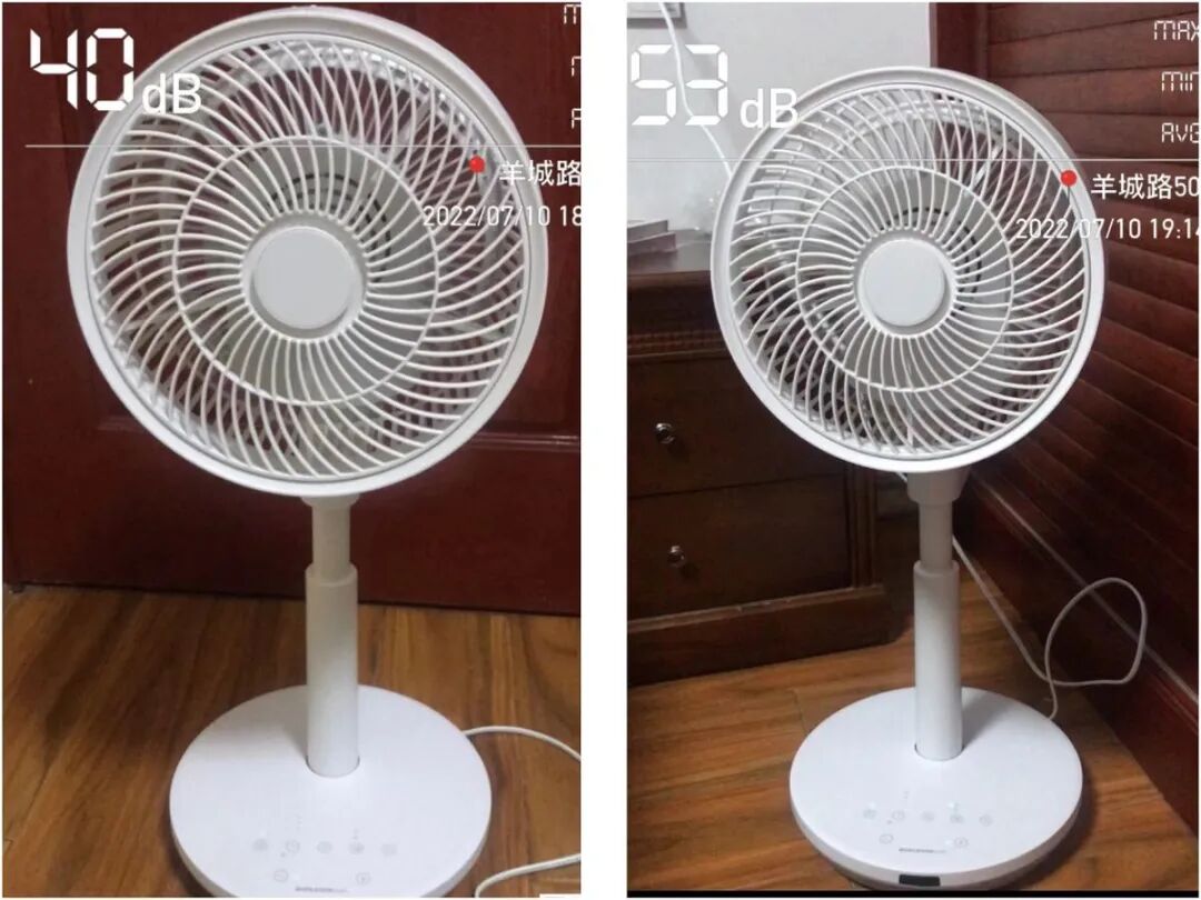 我下午在家测噪音,室内噪音平均30-40的情况下, 开风扇后最低档到最高档噪音在40-53dB之间,距离稍微远一些,坐在沙发上的时候,风扇几乎就是静音状态!很符合我的预期。