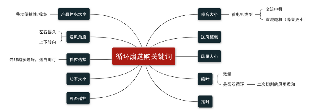 关于空气循环扇的选购要点,网上测评很多,专业术语也是看得人头皮发麻,这里就一张图给你们画明白: