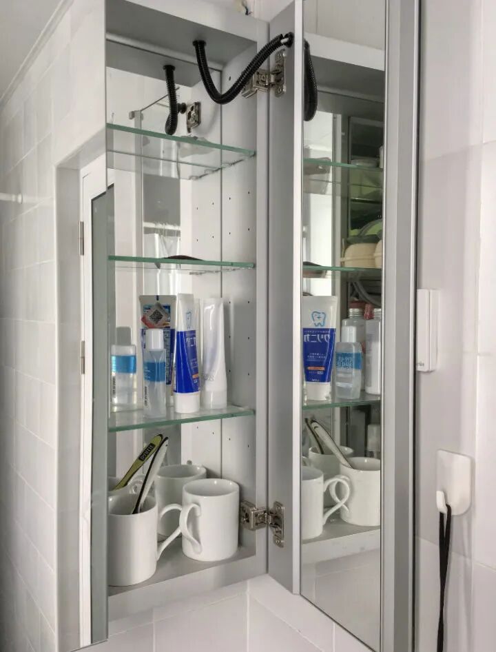 可以把不常用的放小门后面,对近视眼格外友好,再也不用费劲伸着脖子照镜子了。这都是使用时才发现的~镜柜里装了插座,可以给电动牙刷和剃须刀充电这个超棒的!