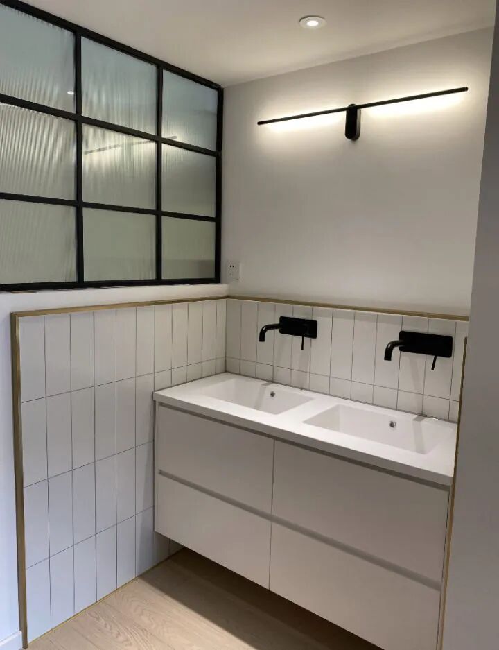 下水管入墙看起来干净整洁,还有,如果台盆下面不需要储物,裸露的墙排下水管记得换成金属材质垂直样式的,更好看。