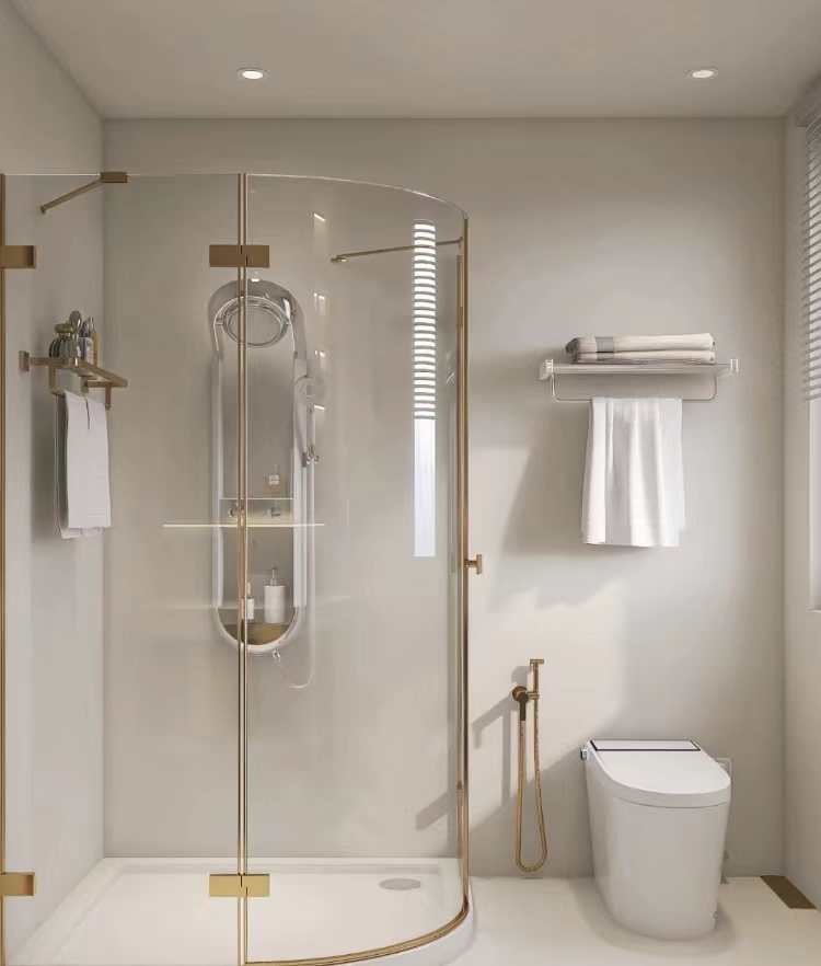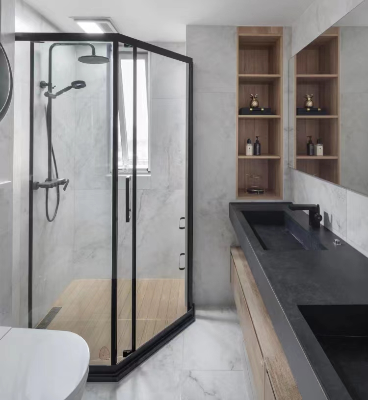 洗手间的淋浴外还是要做隔断。不能图省事拉一个浴帘了事,实际很不 方便,水流满地。