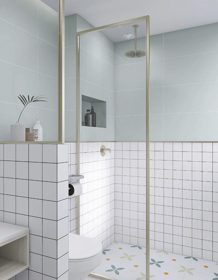 卫生间淋浴房的区域,一定不选马赛克小瓷砖。虽然这种小瓷砖单片很便宜,但是整个卫生间的面积算下来价格依旧很可观的。且不说马赛克铺贴非常考验贴砖师傅的手艺,后期的铺贴费用都能贵到你怀疑人生。