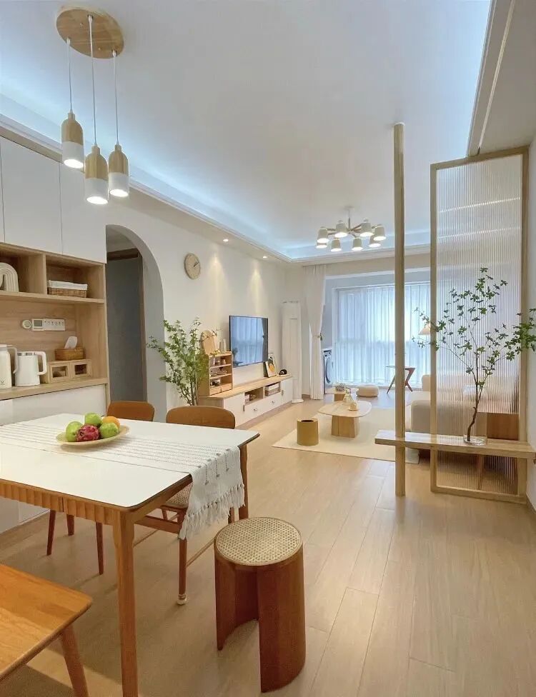 不装开口朝上的吊灯和水晶灯,用不了多久,里面就会落入灰,打扫起来真的要命,不如做简单的双眼皮吊顶,搭配无主灯,空间瞬间通透。