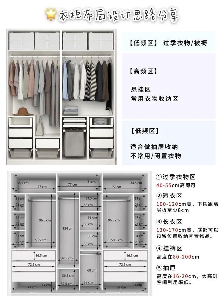 ②衣柜小或者衣服很多的话,就需要选多一些折叠收纳区的衣柜了。根据季节变化,家里衣服收纳需求有变动,可以选择带有活动隔板的衣柜,方便根据需求调整高度或增加衣柜配件。