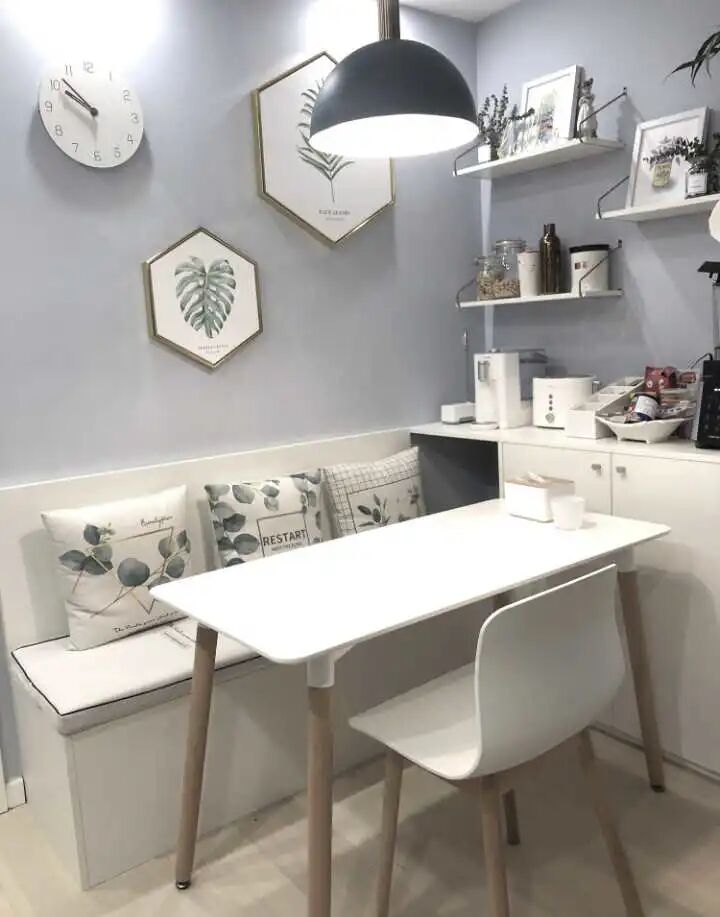 把靠墙边一侧的椅子设计成贴墙的柜子。满足吃饭时就坐需要还能收纳些不常用的物品。